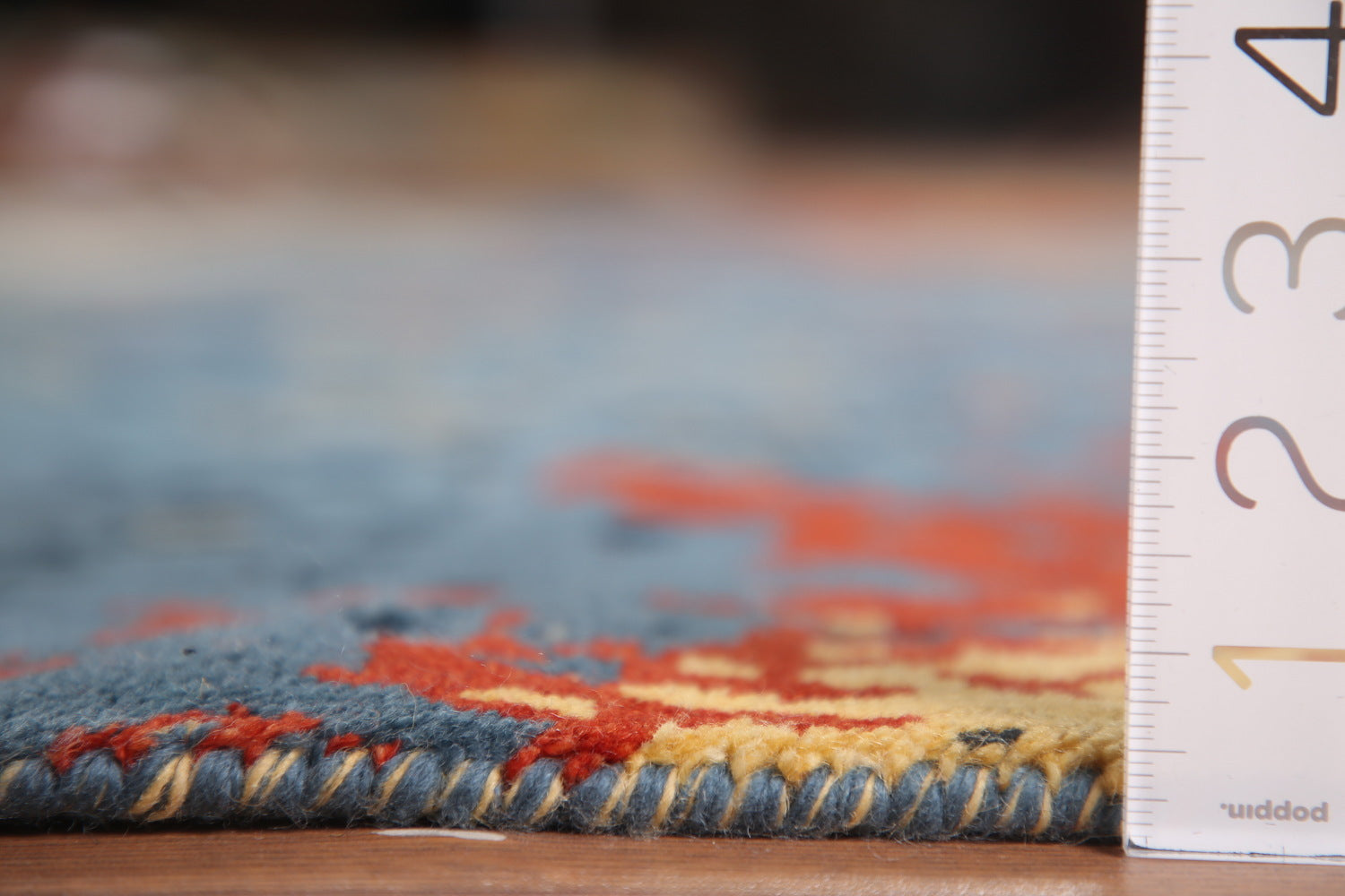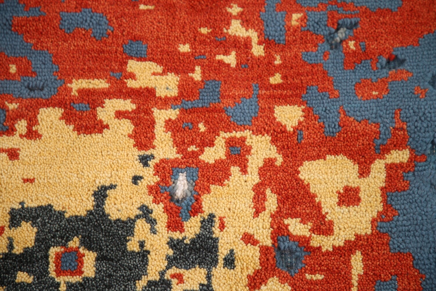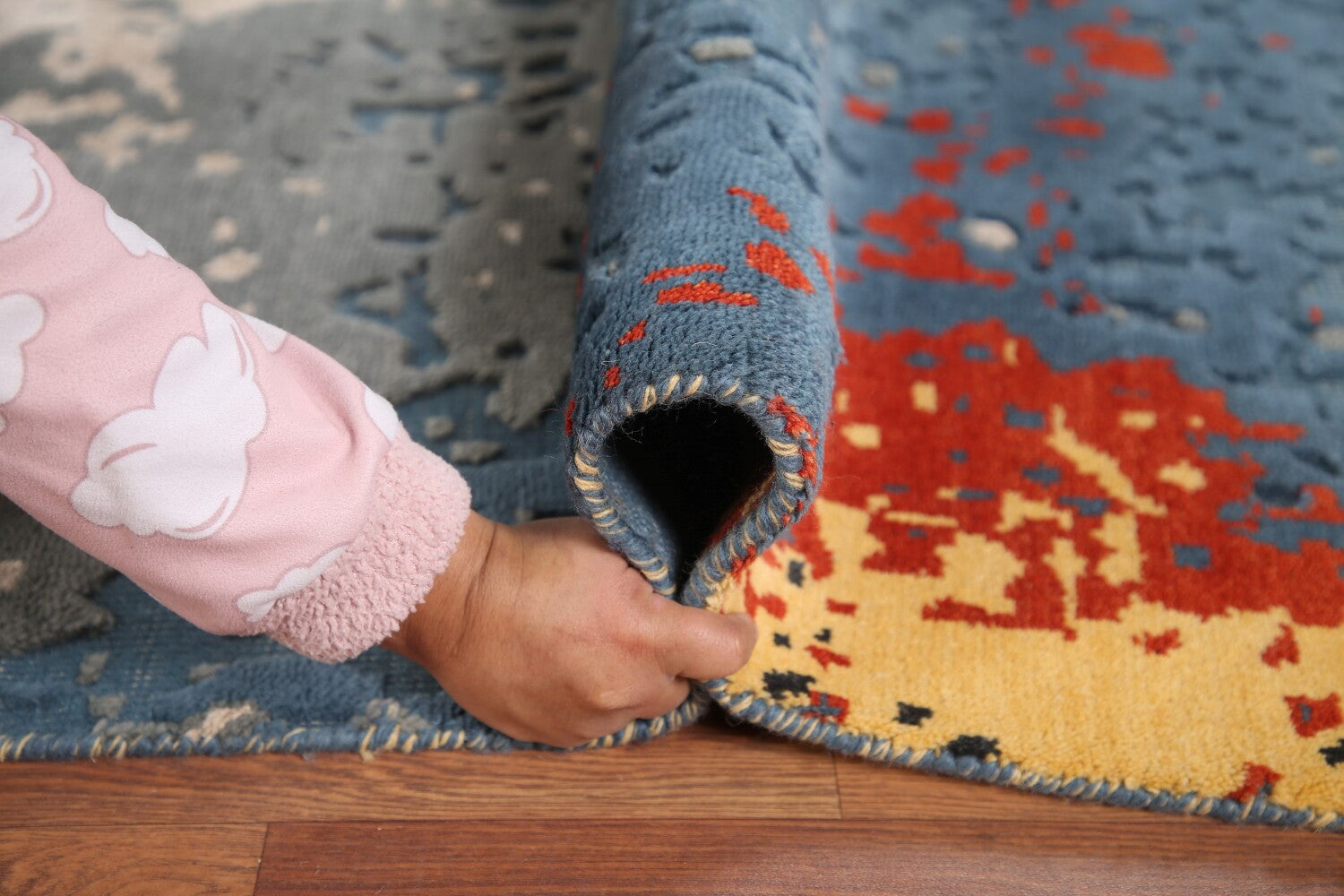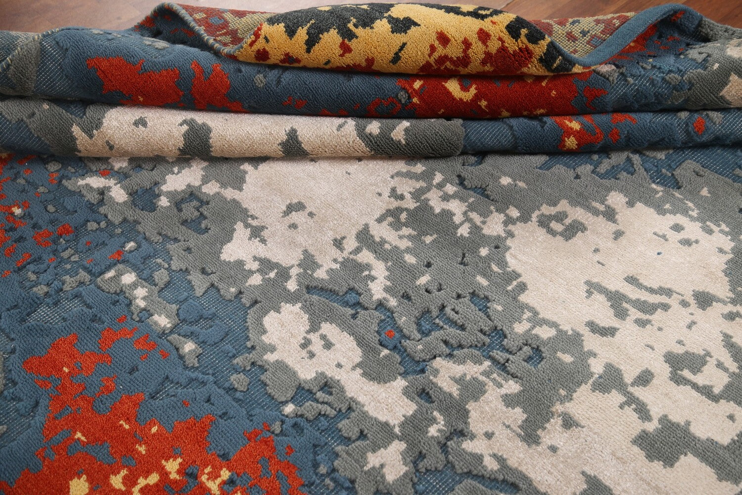 A Beautiful Genuine India Abstract rug is Hand Knotted by skillful weavers in India with 100% Wool Material. This rug is in New, First Quality condition. dimensions are 9' 11'' X 8' 1'' in foot and 302 X 246 in centimeter. the primary color is Navy Blue & Blues.