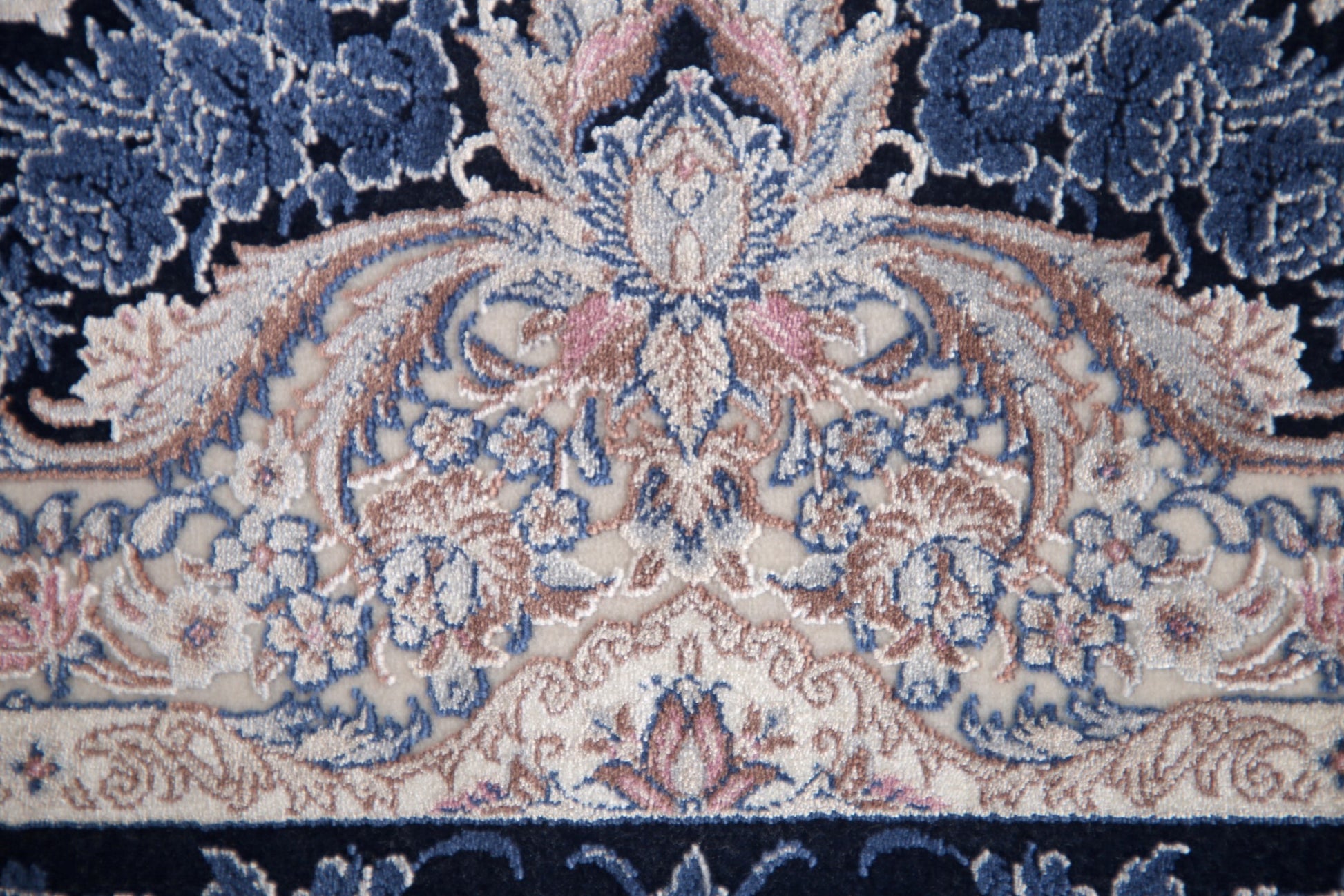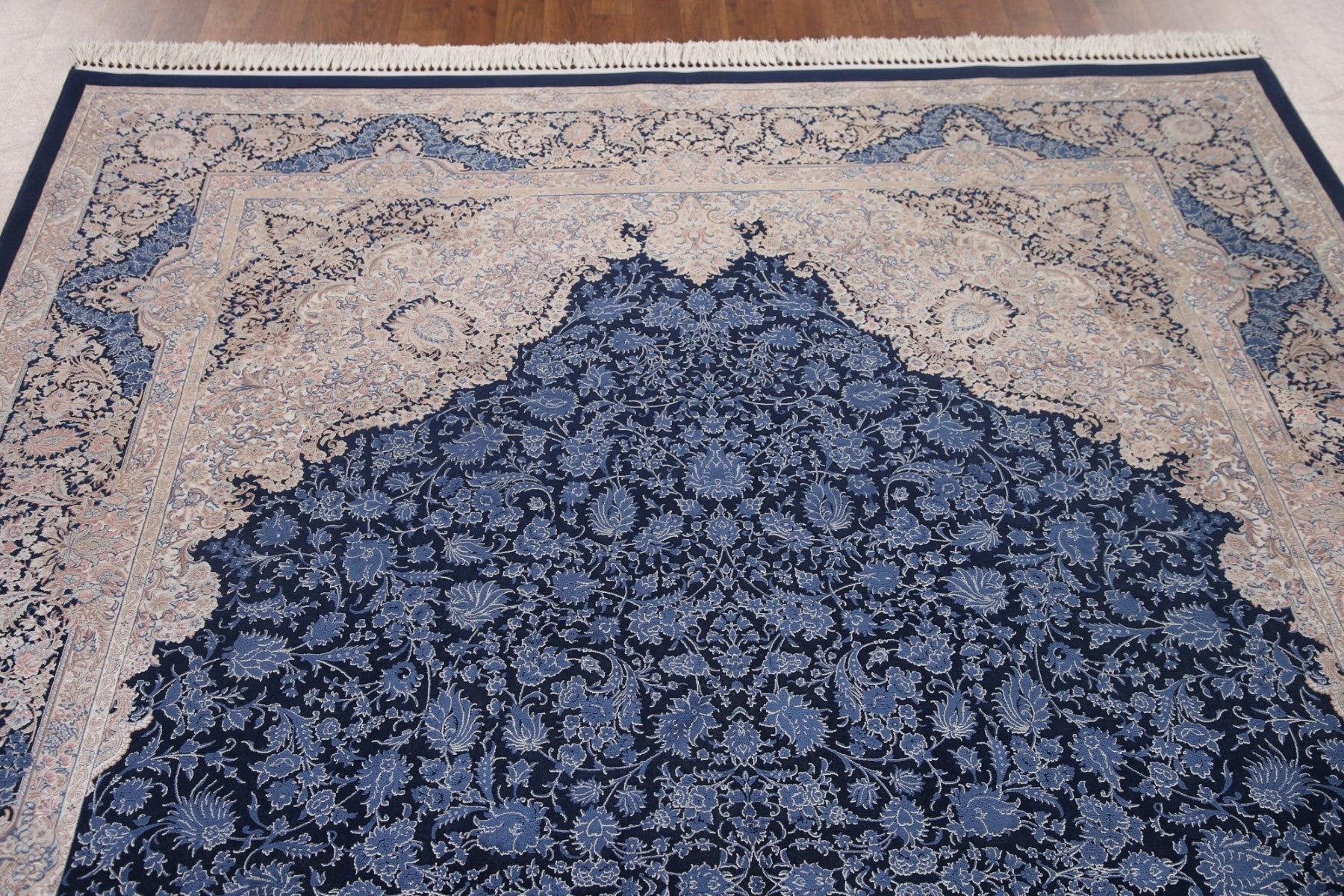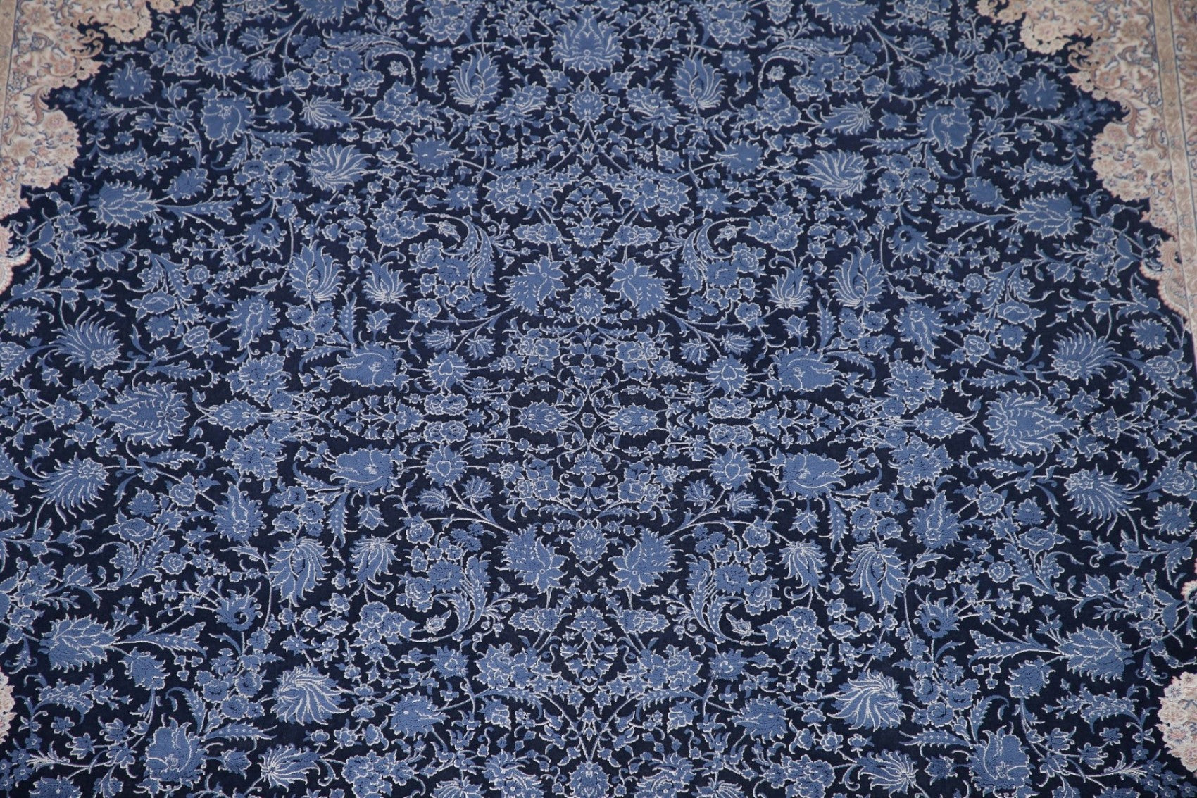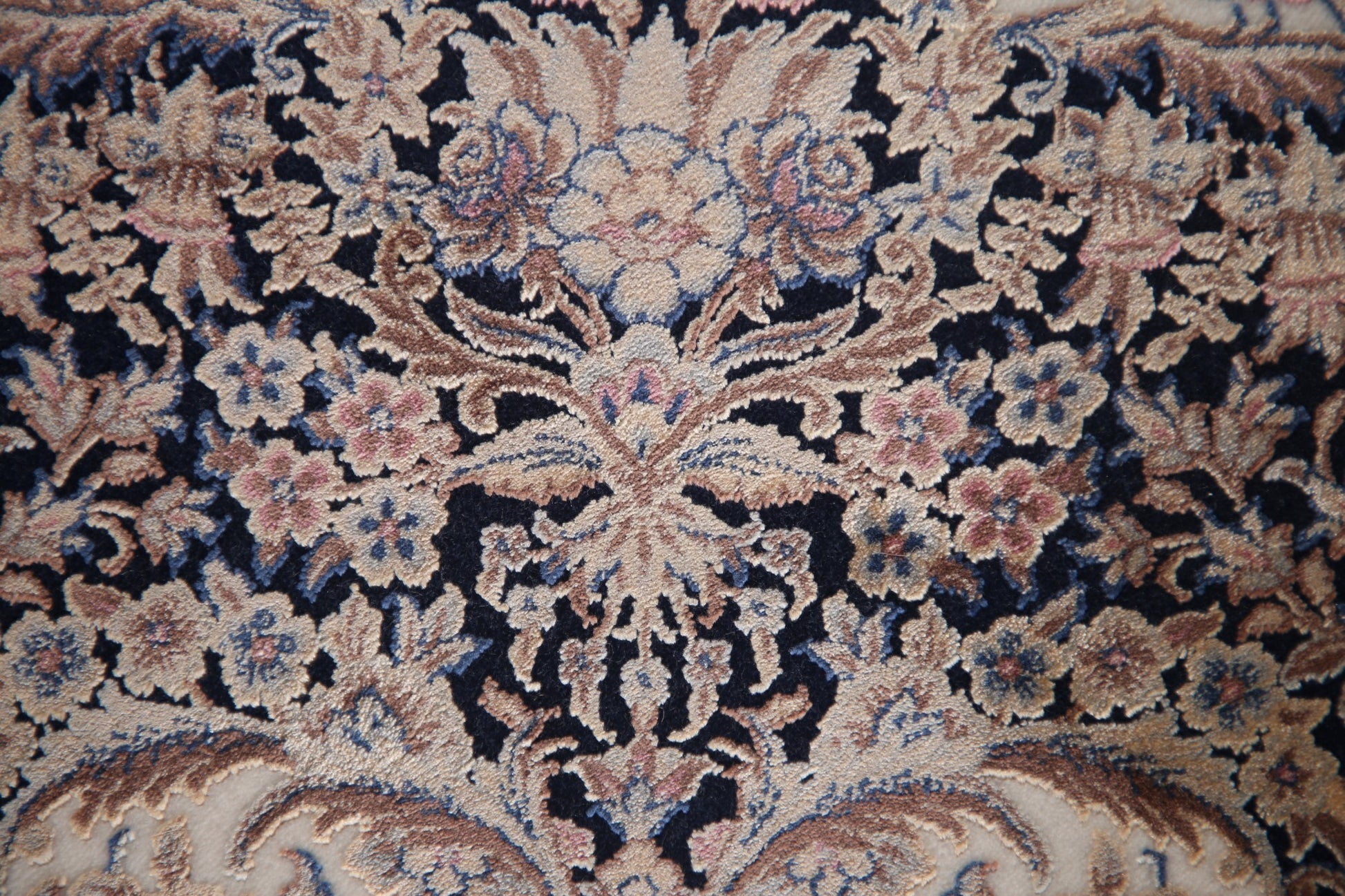 A Beautiful Genuine Turkey Qum rug is Machine Made by skillful weavers in Turkey with 90% Silk - 10% Polyester Material. This rug is in condition. dimensions are 9' 7'' X 6' 7'' in foot and 292 X 201 in centimeter. the primary color is Navy Blue & Blues.