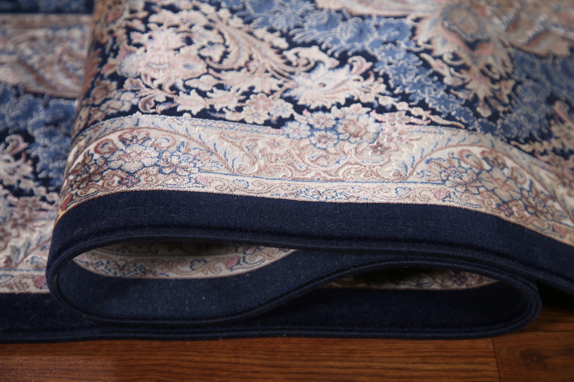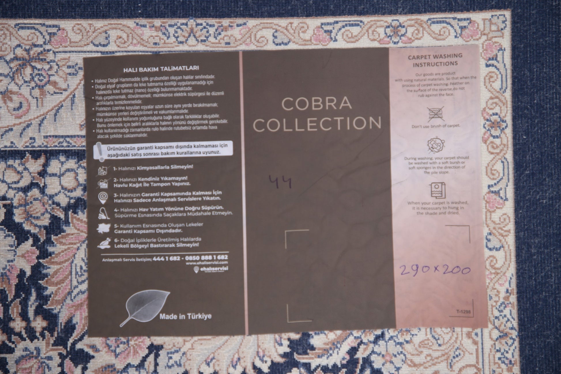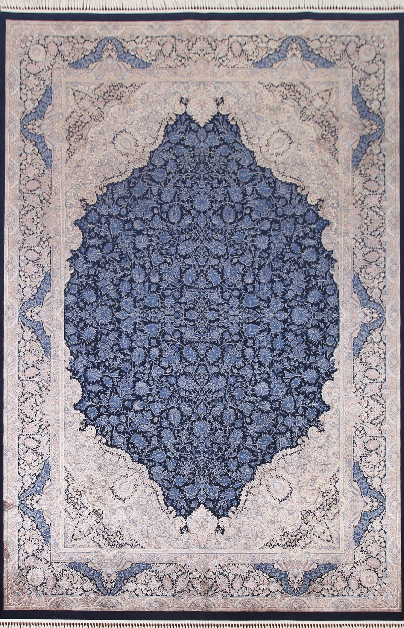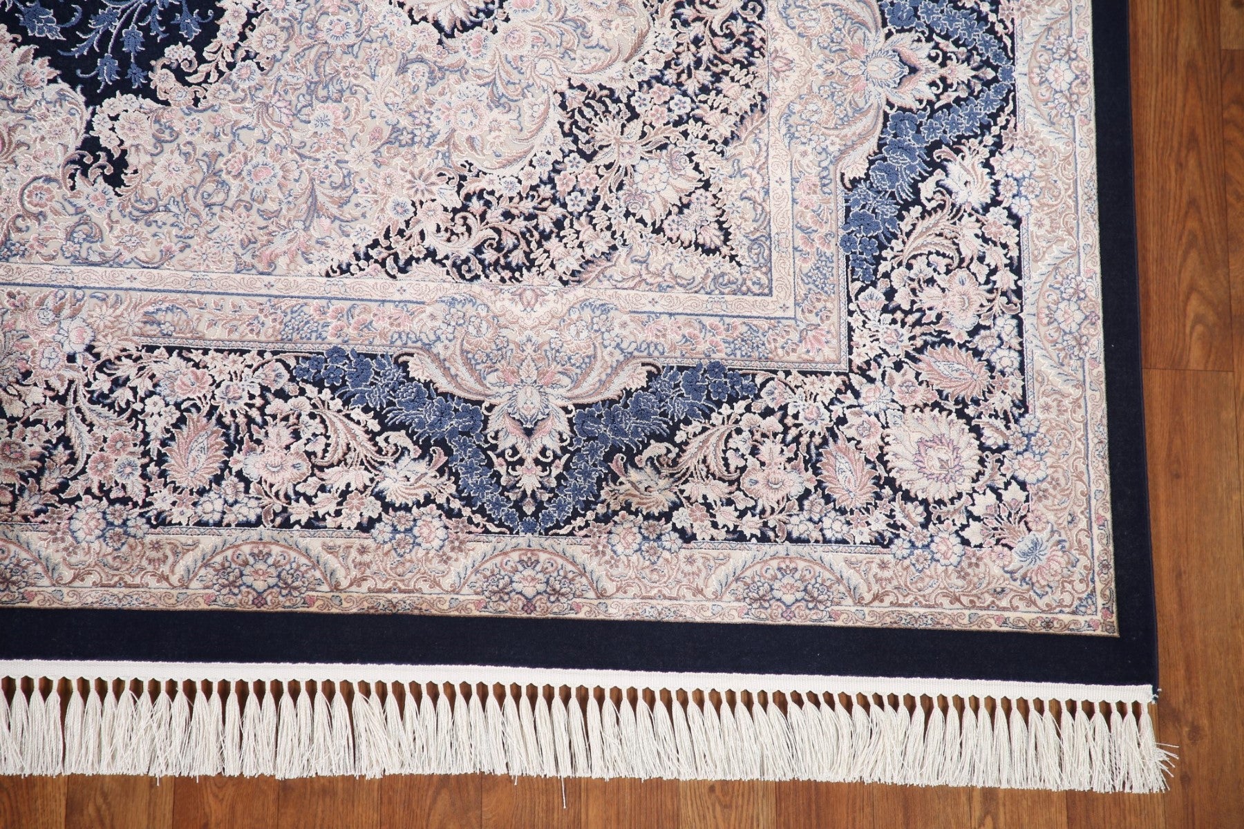 A Beautiful Genuine Turkey Qum rug is Machine Made by skillful weavers in Turkey with 90% Silk - 10% Polyester Material. This rug is in condition. dimensions are 9' 7'' X 6' 7'' in foot and 292 X 201 in centimeter. the primary color is Navy Blue & Blues.