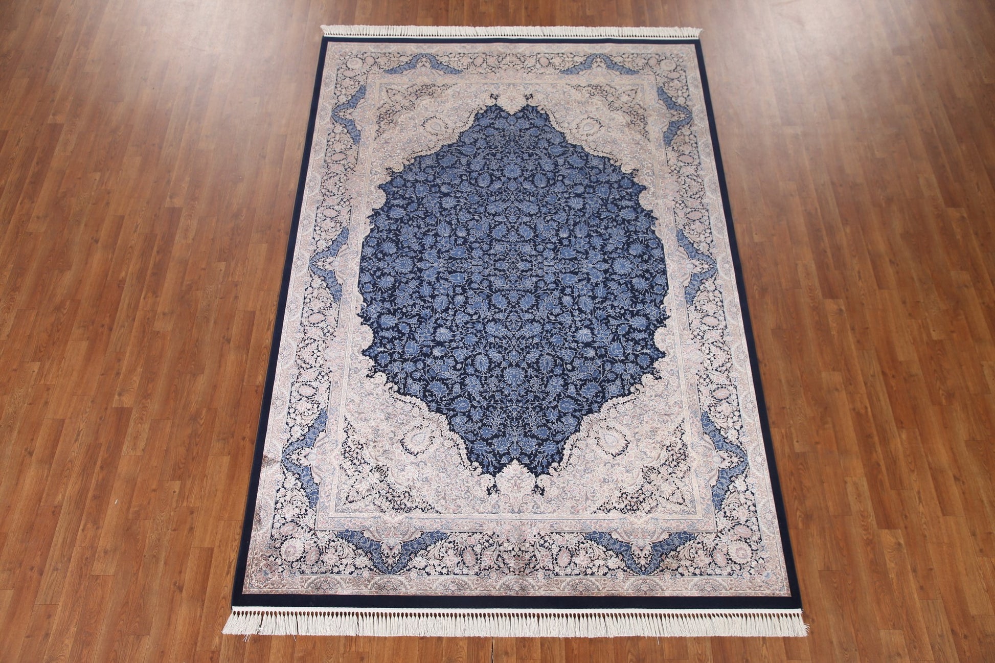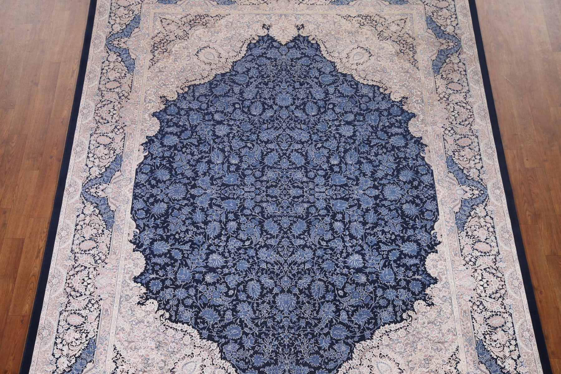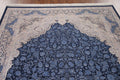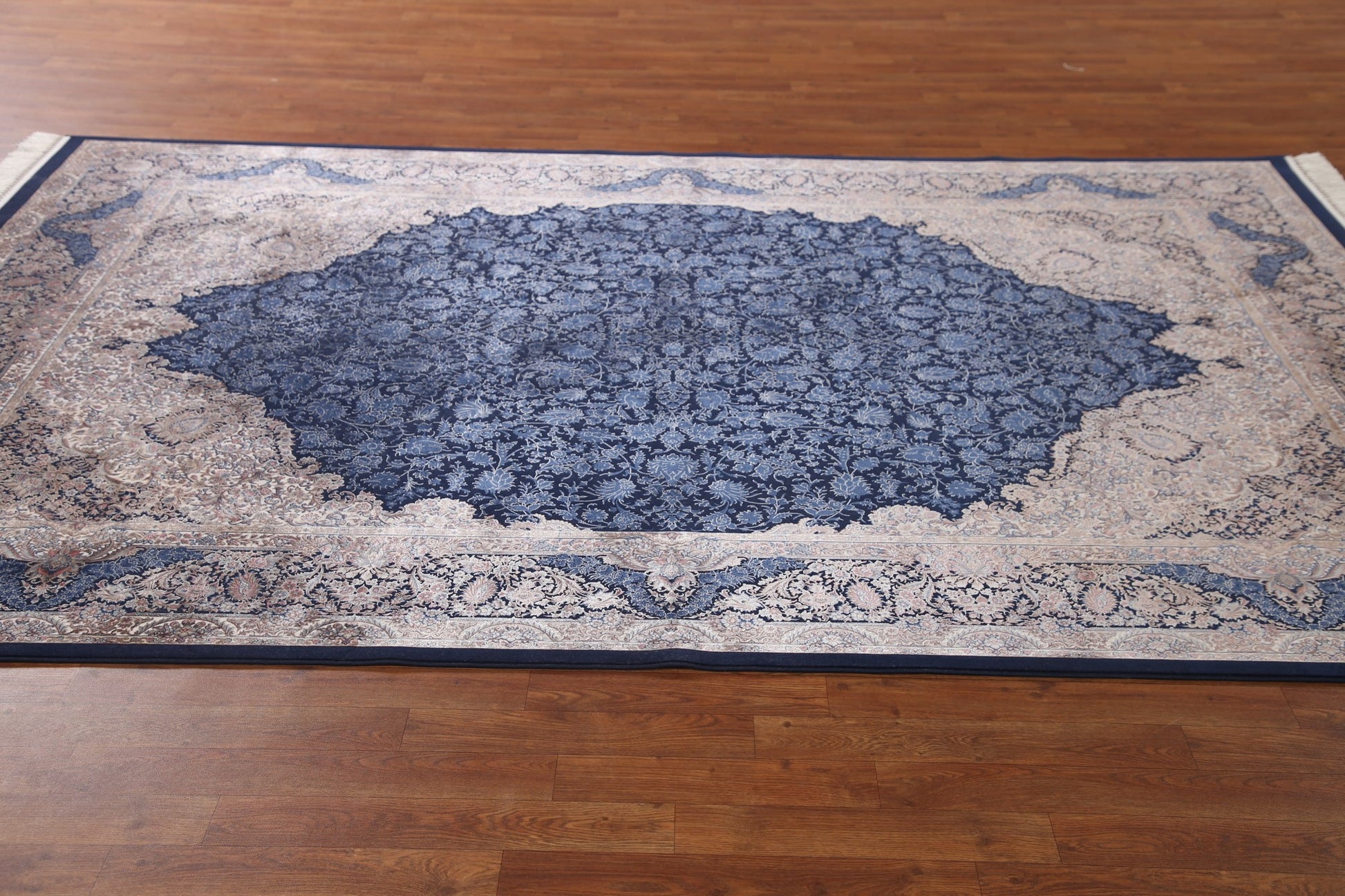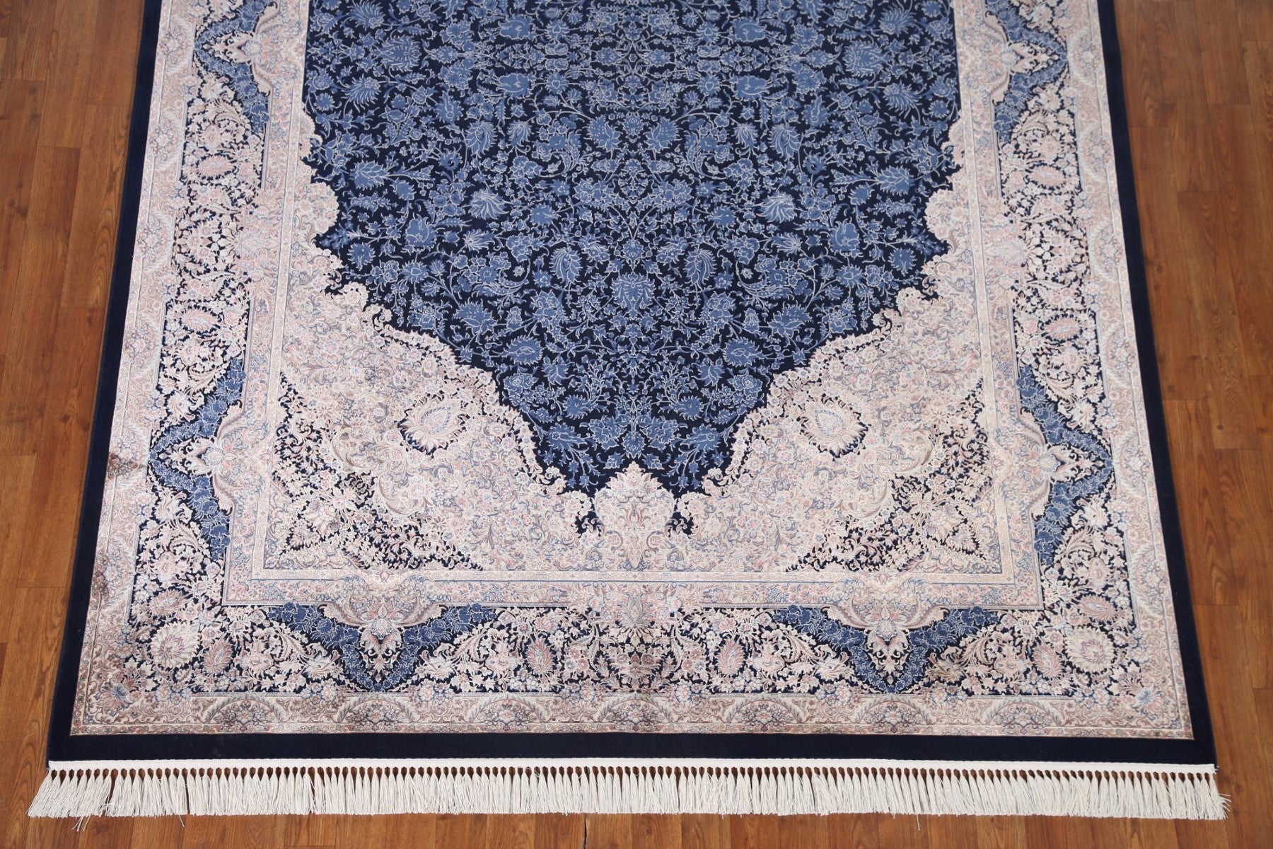 A Beautiful Genuine Turkey Qum rug is Machine Made by skillful weavers in Turkey with 90% Silk - 10% Polyester Material. This rug is in condition. dimensions are 9' 7'' X 6' 7'' in foot and 292 X 201 in centimeter. the primary color is Navy Blue & Blues.