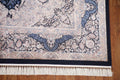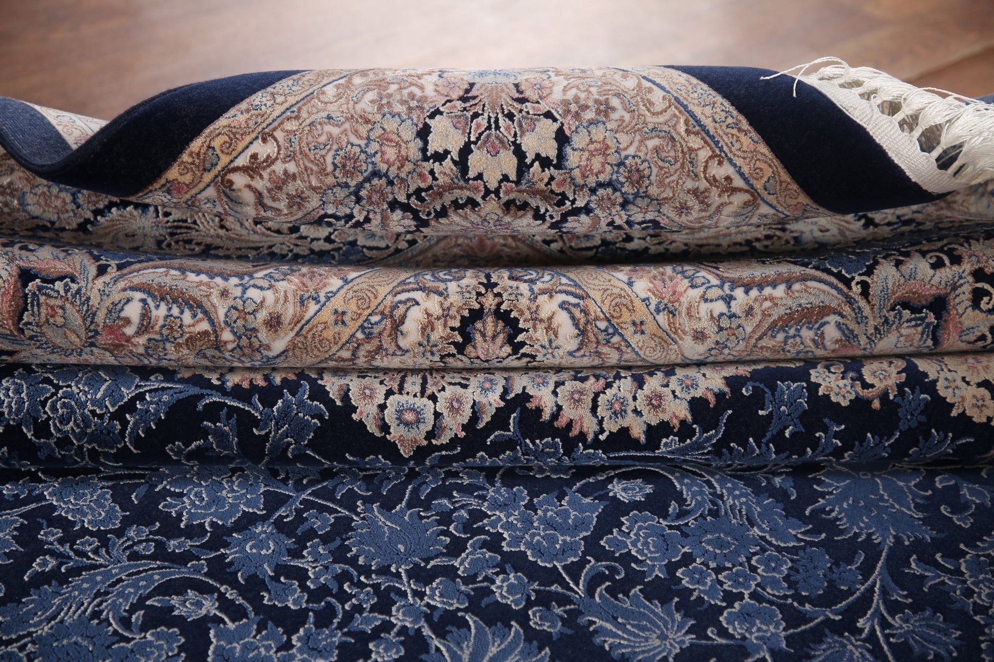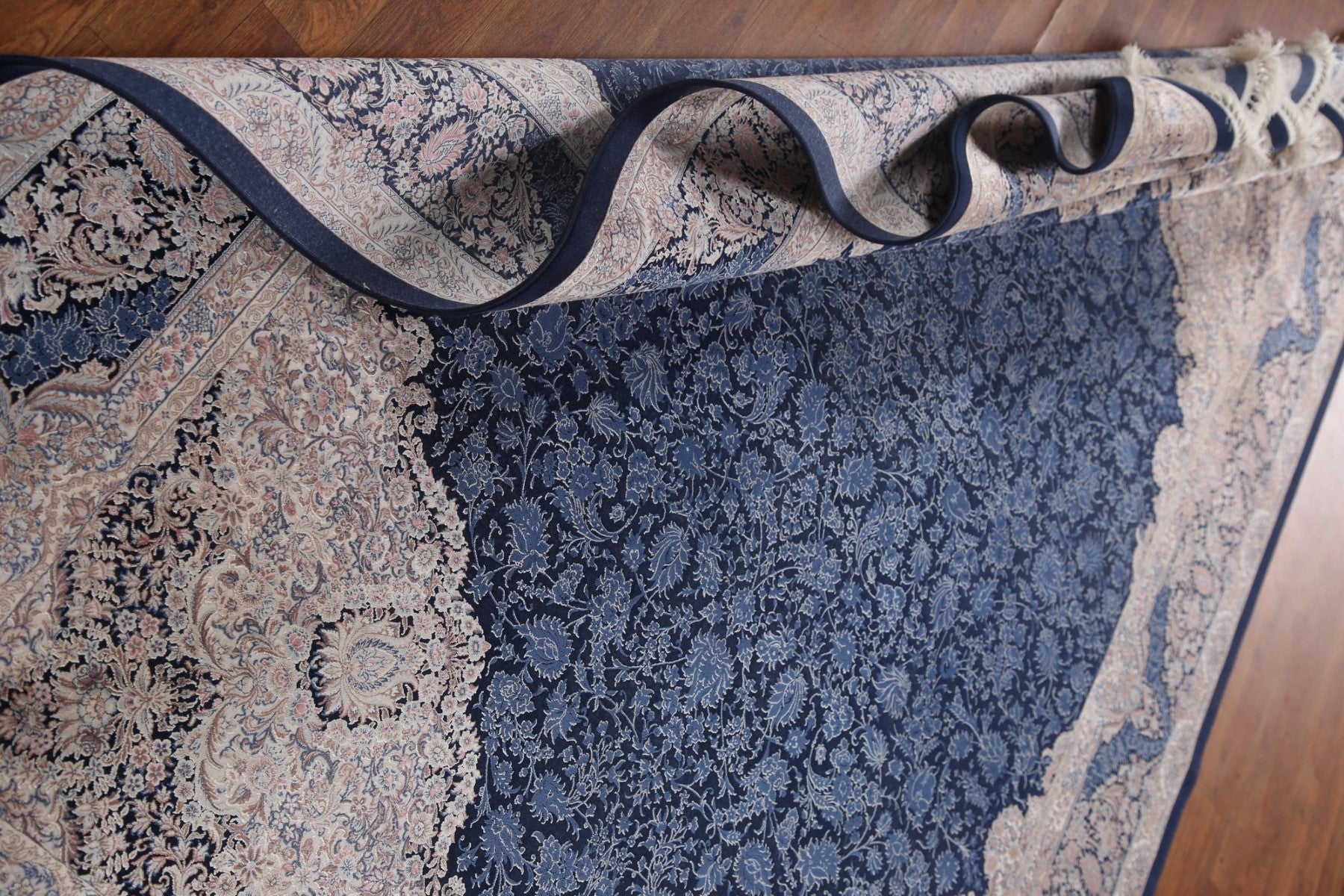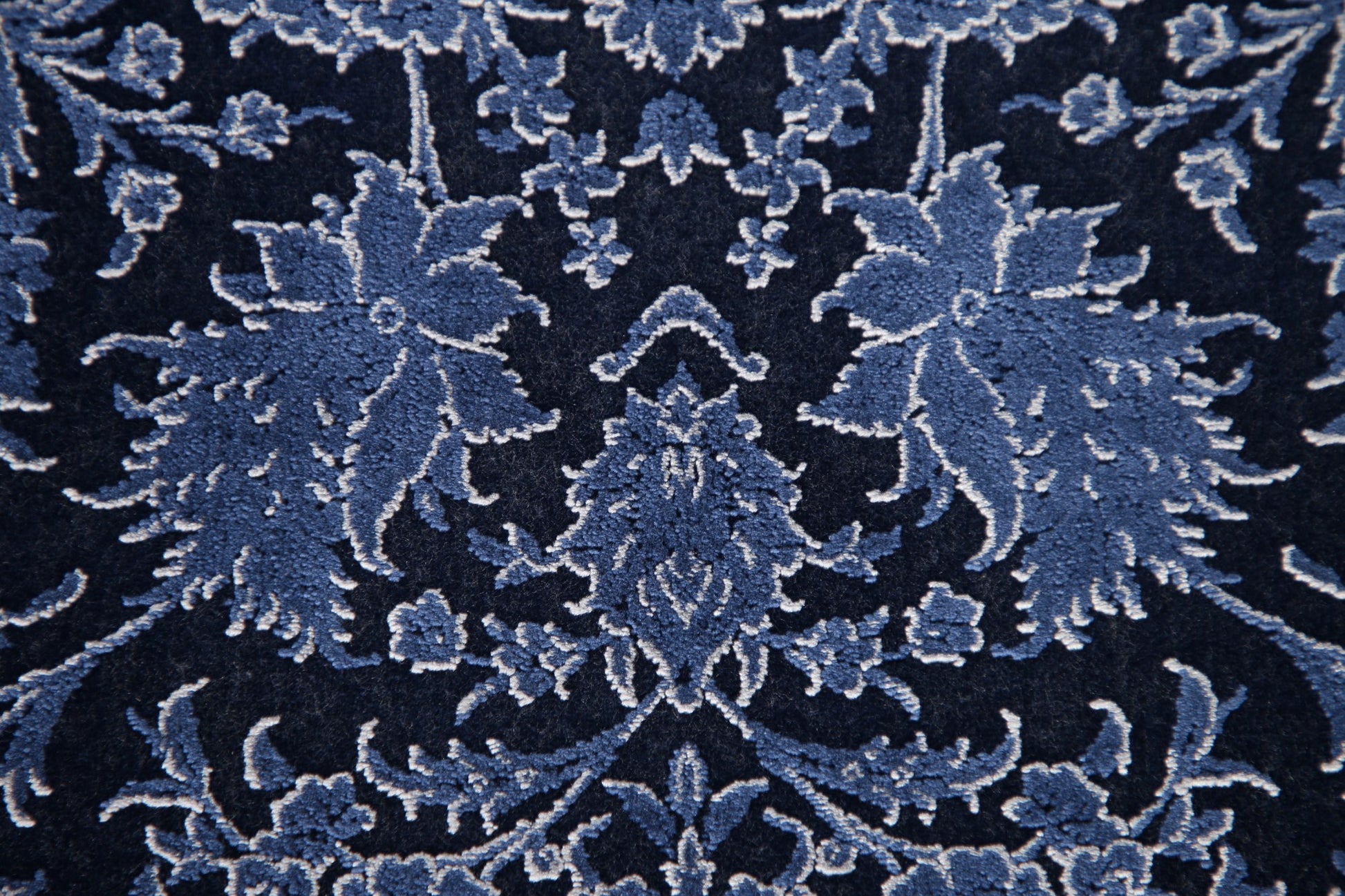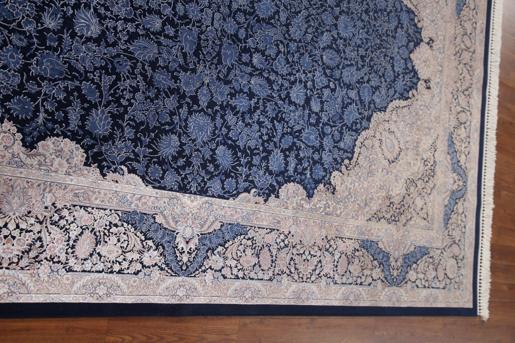 A Beautiful Genuine Turkey Qum rug is Machine Made by skillful weavers in Turkey with 90% Silk - 10% Polyester Material. This rug is in condition. dimensions are 9' 7'' X 6' 7'' in foot and 292 X 201 in centimeter. the primary color is Navy Blue & Blues.