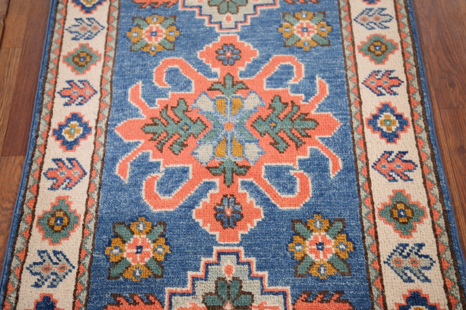 A Beautiful Genuine Pakistan Kazak rug is Hand Knotted by skillful weavers in Pakistan with 100% Wool Material. This rug is in New, First Quality condition. dimensions are 3' 0'' X 2' 0'' in foot and 91 X 61 in centimeter. the primary color is Navy Blue & Blues.