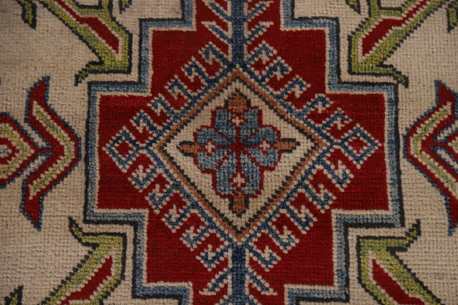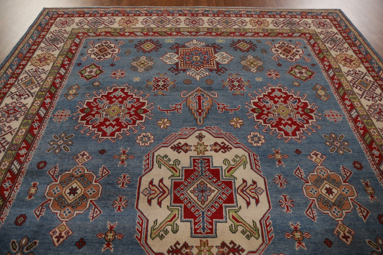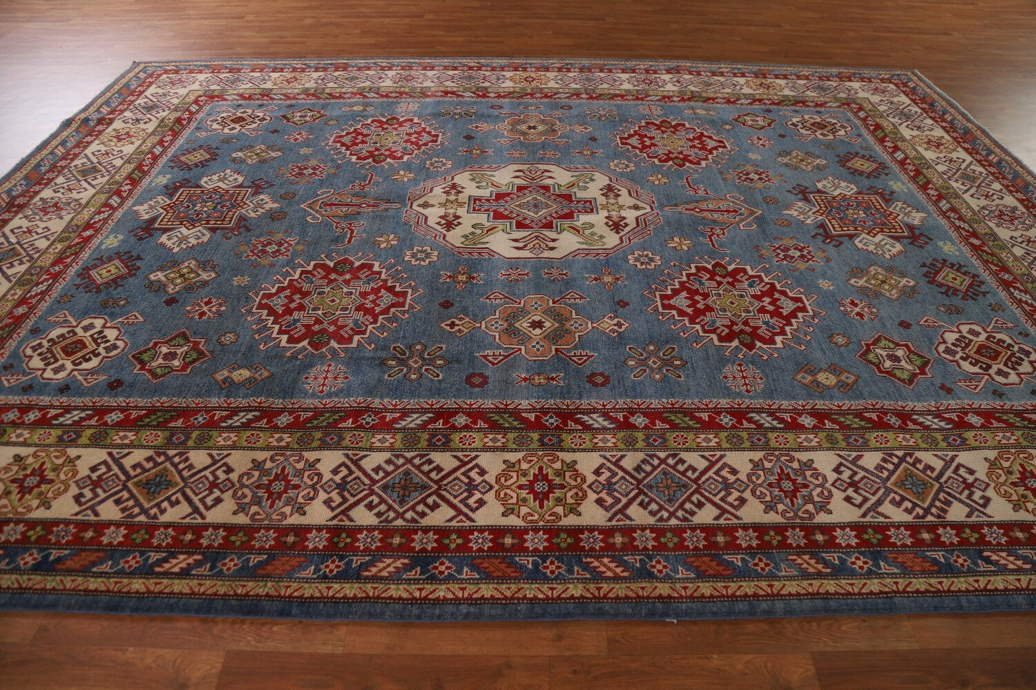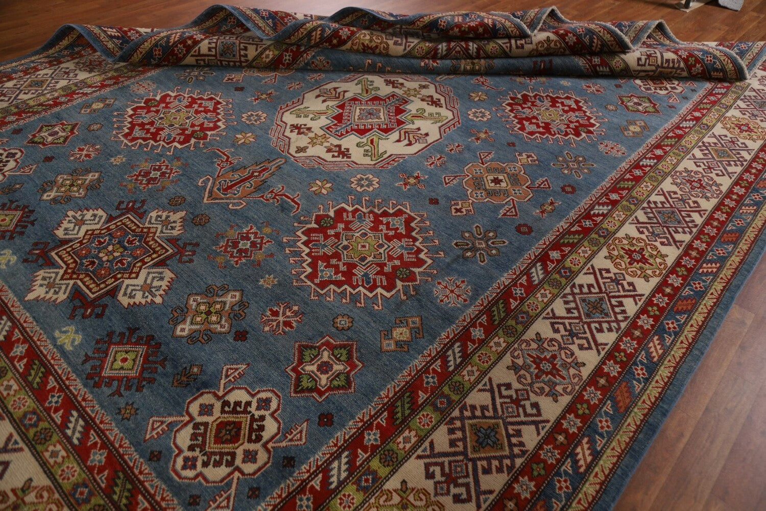 A Beautiful Genuine Pakistan Kazak rug is Hand Knotted by skillful weavers in Pakistan with 100% Wool Material. This rug is in New, First Quality condition. dimensions are 12' 6'' X 9' 1'' in foot and 381 X 277 in centimeter. the primary color is Navy Blue & Blues.