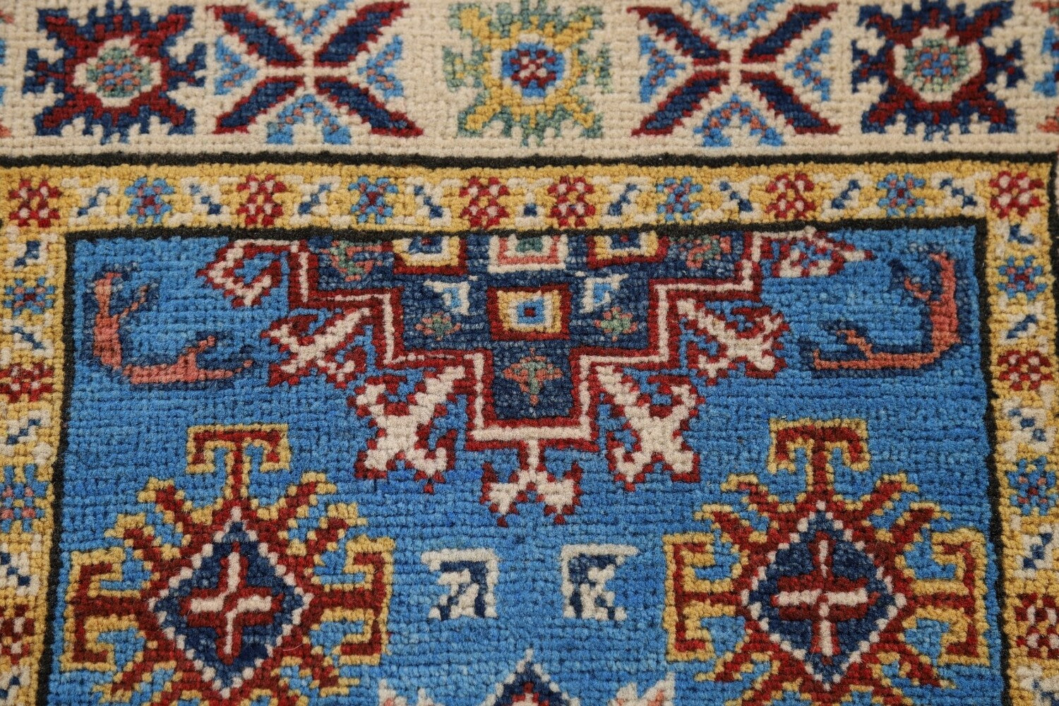 A Beautiful Genuine Pakistan Kazak rug is Hand Knotted by skillful weavers in Pakistan with 100% Wool Material. This rug is in condition. dimensions are 3' 0'' X 2' 1'' in foot and 91 X 64 in centimeter. the primary color is Navy Blue & Blues.