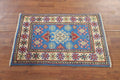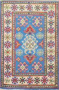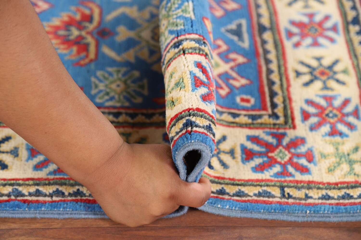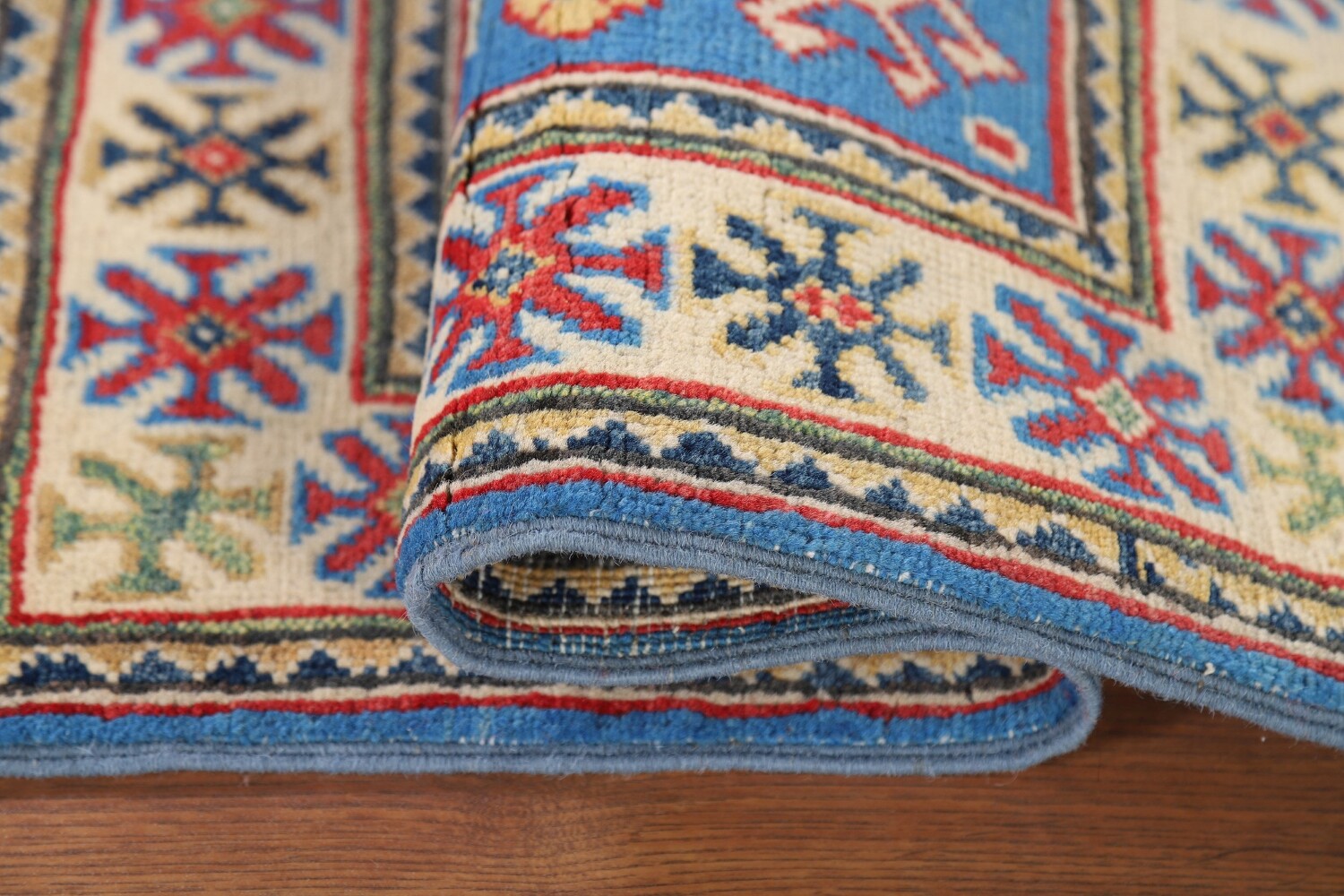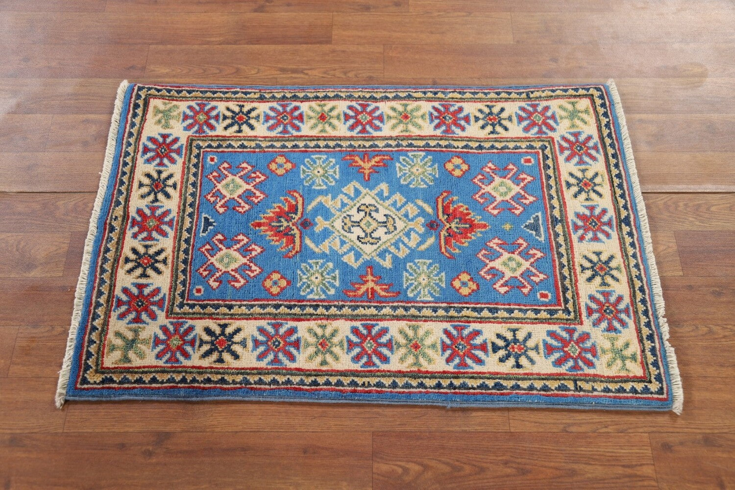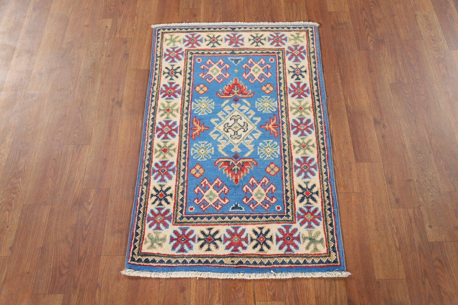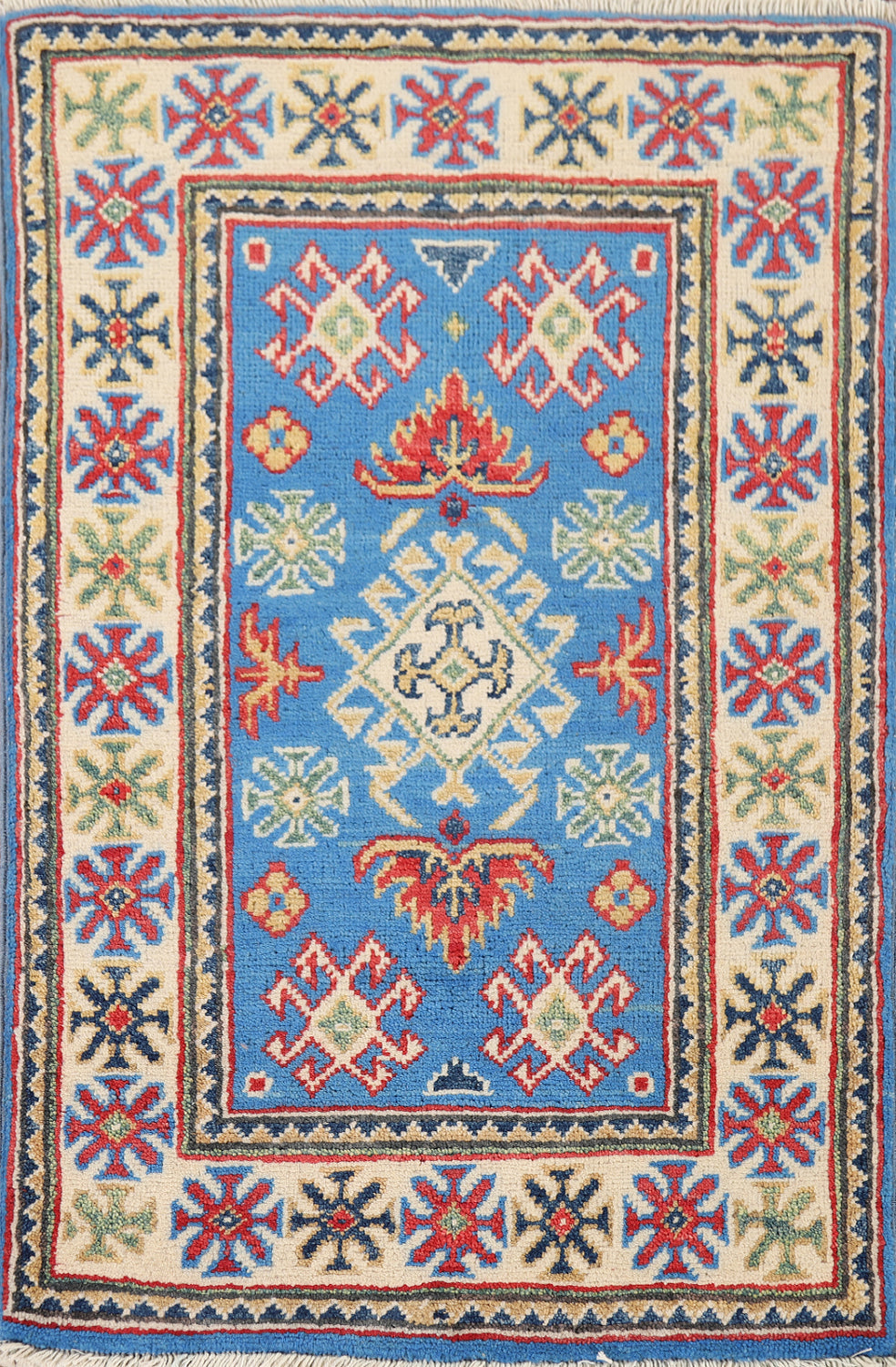 A Beautiful Genuine Pakistan Kazak rug is Hand Knotted by skillful weavers in Pakistan with 100% Wool Material. This rug is in New, First Quality condition. dimensions are 2' 11'' X 2' 0'' in foot and 89 X 61 in centimeter. the primary color is Navy Blue & Blues.