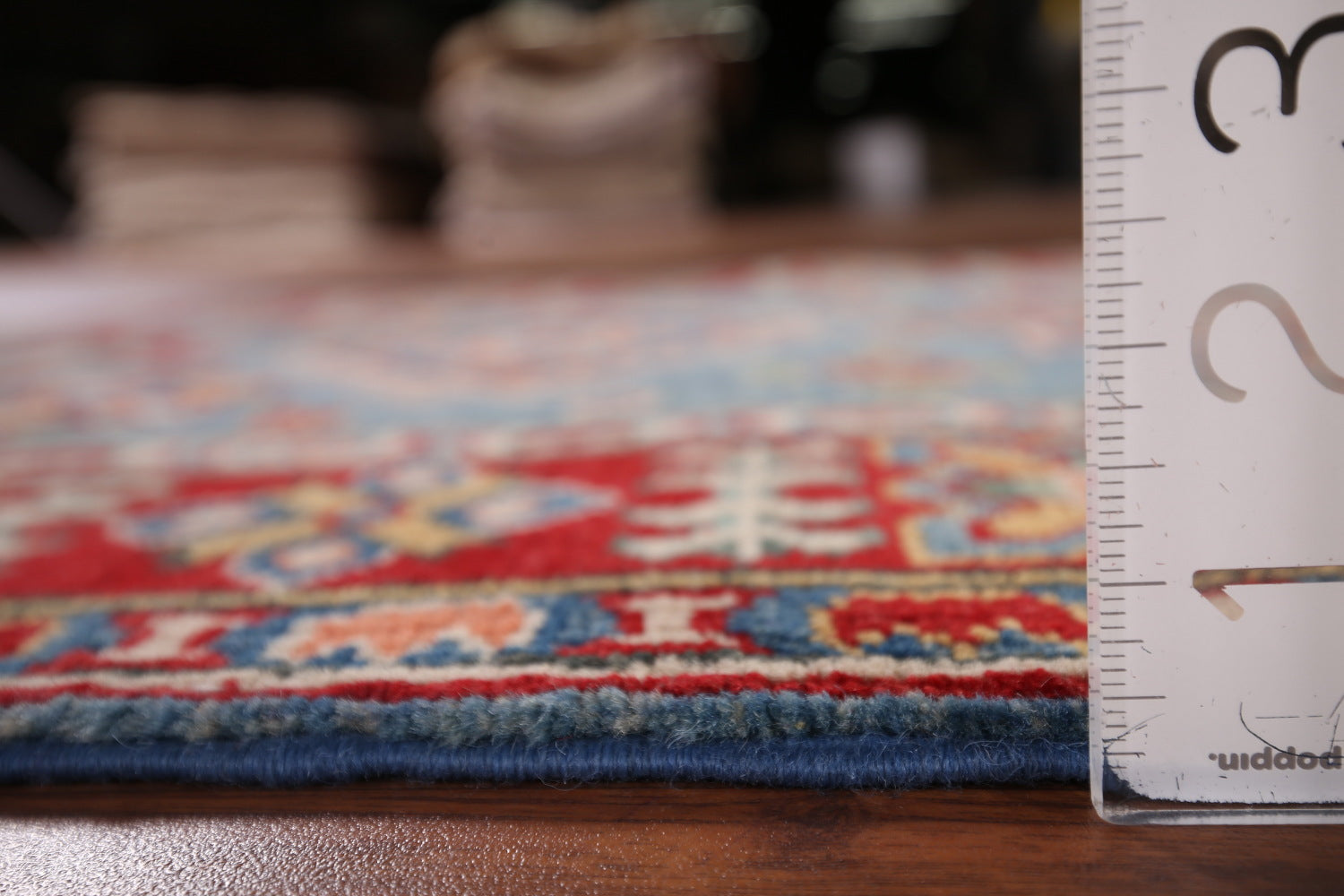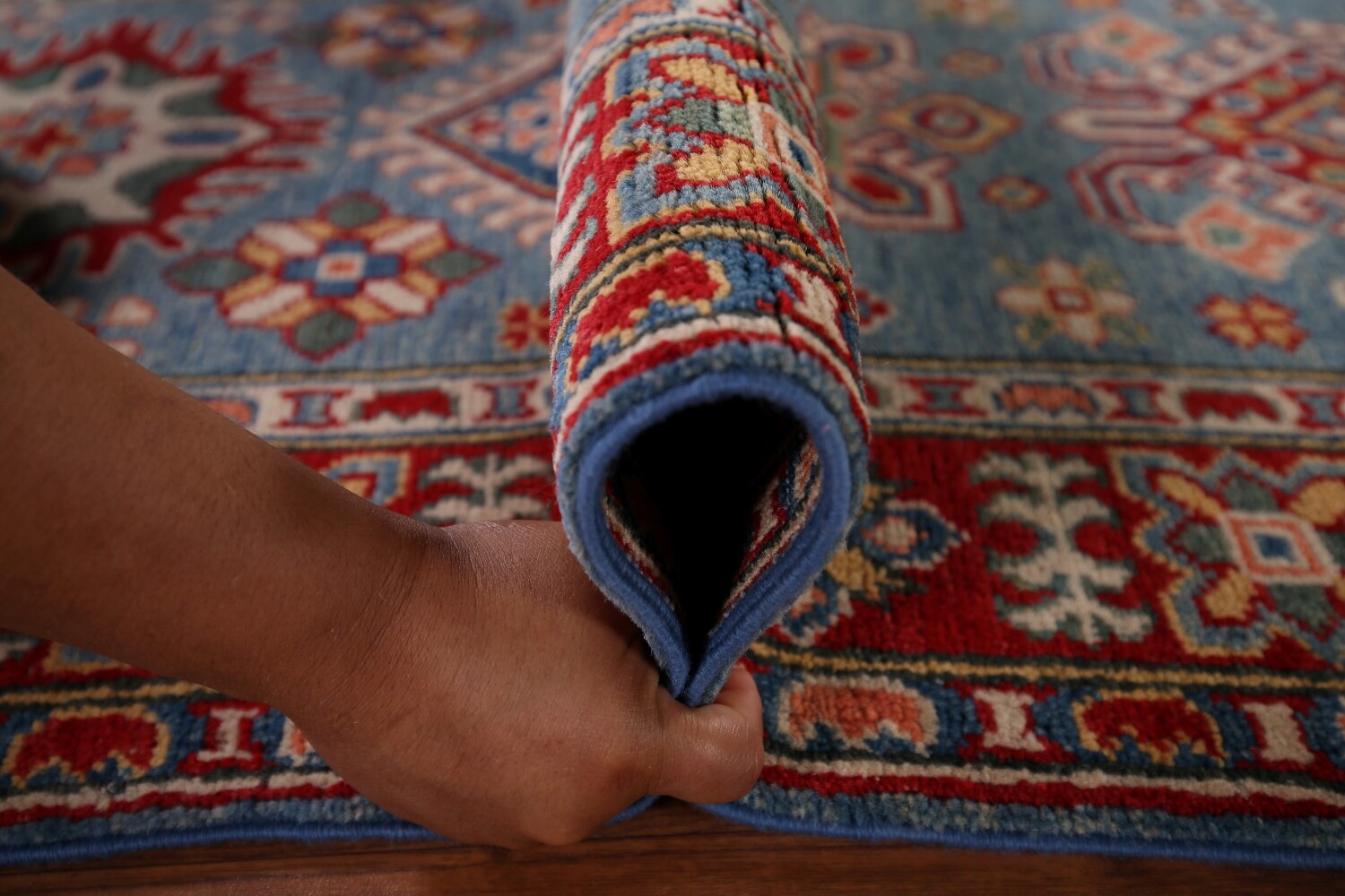 A Beautiful Genuine Pakistan Kazak rug is Hand Knotted by skillful weavers in Pakistan with 100% Wool Material. This rug is in New, First Quality condition. dimensions are 9' 9'' X 2' 8'' in foot and 297 X 81 in centimeter. the primary color is Navy Blue & Blues.