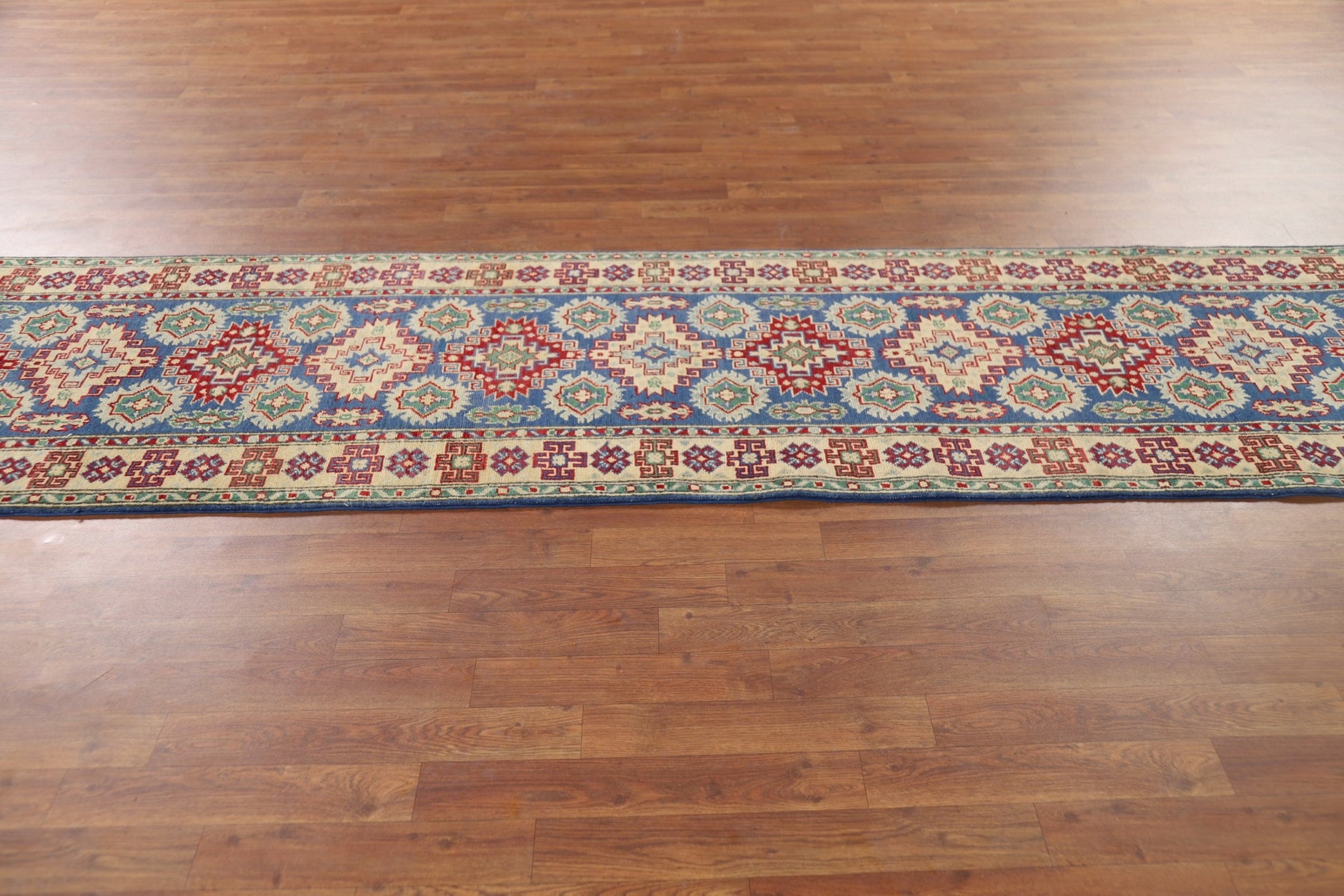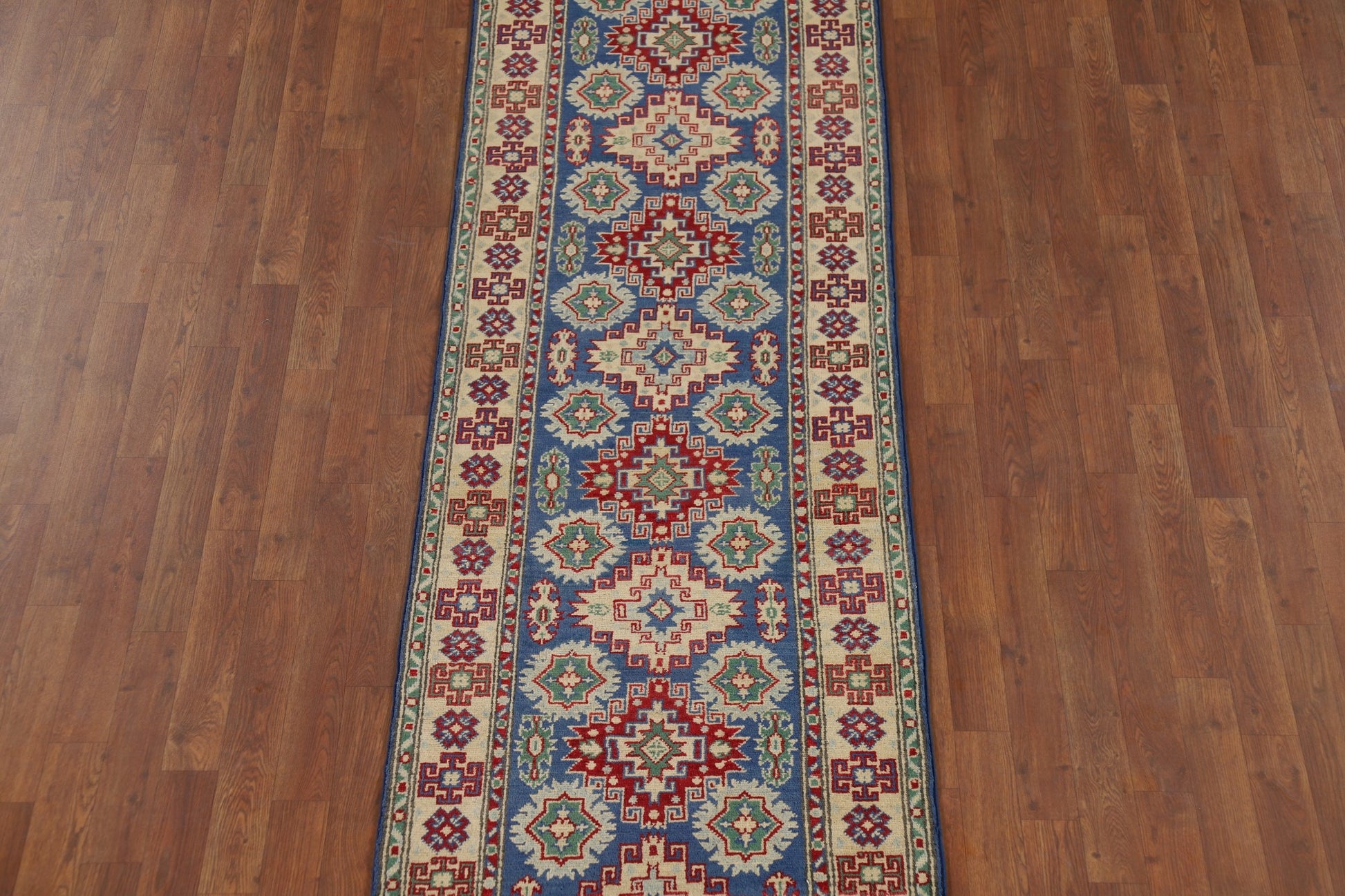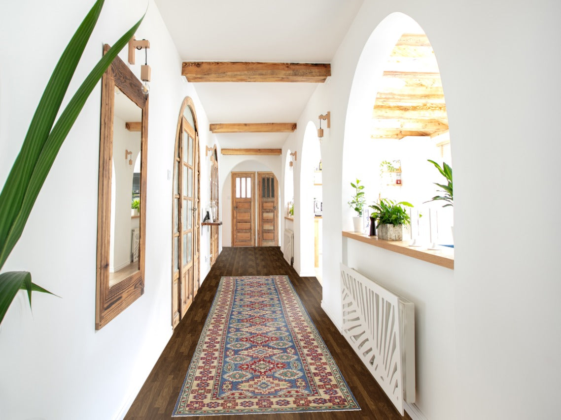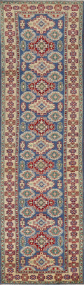 Blue Geometric Kazak Oriental Runner Rug 3x13