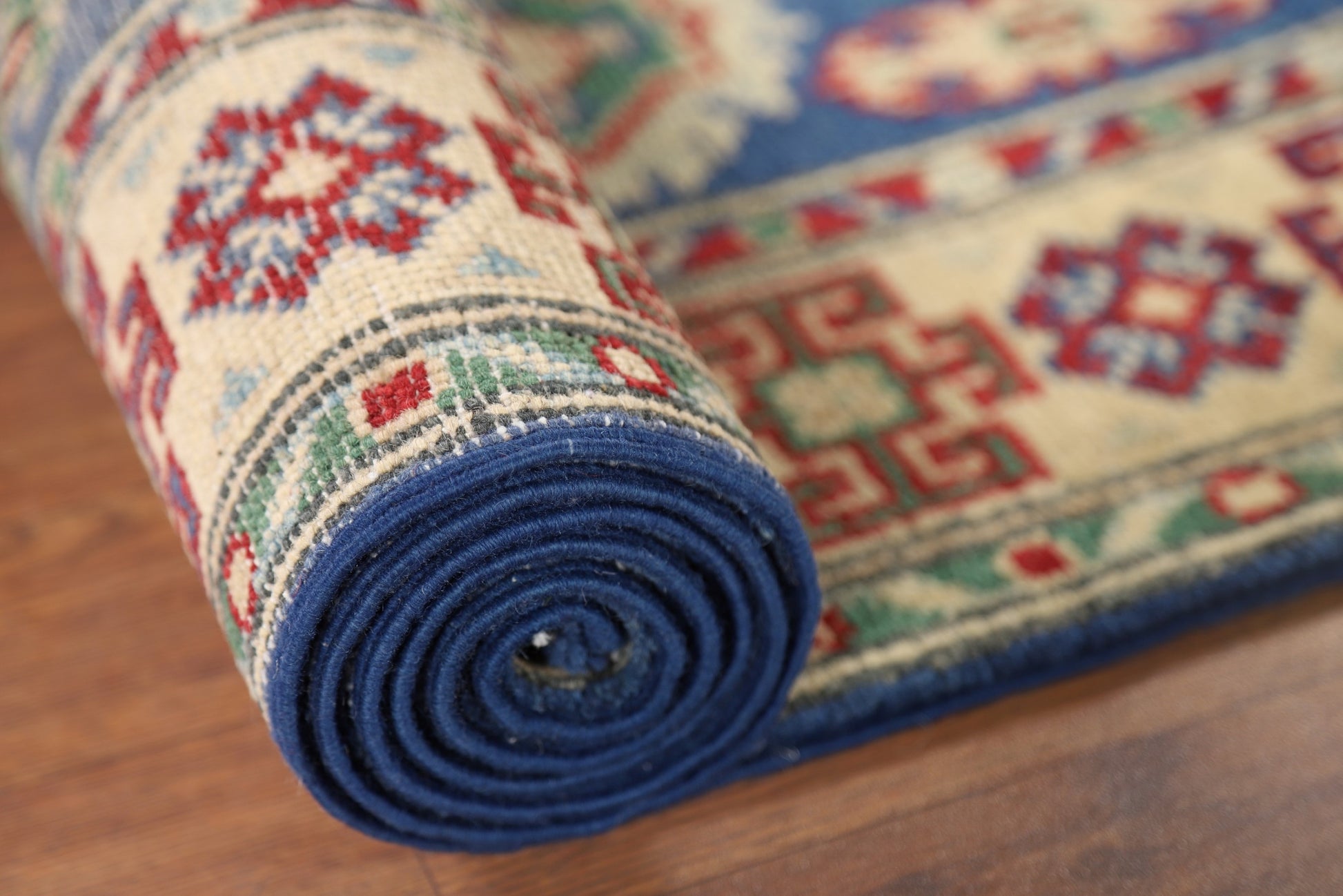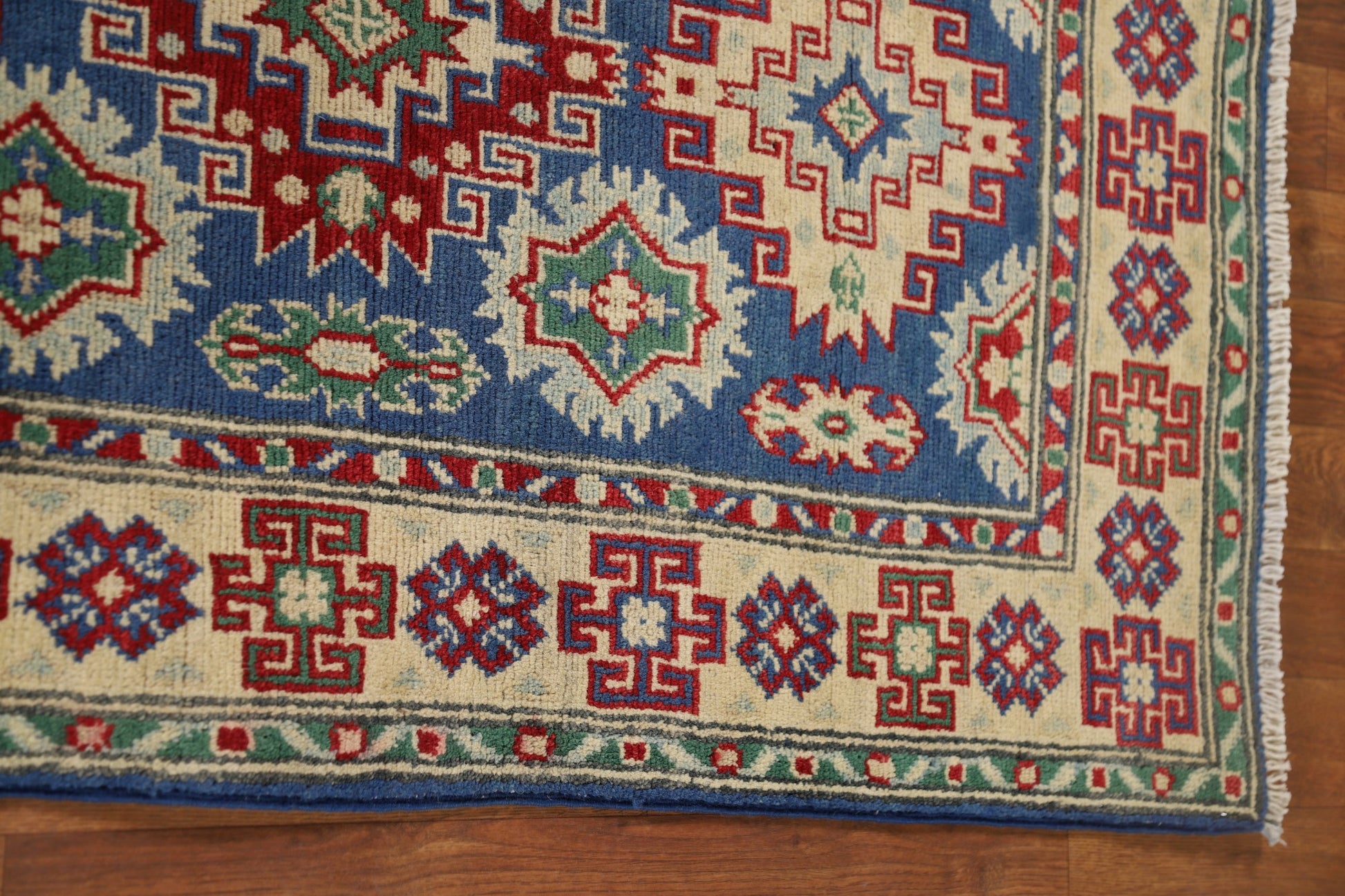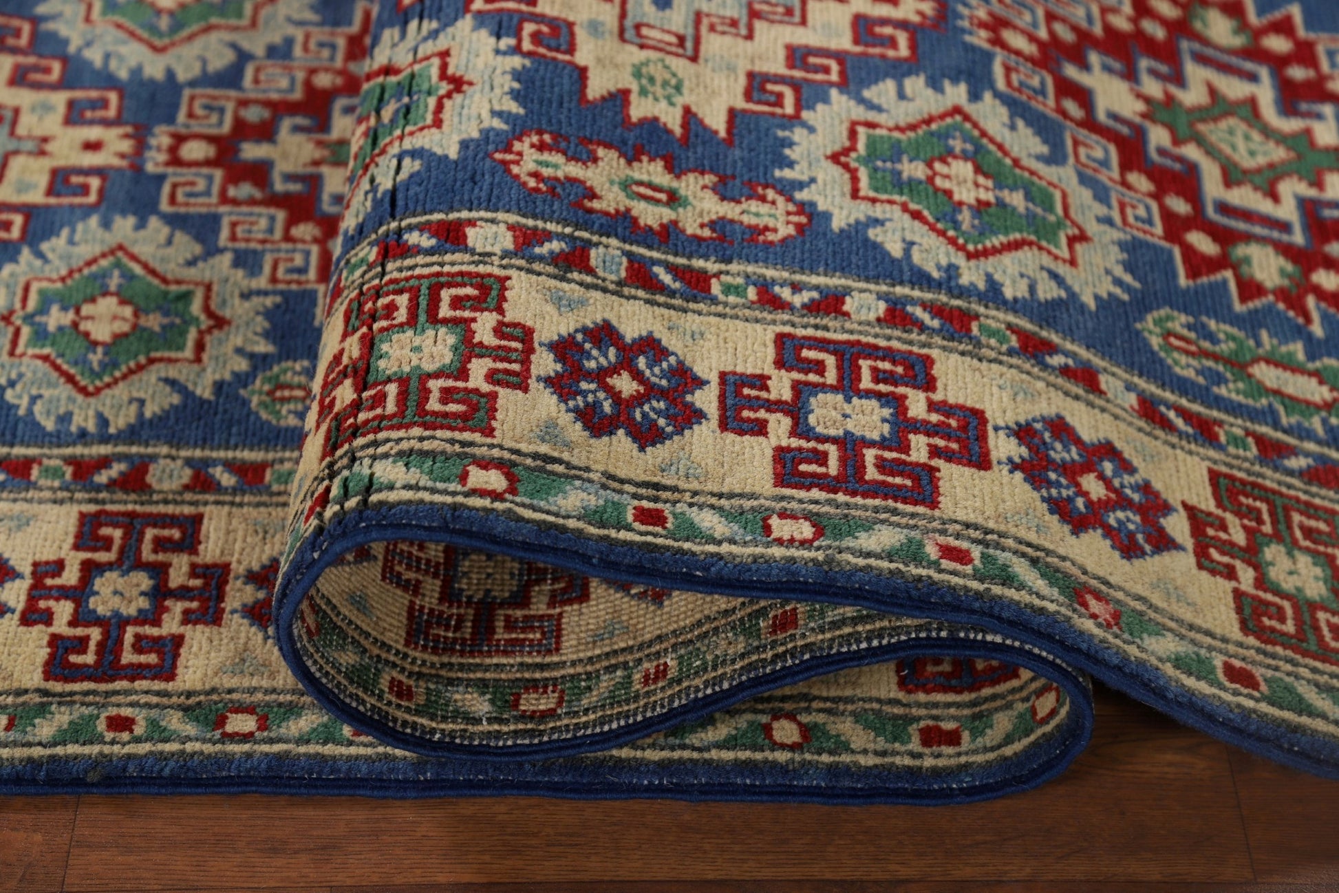 A Beautiful Genuine Pakistan Kazak rug is Hand Knotted by skillful weavers in Pakistan with 100% Wool Material. This rug is in New, First Quality condition. dimensions are 13' 1'' X 2' 7'' in foot and 399 X 79 in centimeter. the primary color is Navy Blue & Blues.
