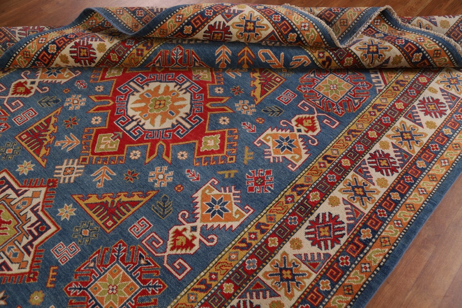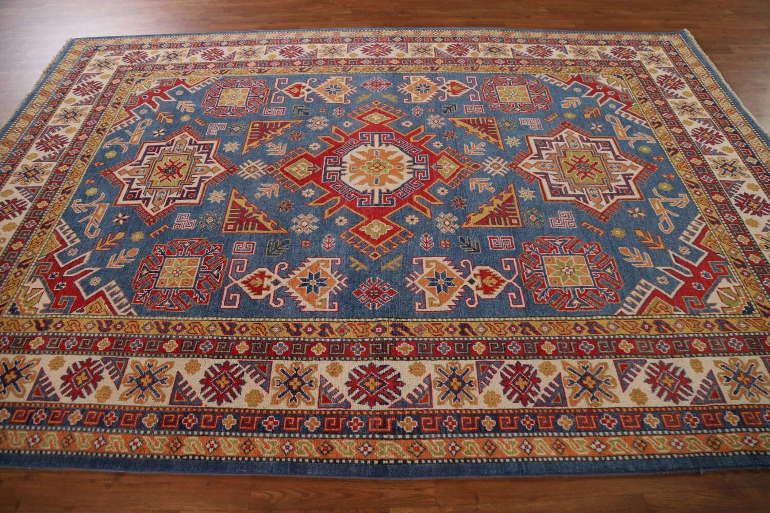 A Beautiful Genuine Pakistan Kazak rug is Hand Knotted by skillful weavers in Pakistan with 100% Wool Material. This rug is in New, First Quality condition. dimensions are 9' 9'' X 6' 8'' in foot and 297 X 203 in centimeter. the primary color is Navy Blue & Blues.