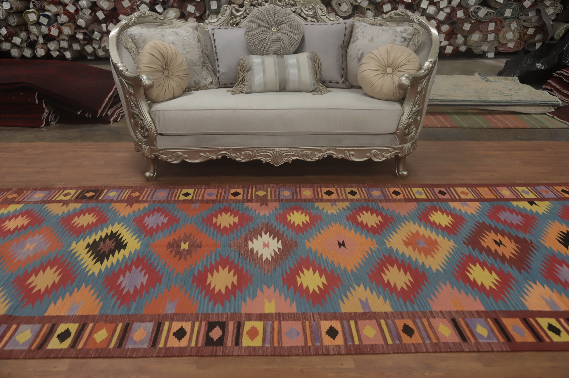 A Beautiful Genuine Pakistan Kilim rug is Hand Woven by skillful weavers in Pakistan with 100% Wool Material. This rug is in New, First Quality condition. dimensions are 16' 3'' X 5' 0'' in foot and 495 X 152 in centimeter. the primary color is Navy Blue & Blues.