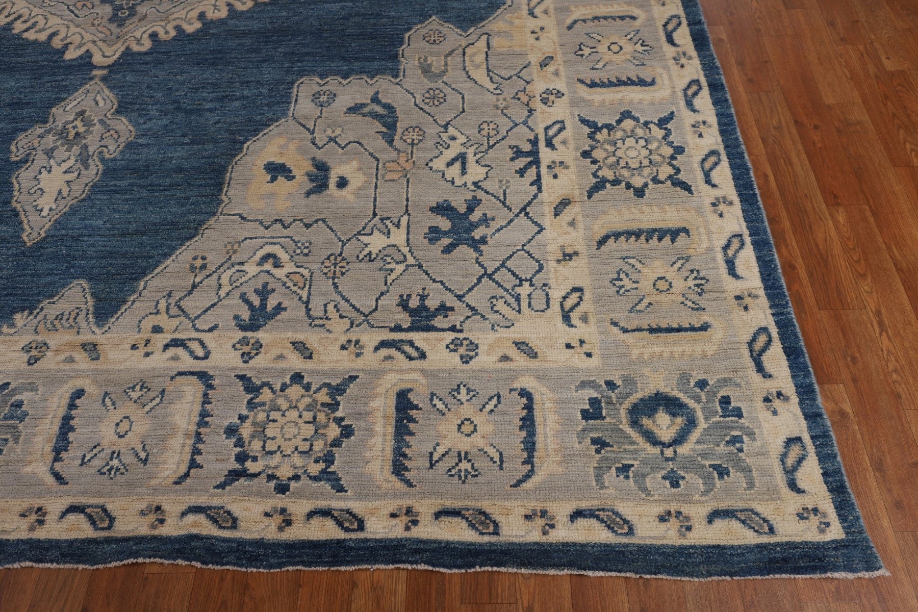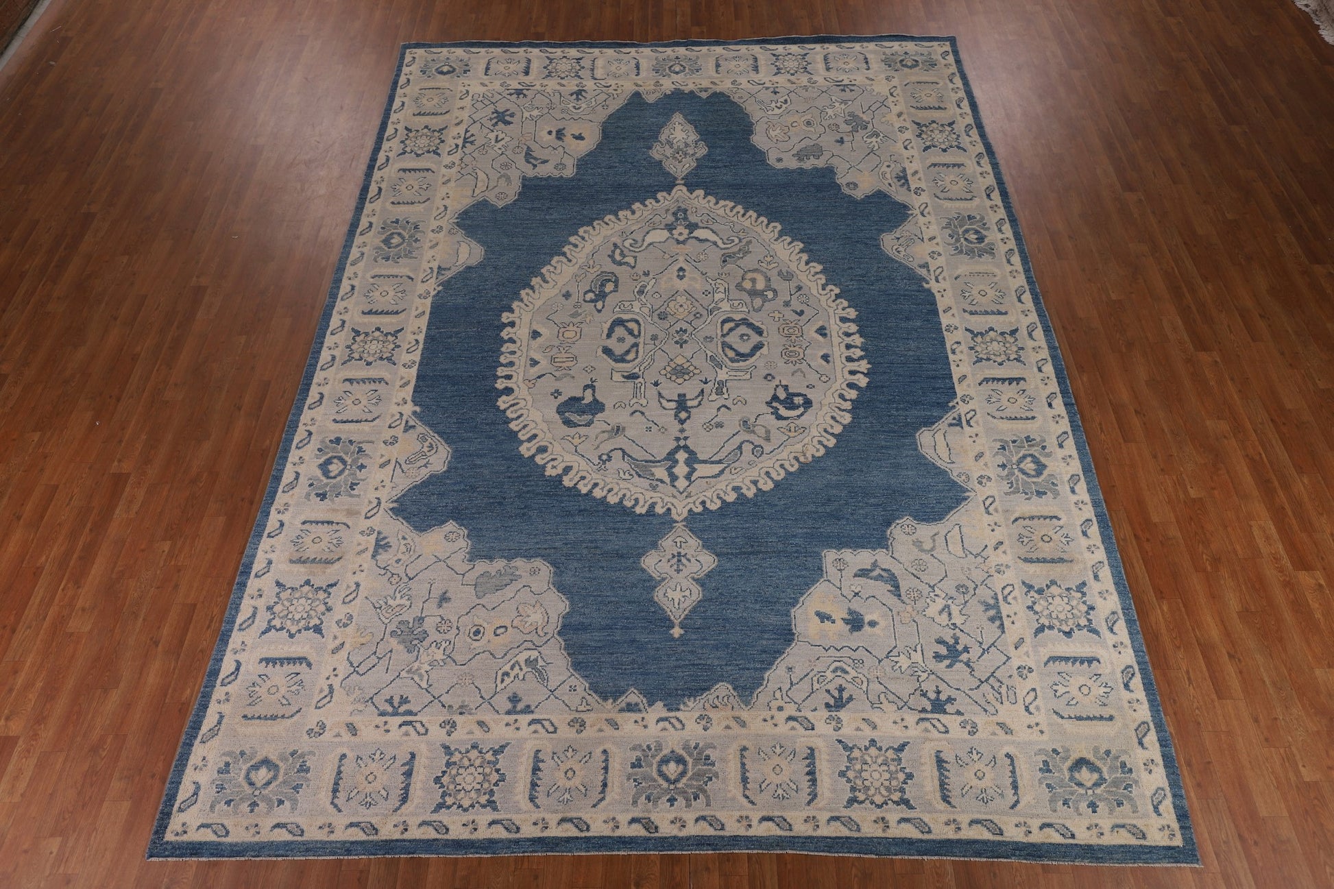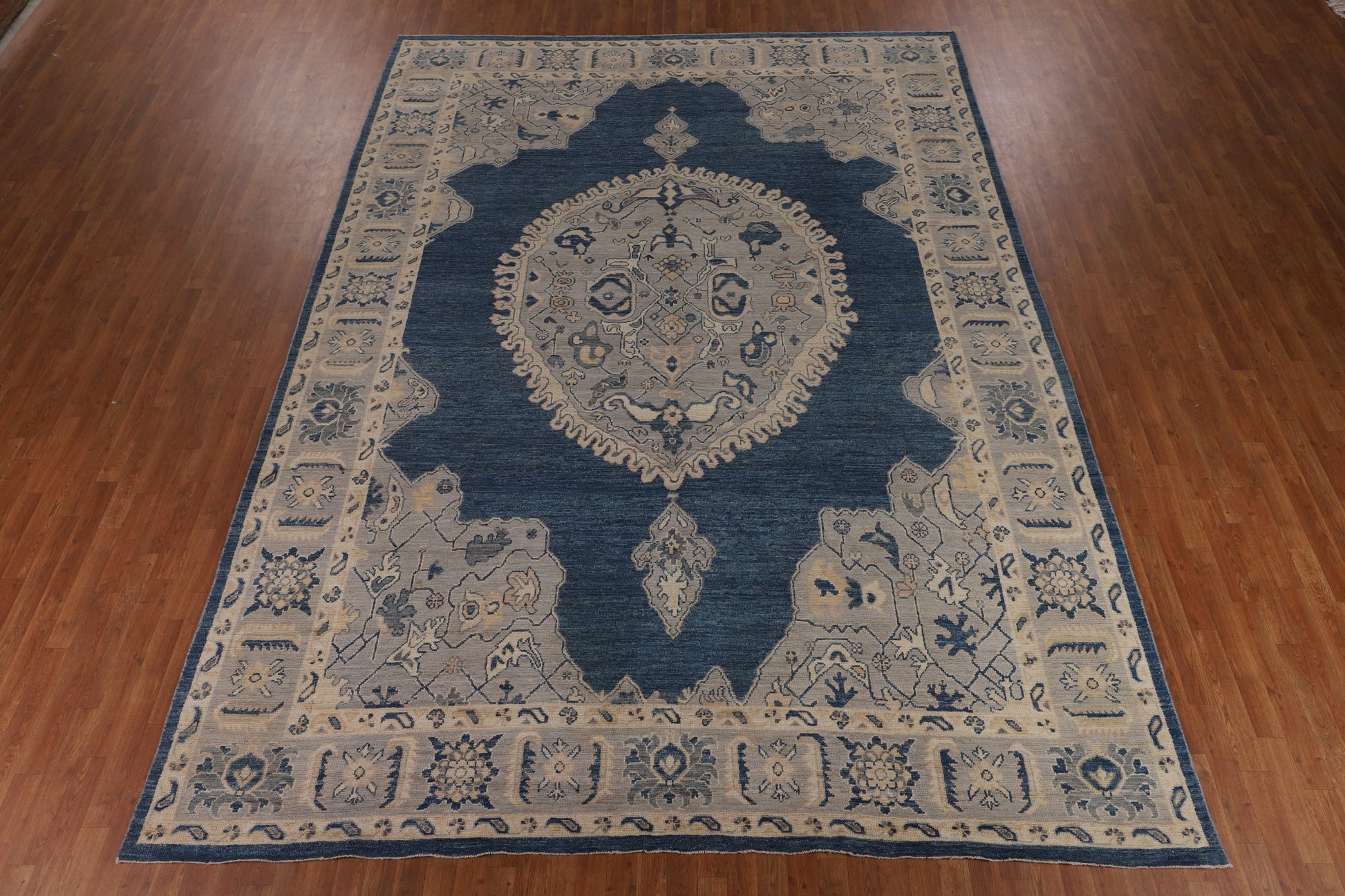 A Beautiful Genuine Turkey Oushak rug is Hand Knotted by skillful weavers in Turkey with 100% Wool Material. This rug is in New, First Quality condition. dimensions are 13' 10'' X 9' 10'' in foot and 422 X 300 in centimeter. the primary color is Navy Blue & Blues.