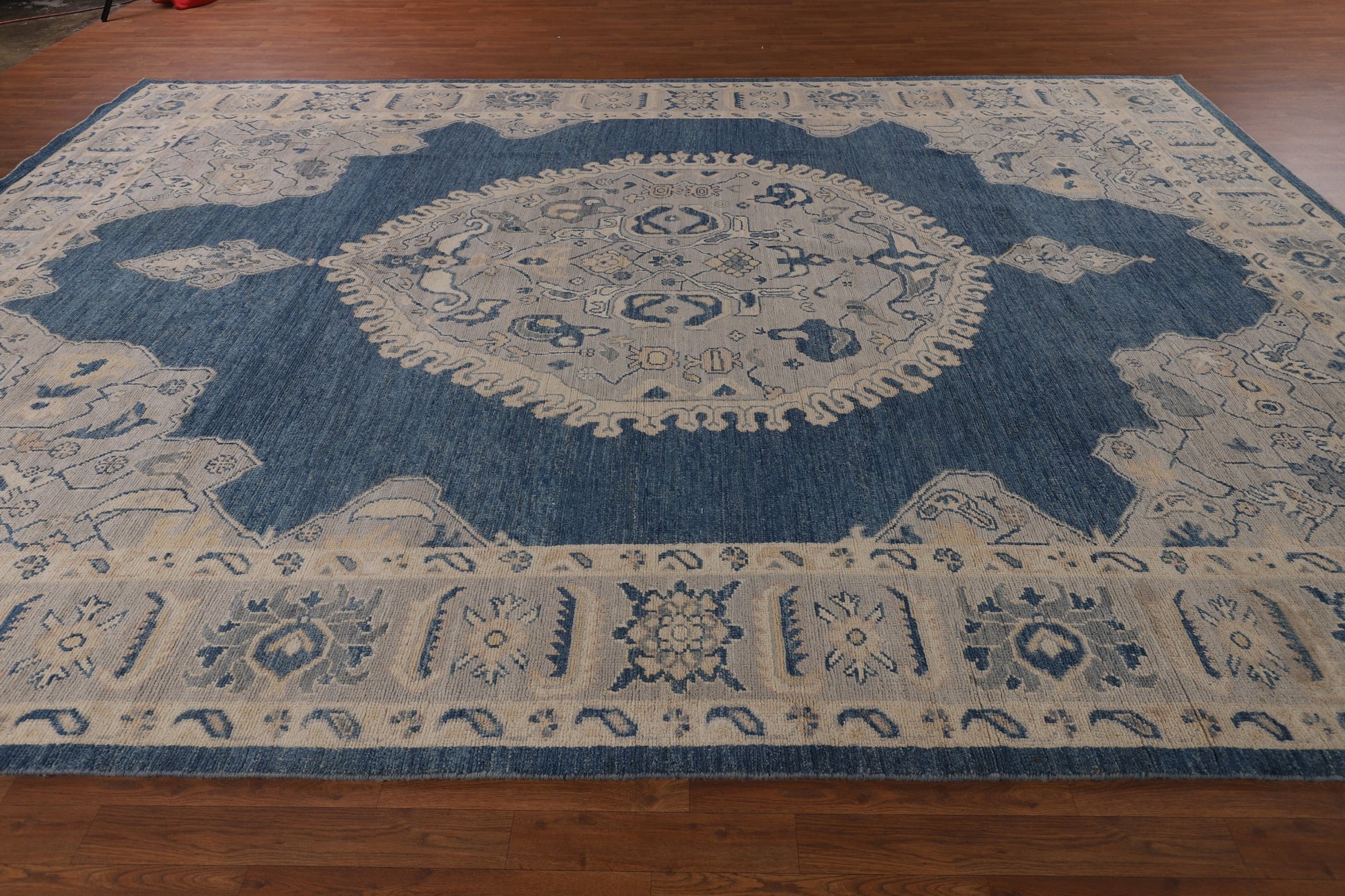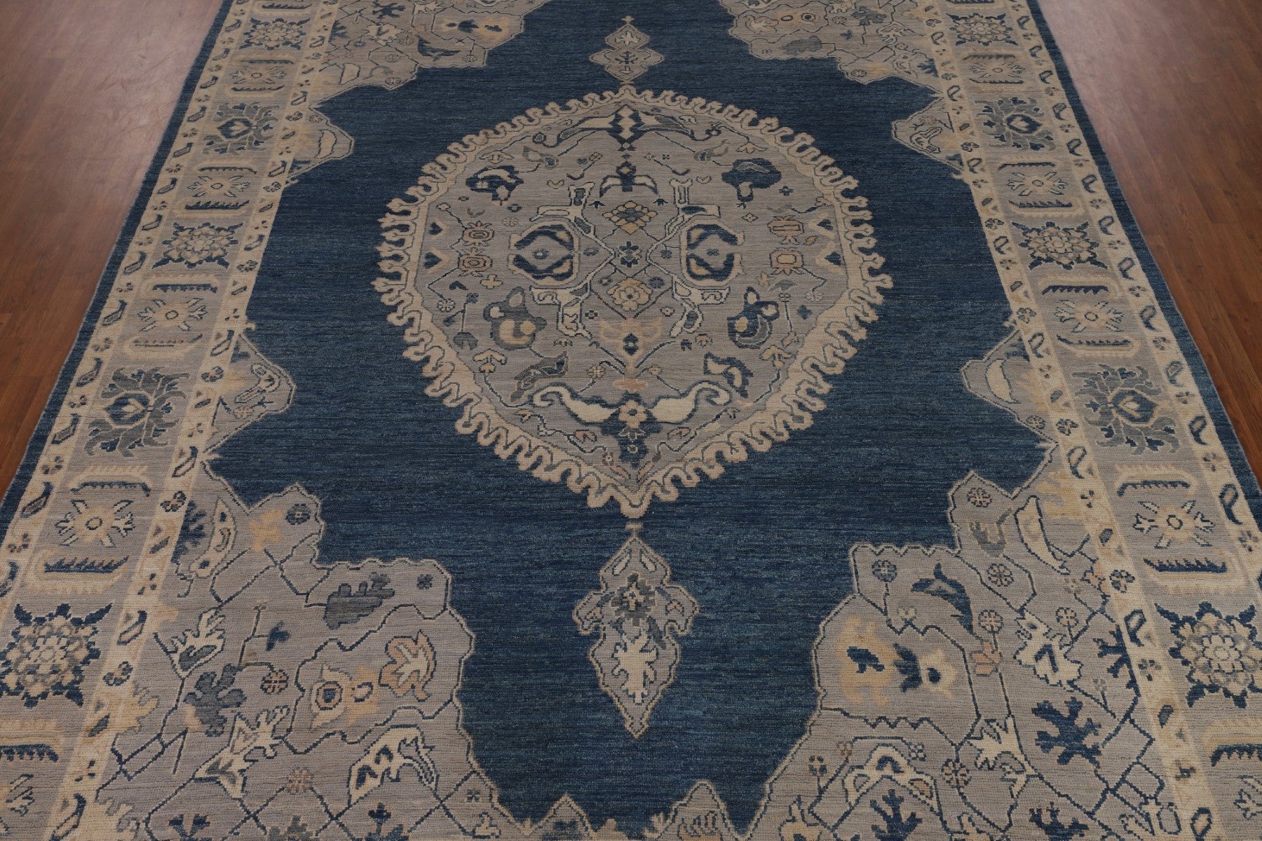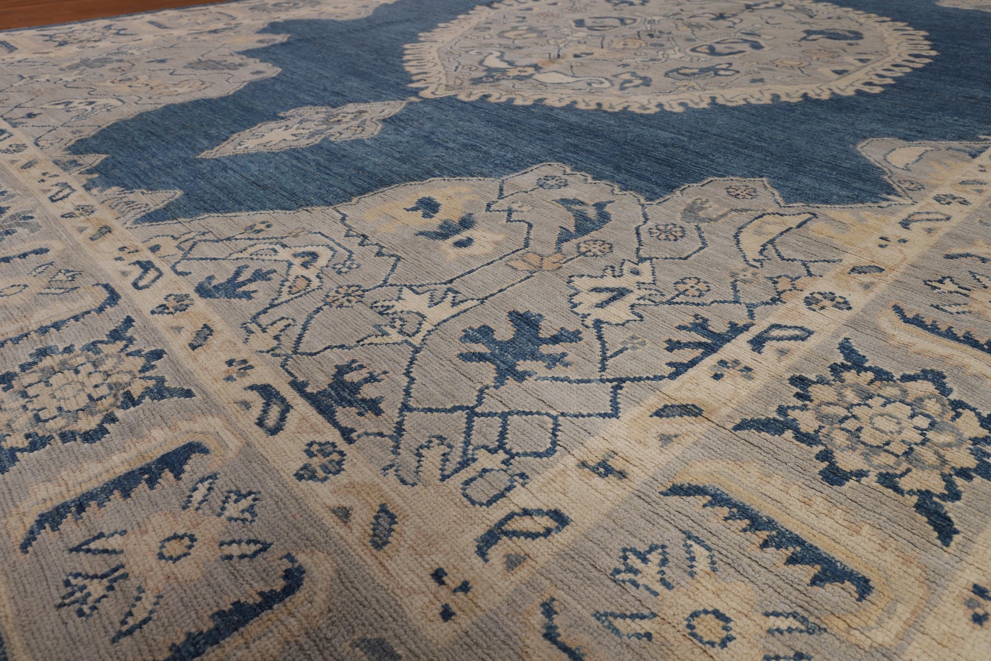 A Beautiful Genuine Turkey Oushak rug is Hand Knotted by skillful weavers in Turkey with 100% Wool Material. This rug is in New, First Quality condition. dimensions are 13' 10'' X 9' 10'' in foot and 422 X 300 in centimeter. the primary color is Navy Blue & Blues.