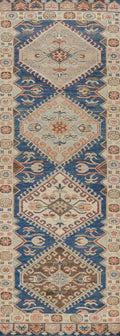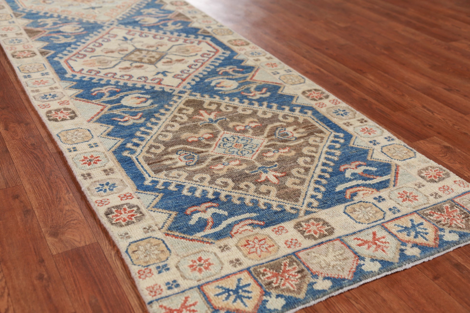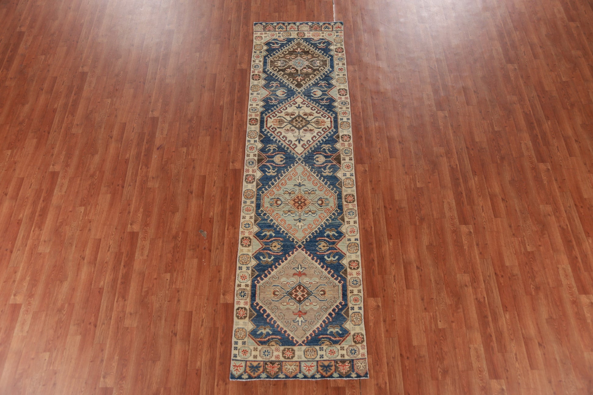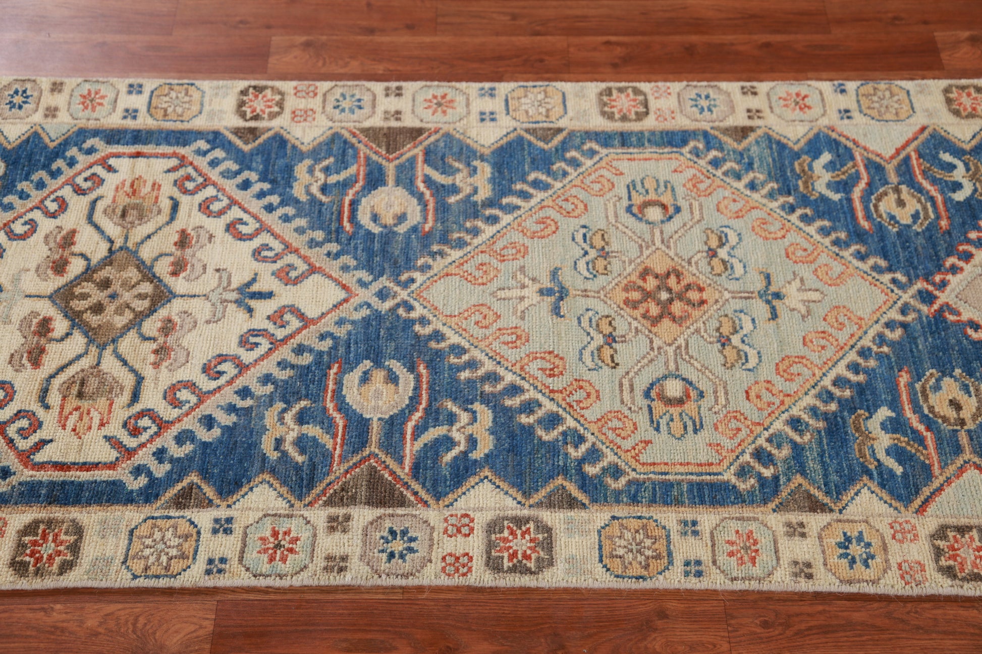 Blue Geometric Oushak Vegetable Dye Runner Rug 3x10
