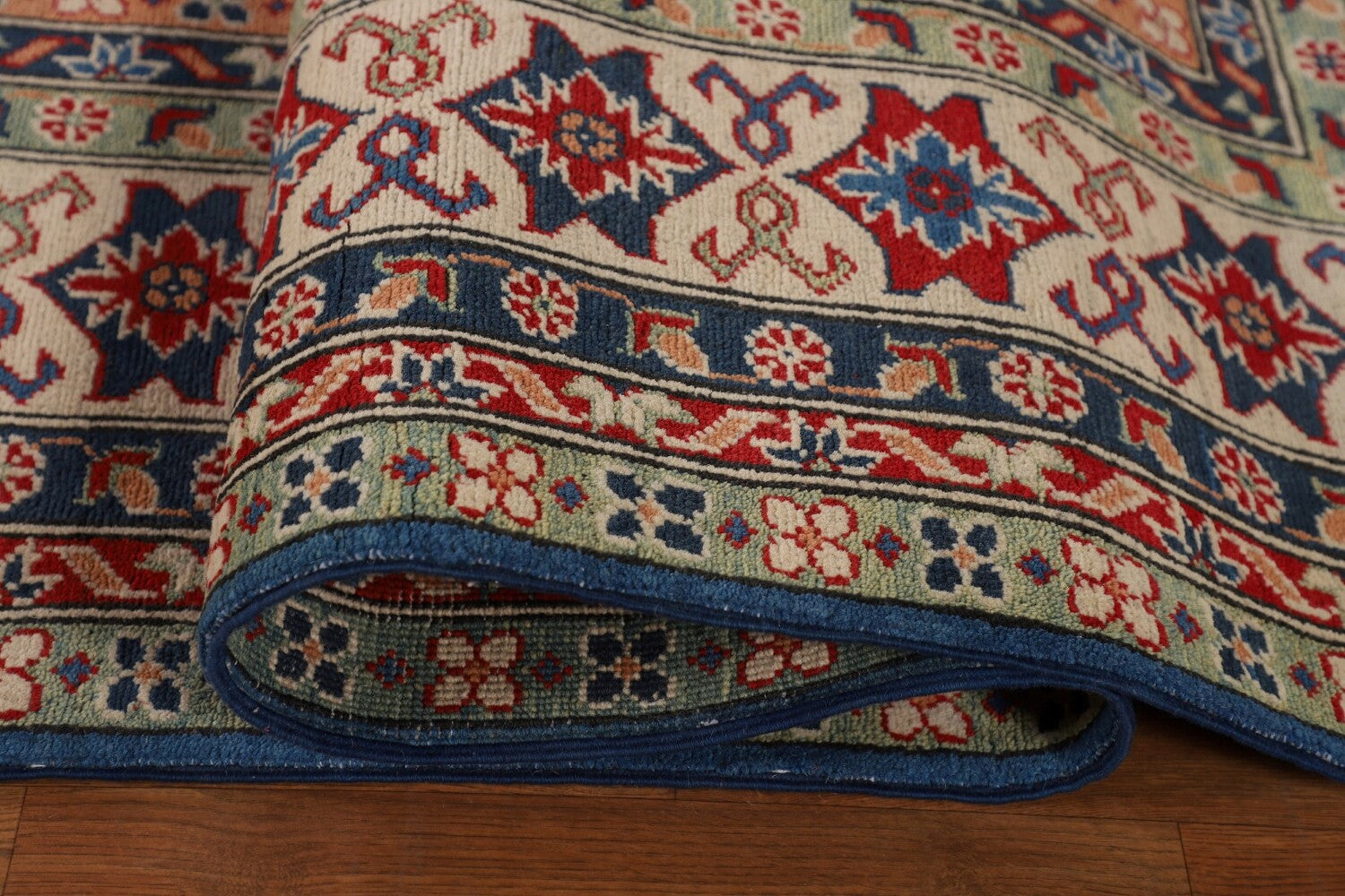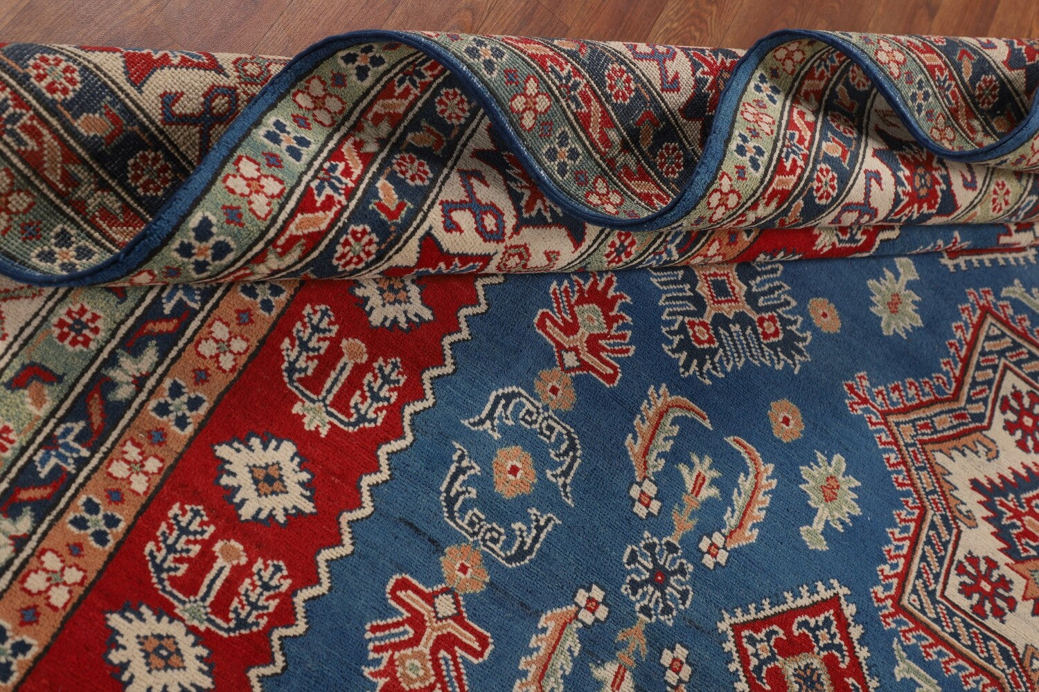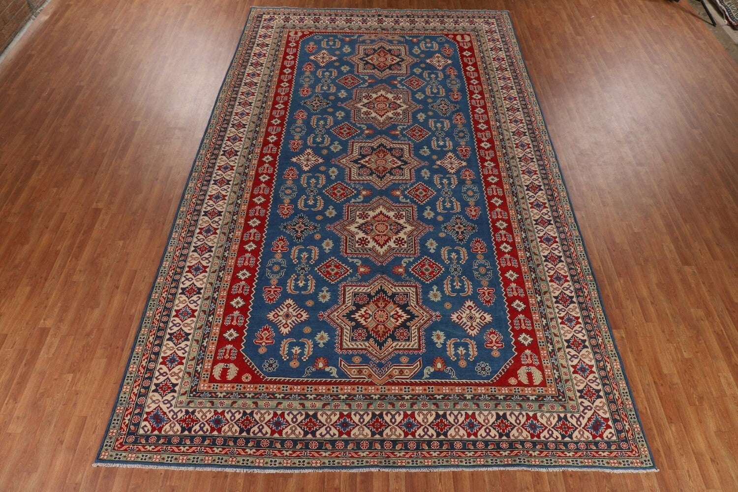 A Beautiful Genuine Pakistan Kazak rug is Hand Knotted by skillful weavers in Pakistan with 100% Wool Material. This rug is in New, First Quality condition. dimensions are 15' 7'' X 9' 8'' in foot and 475 X 295 in centimeter. the primary color is Navy Blue & Blues.