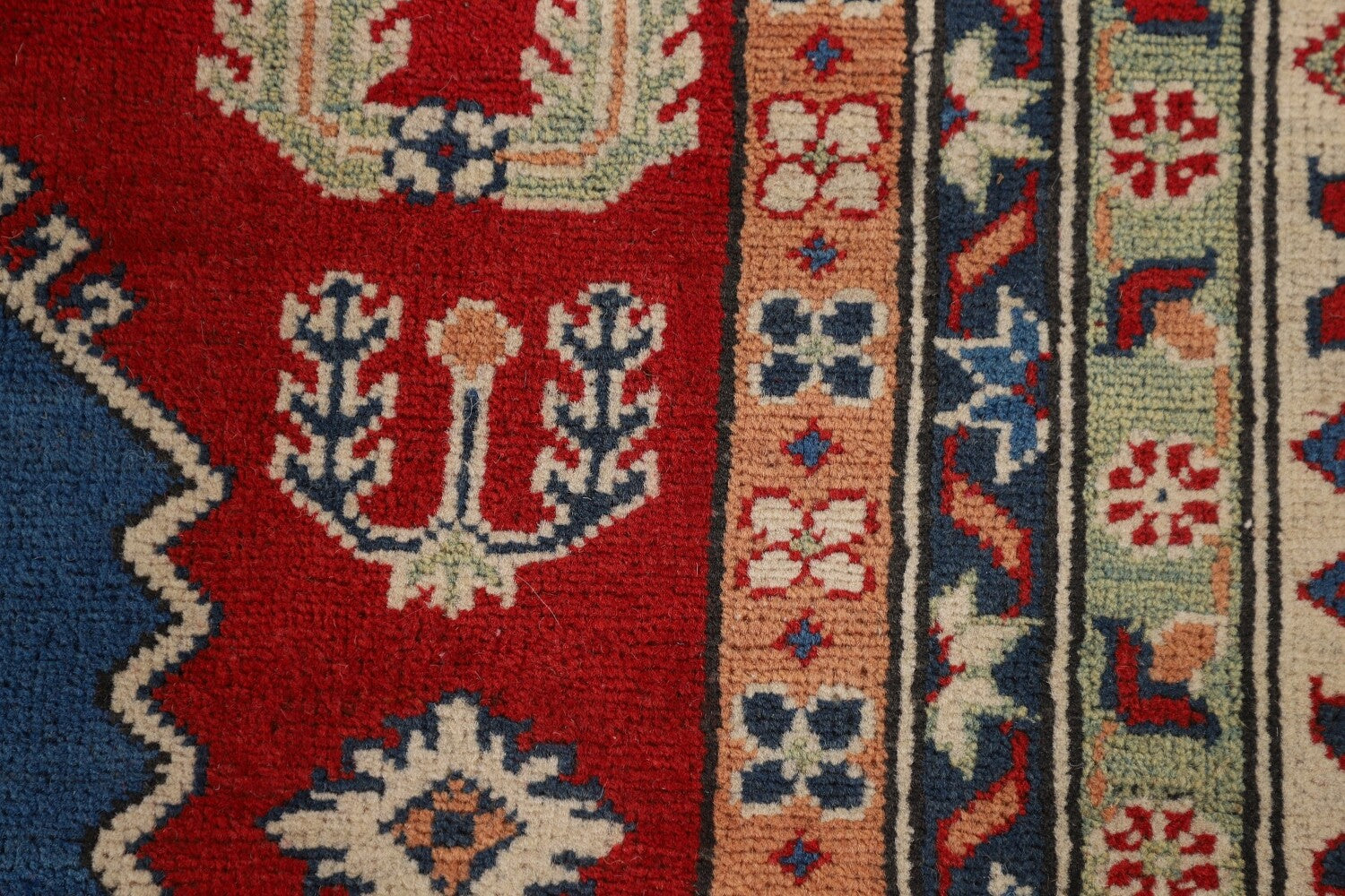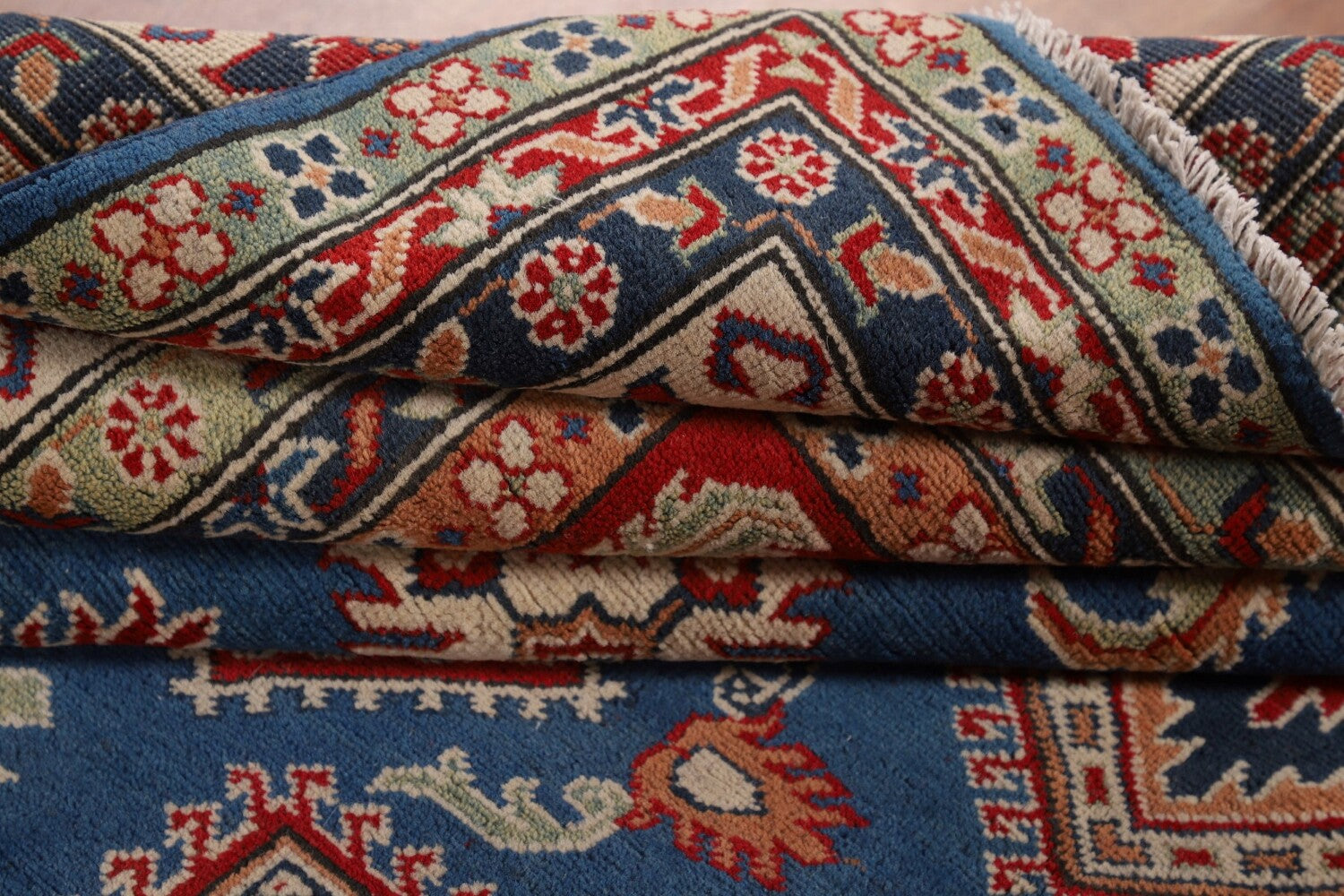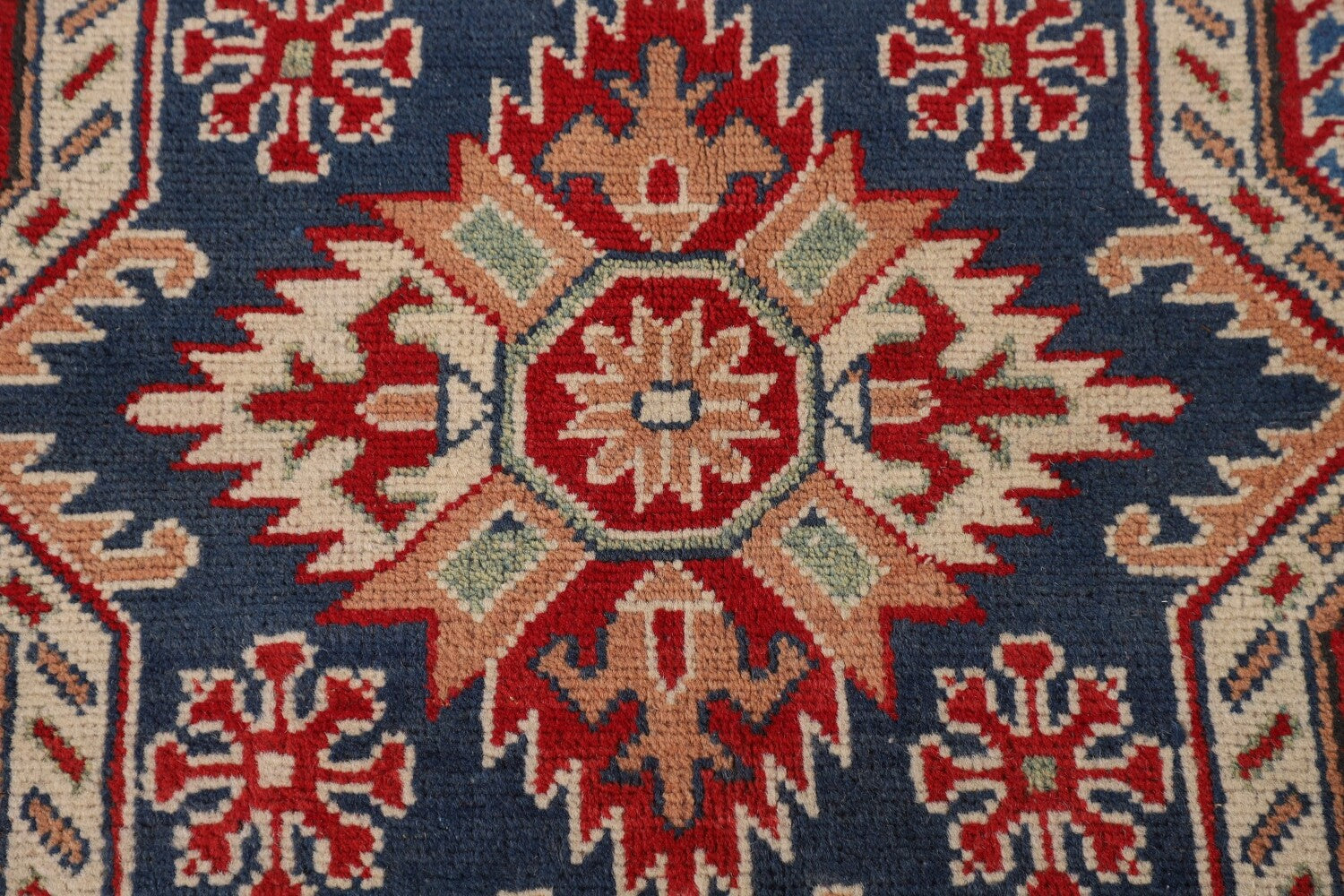 A Beautiful Genuine Pakistan Kazak rug is Hand Knotted by skillful weavers in Pakistan with 100% Wool Material. This rug is in New, First Quality condition. dimensions are 15' 7'' X 9' 8'' in foot and 475 X 295 in centimeter. the primary color is Navy Blue & Blues.