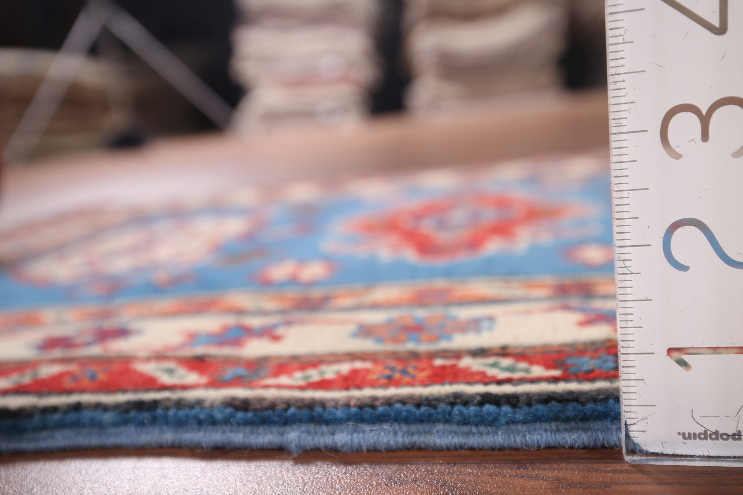 A Beautiful Genuine Pakistan Kazak rug is Hand Knotted by skillful weavers in Pakistan with 100% Wool Material. This rug is in New, First Quality condition. dimensions are 3' 1'' X 2' 0'' in foot and 94 X 61 in centimeter. the primary color is Navy Blue & Blues.