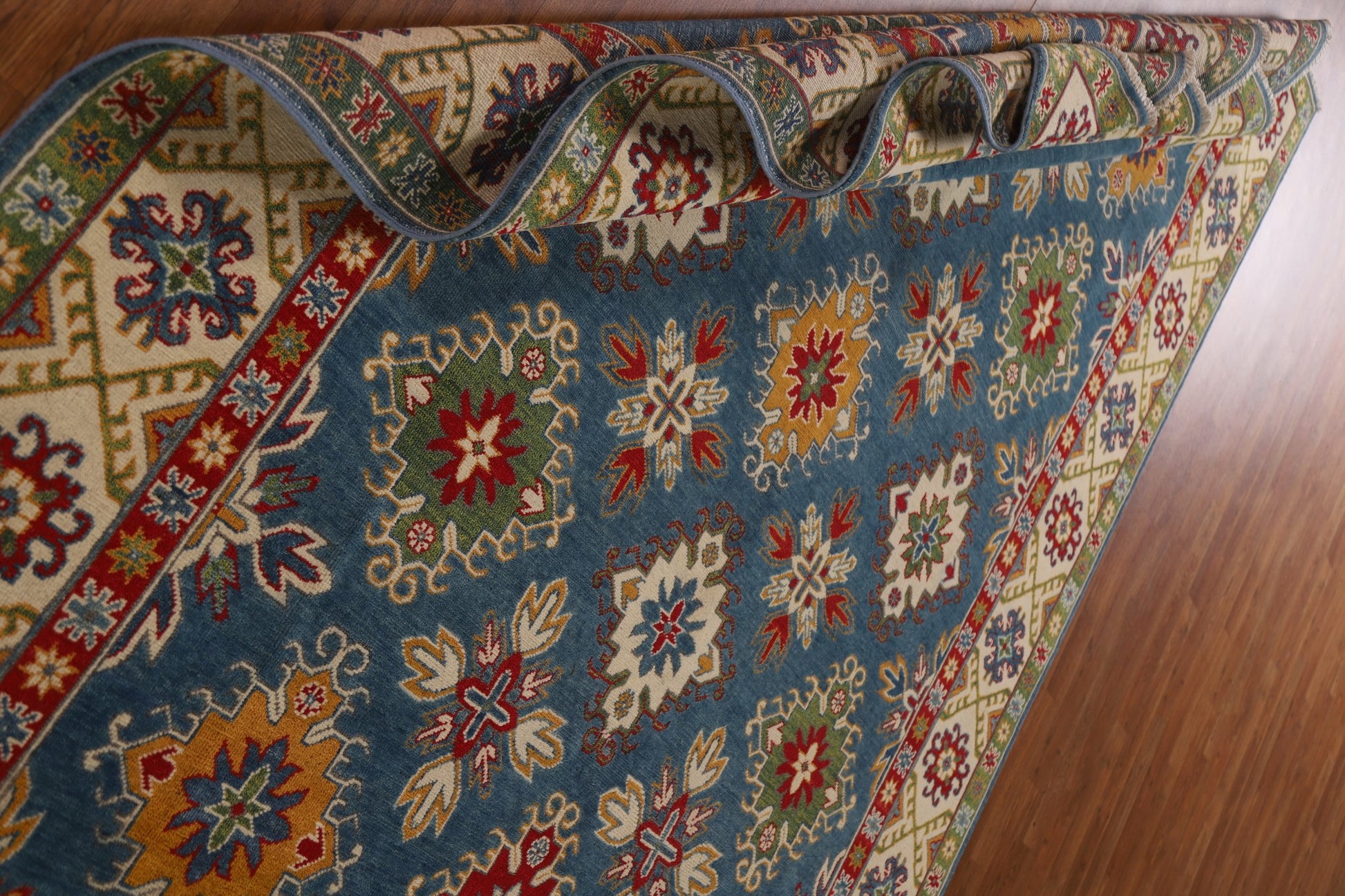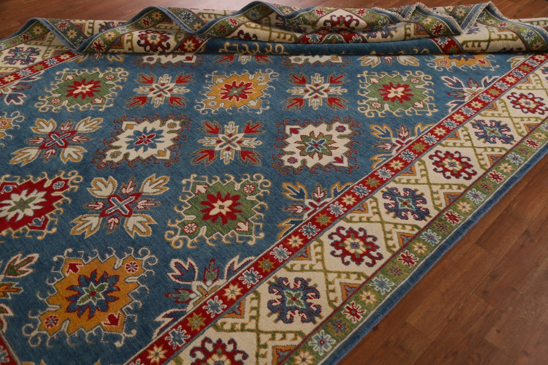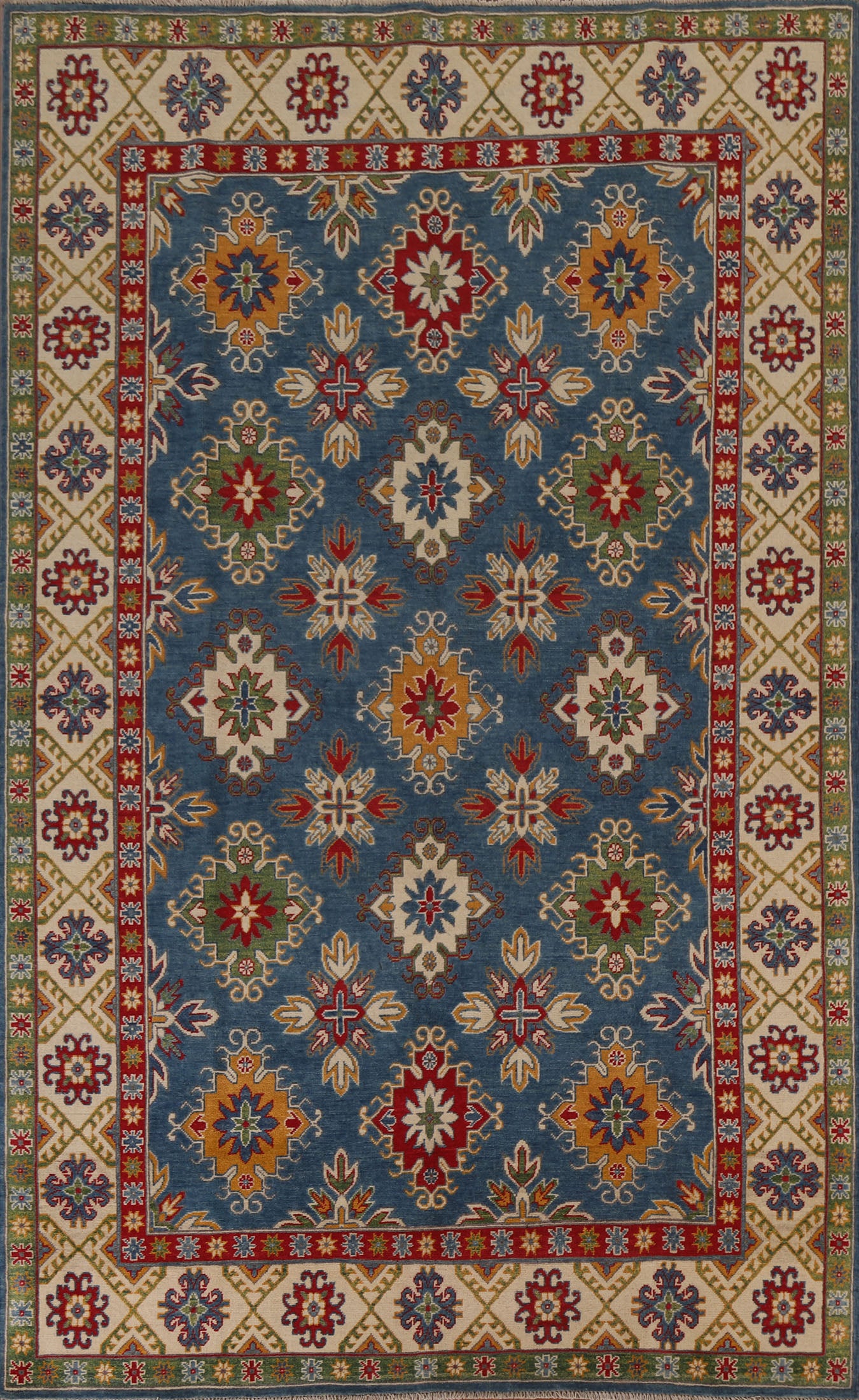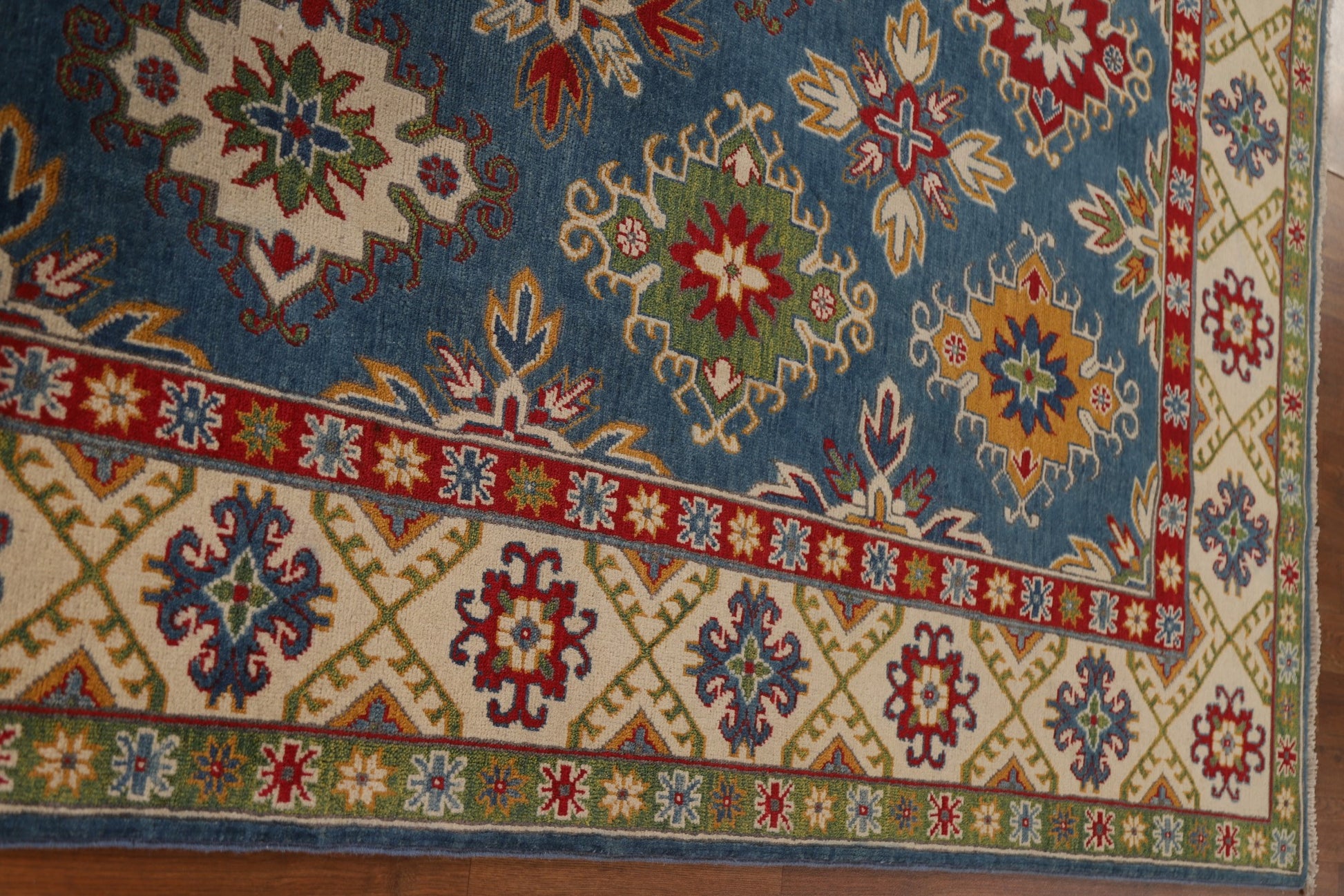 A Beautiful Genuine Pakistan Kazak rug is Hand Knotted by skillful weavers in Pakistan with 100% Wool Material. This rug is in condition. dimensions are 9' 7'' X 6' 9'' in foot and 292 X 206 in centimeter. the primary color is Navy Blue & Blues.