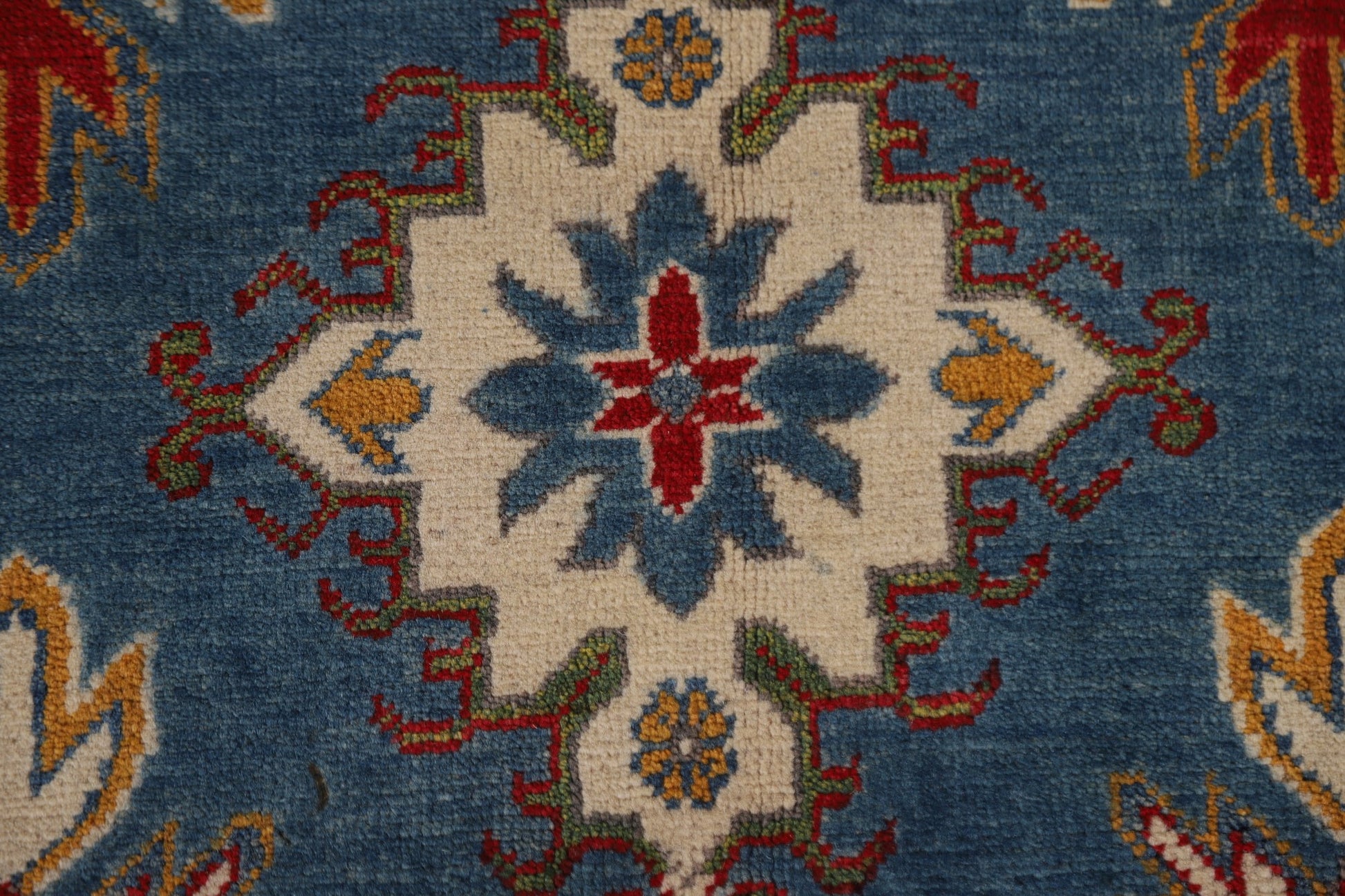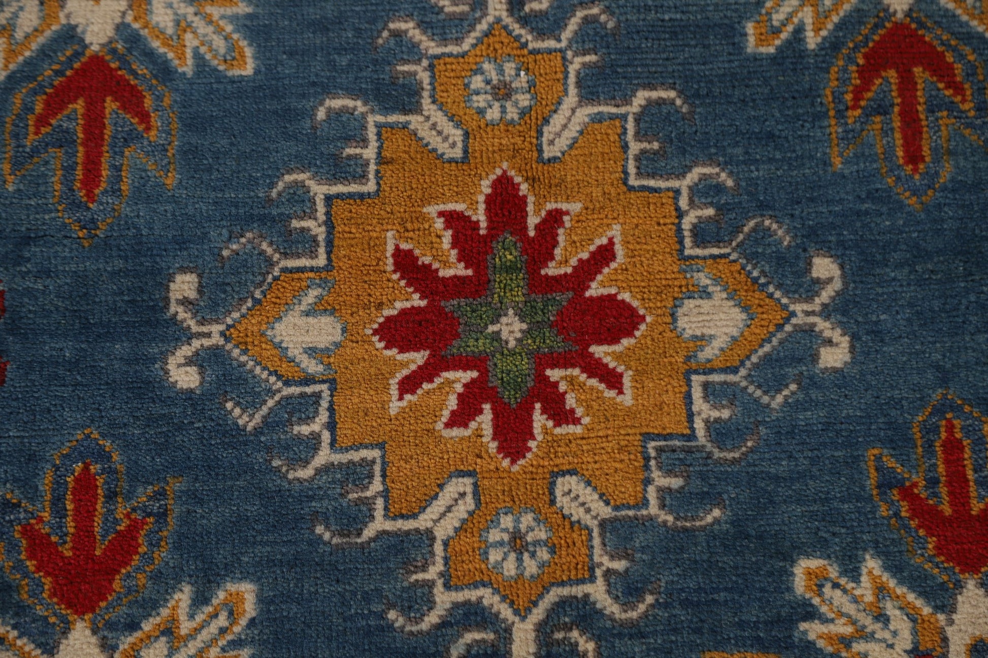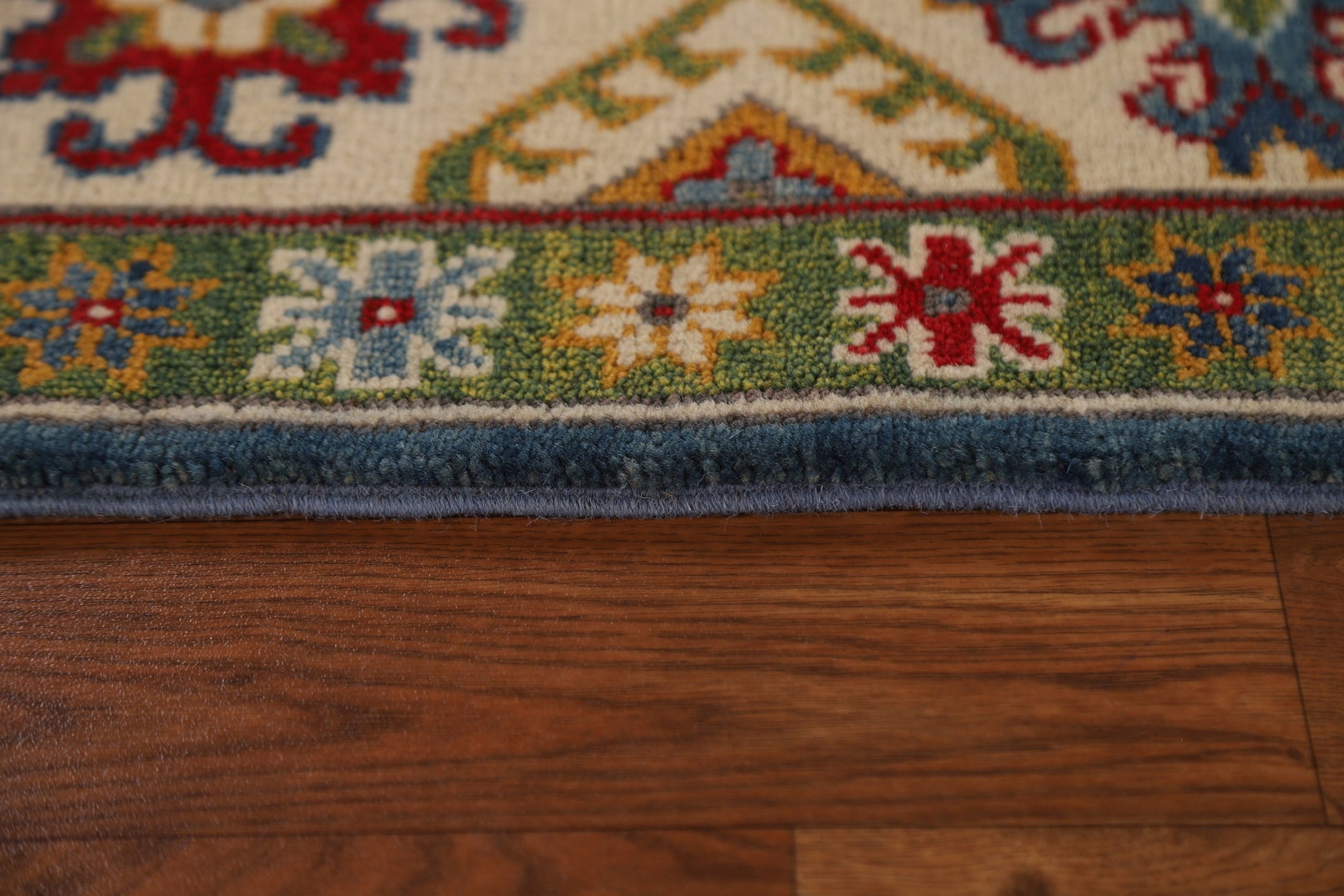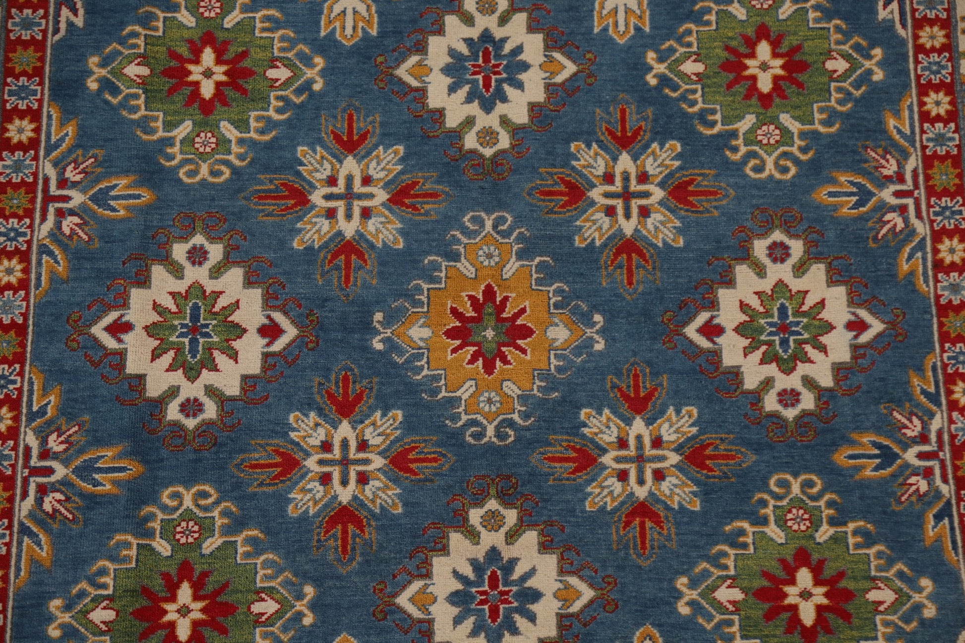 A Beautiful Genuine Pakistan Kazak rug is Hand Knotted by skillful weavers in Pakistan with 100% Wool Material. This rug is in condition. dimensions are 9' 7'' X 6' 9'' in foot and 292 X 206 in centimeter. the primary color is Navy Blue & Blues.