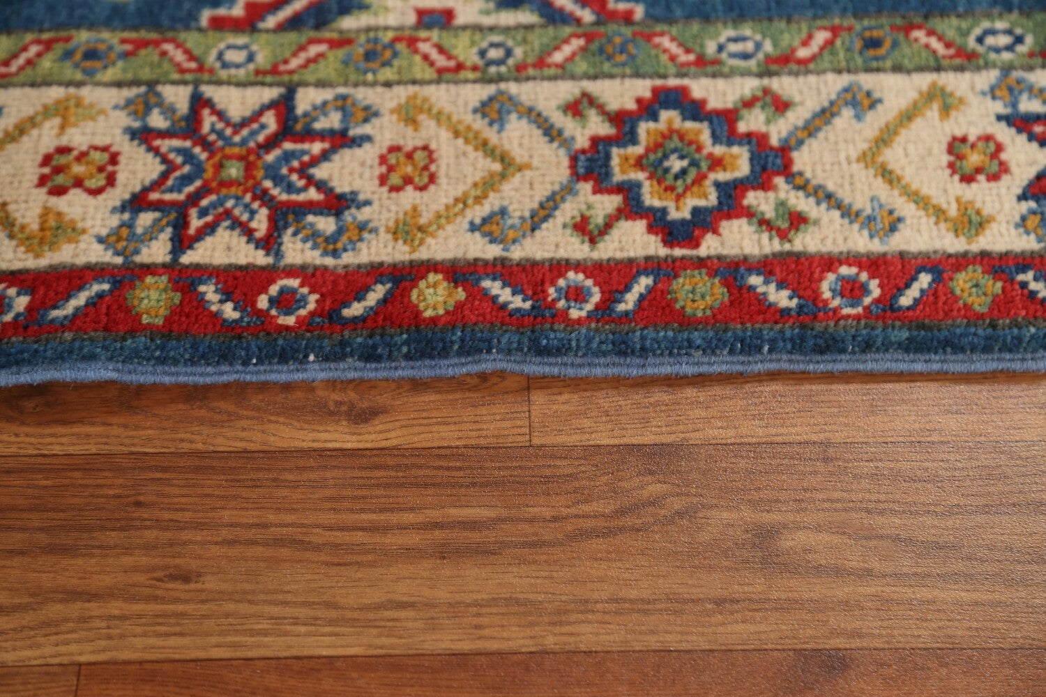 A Beautiful Genuine Pakistan Kazak rug is Hand Knotted by skillful weavers in Pakistan with 100% Wool Material. This rug is in condition. dimensions are 9' 6'' X 2' 8'' in foot and 290 X 81 in centimeter. the primary color is Navy Blue & Blues.