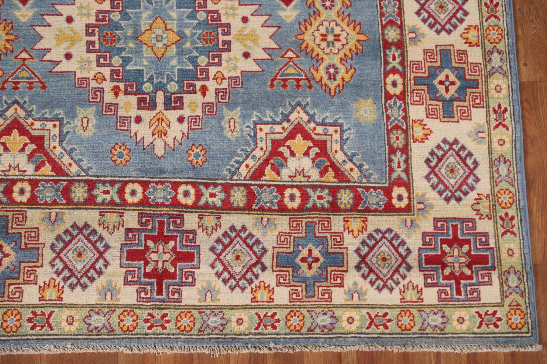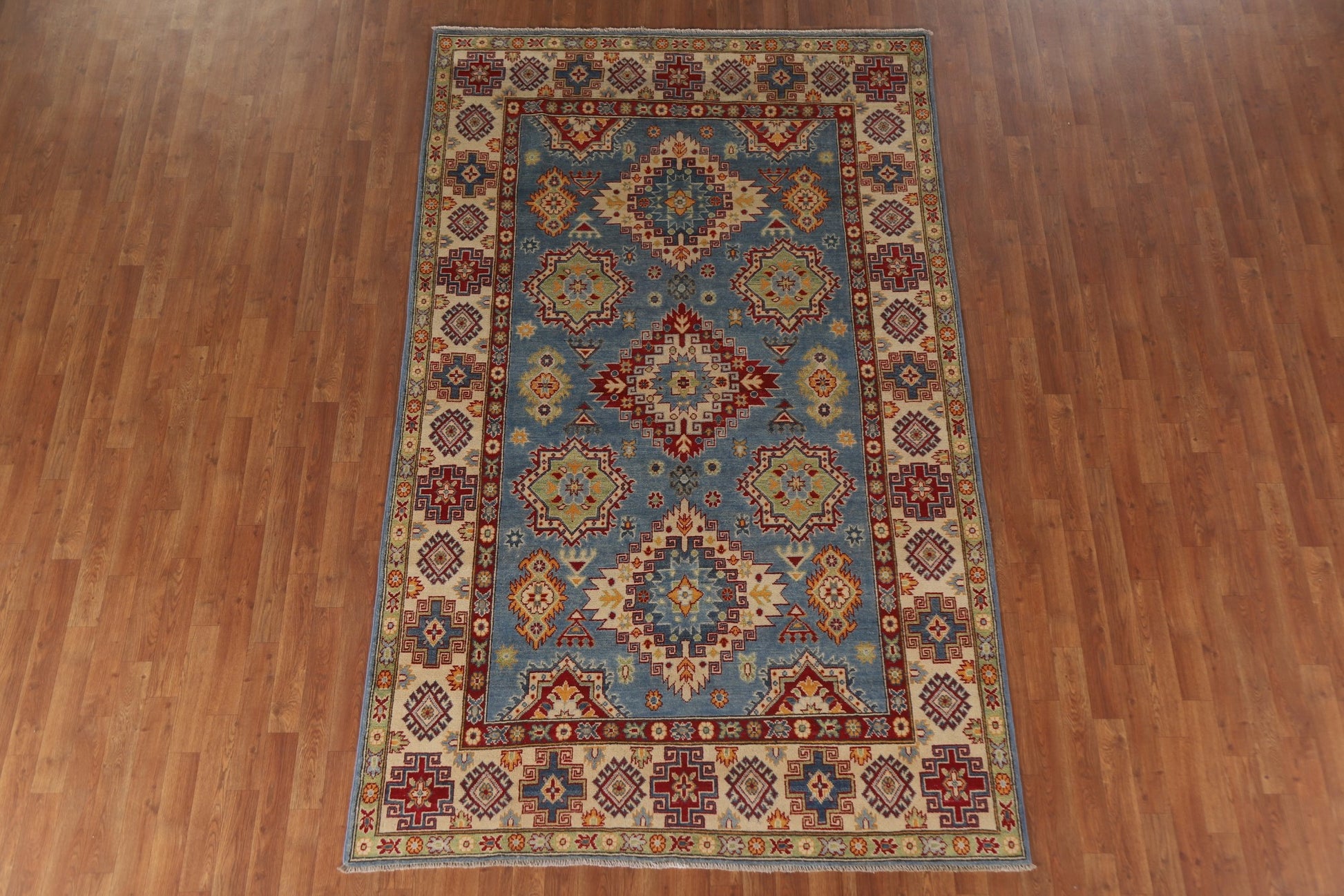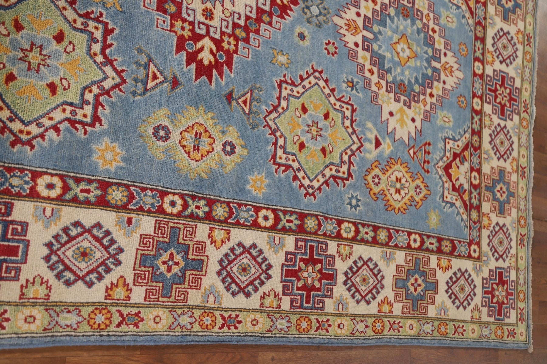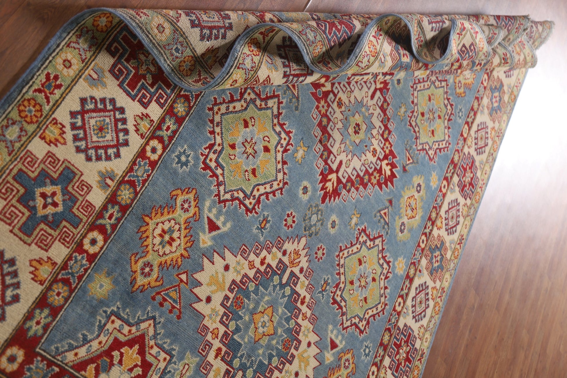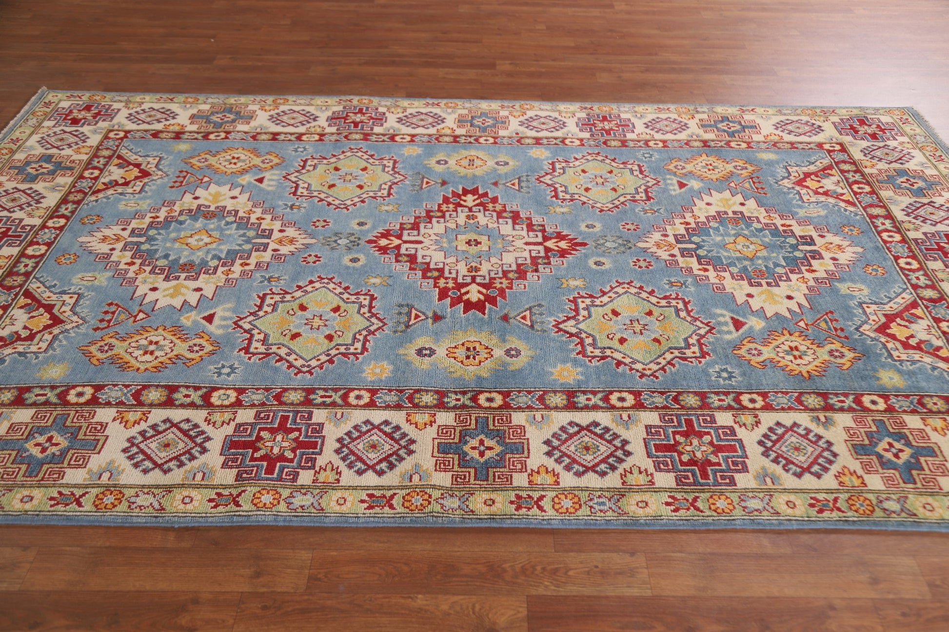 A Beautiful Genuine Pakistan Kazak rug is Hand Knotted by skillful weavers in Pakistan with 100% Wool Material. This rug is in New, First Quality condition. dimensions are 9' 4'' X 5' 8'' in foot and 284 X 173 in centimeter. the primary color is Navy Blue & Blues.