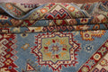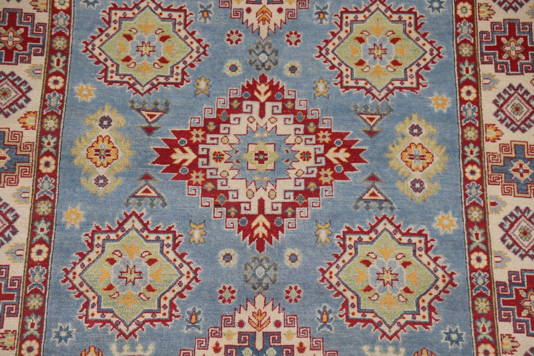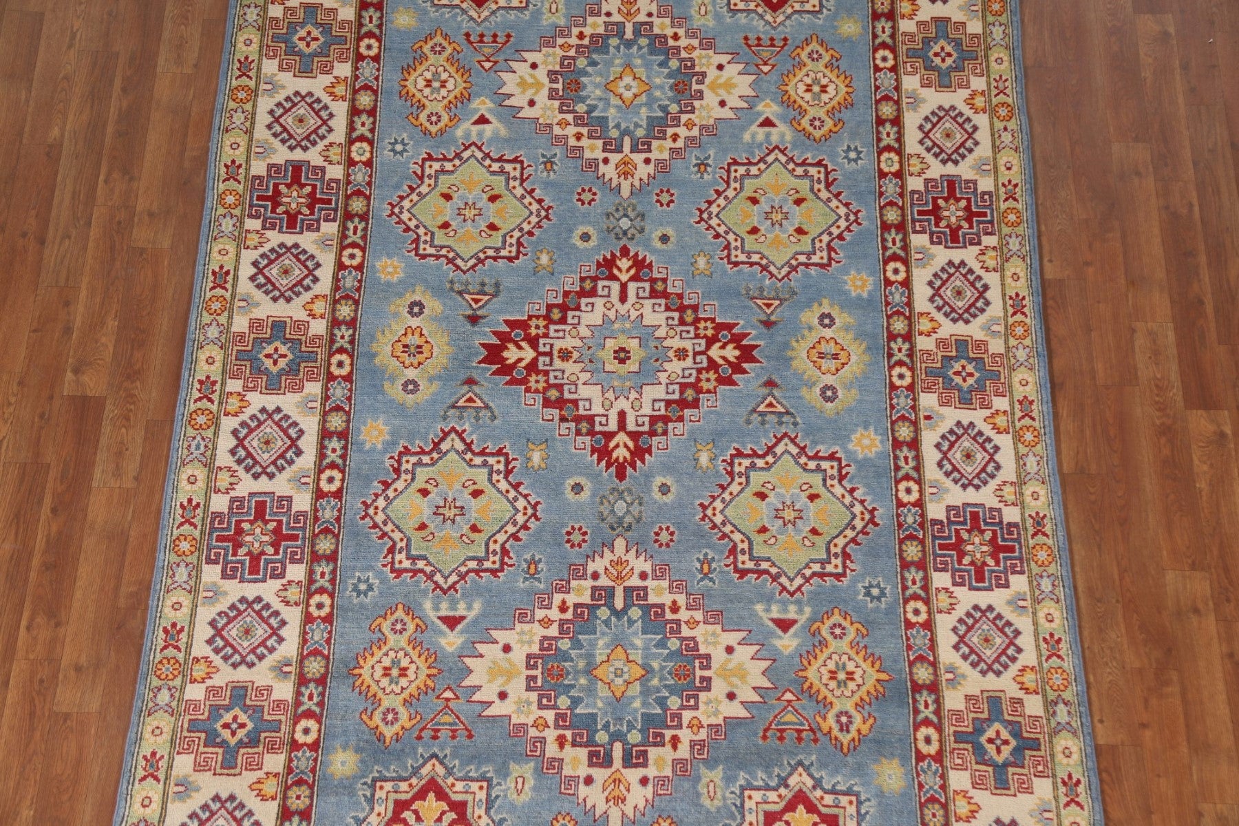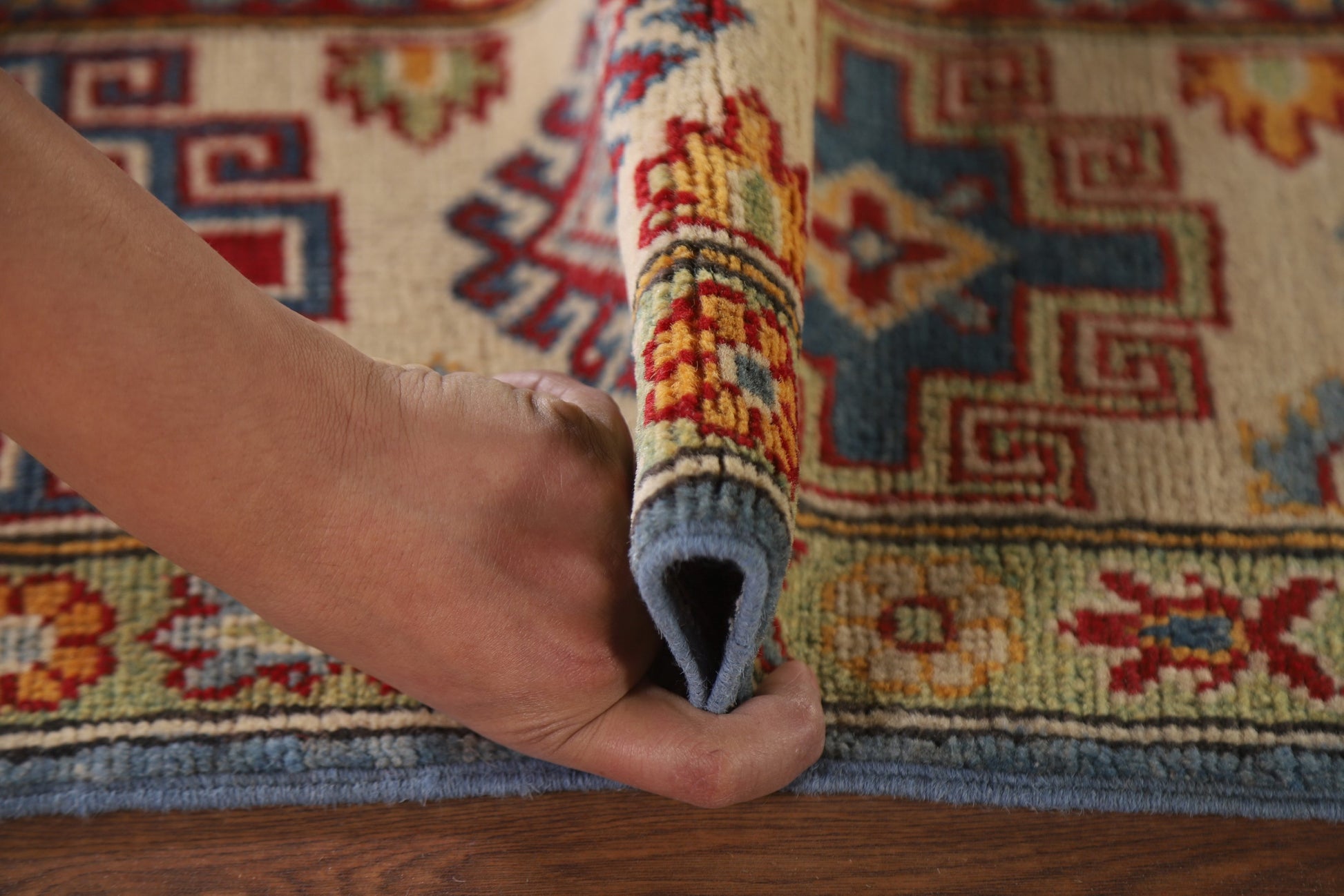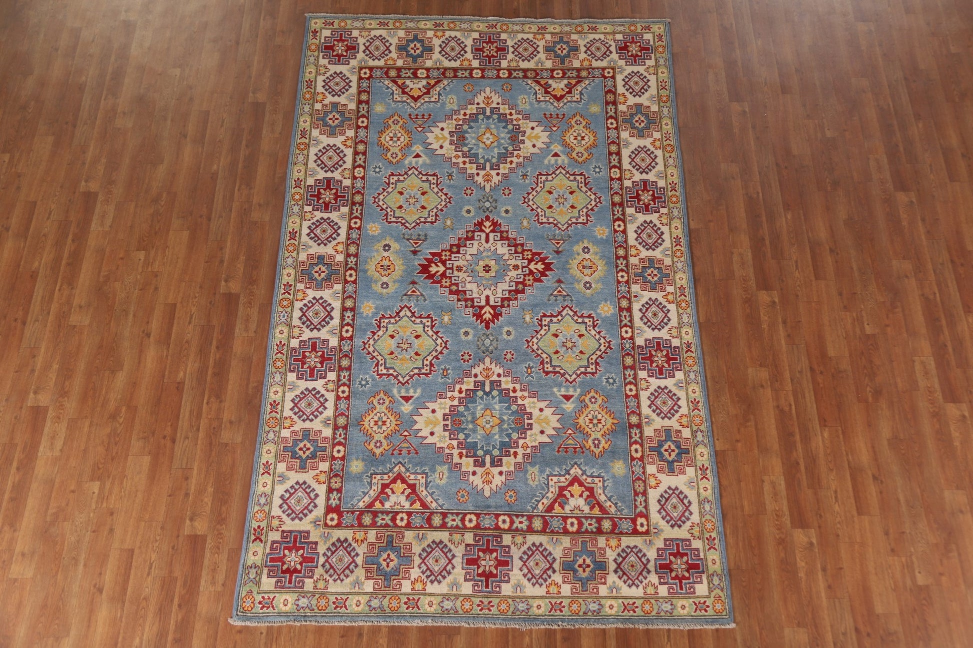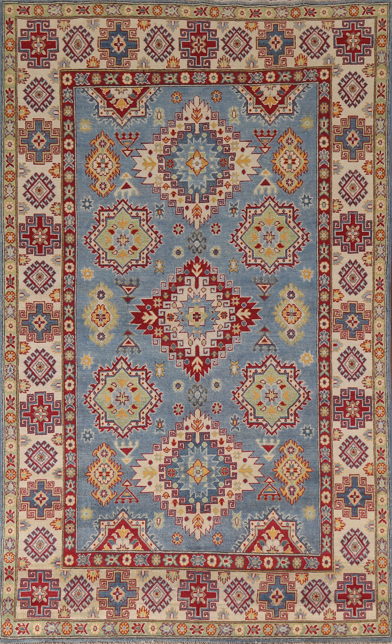 A Beautiful Genuine Pakistan Kazak rug is Hand Knotted by skillful weavers in Pakistan with 100% Wool Material. This rug is in New, First Quality condition. dimensions are 9' 4'' X 5' 8'' in foot and 284 X 173 in centimeter. the primary color is Navy Blue & Blues.