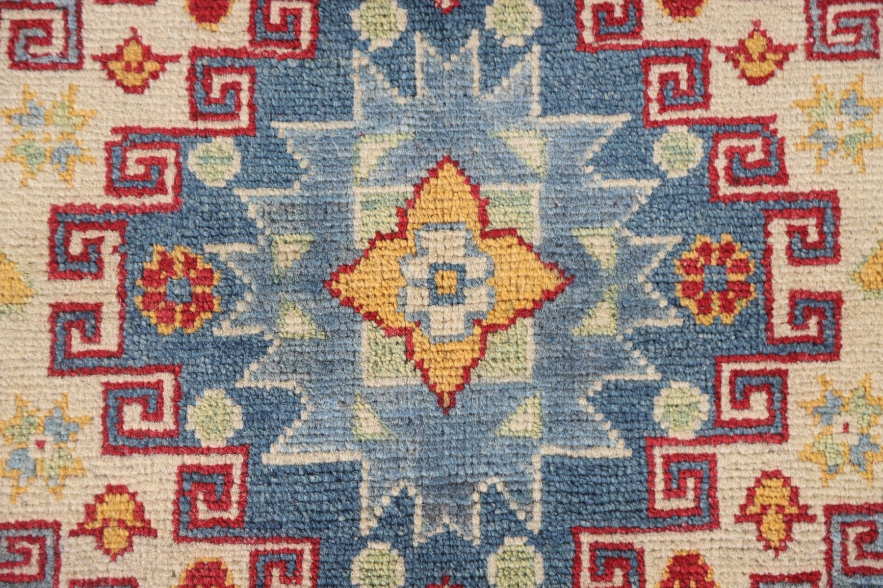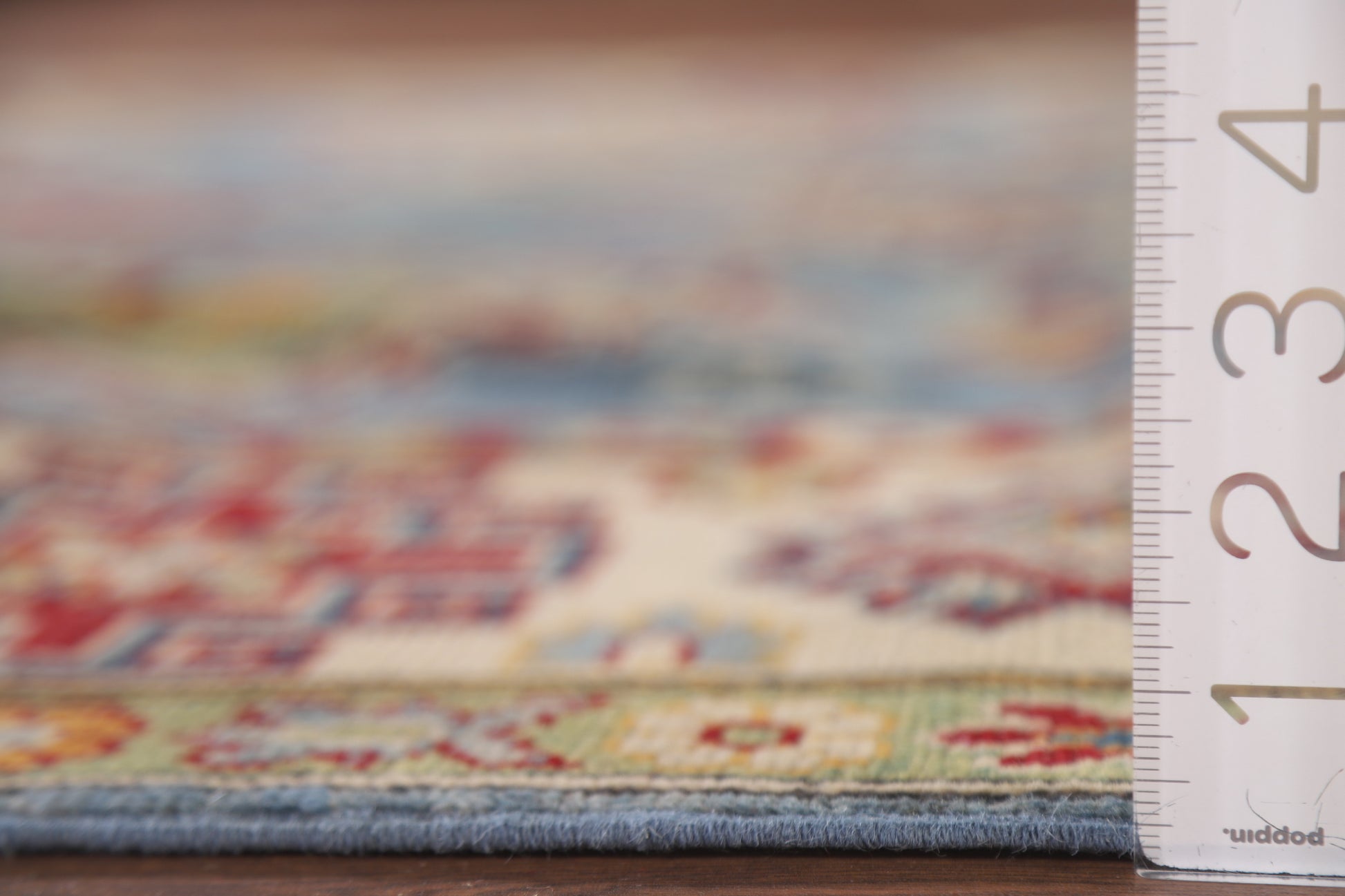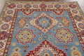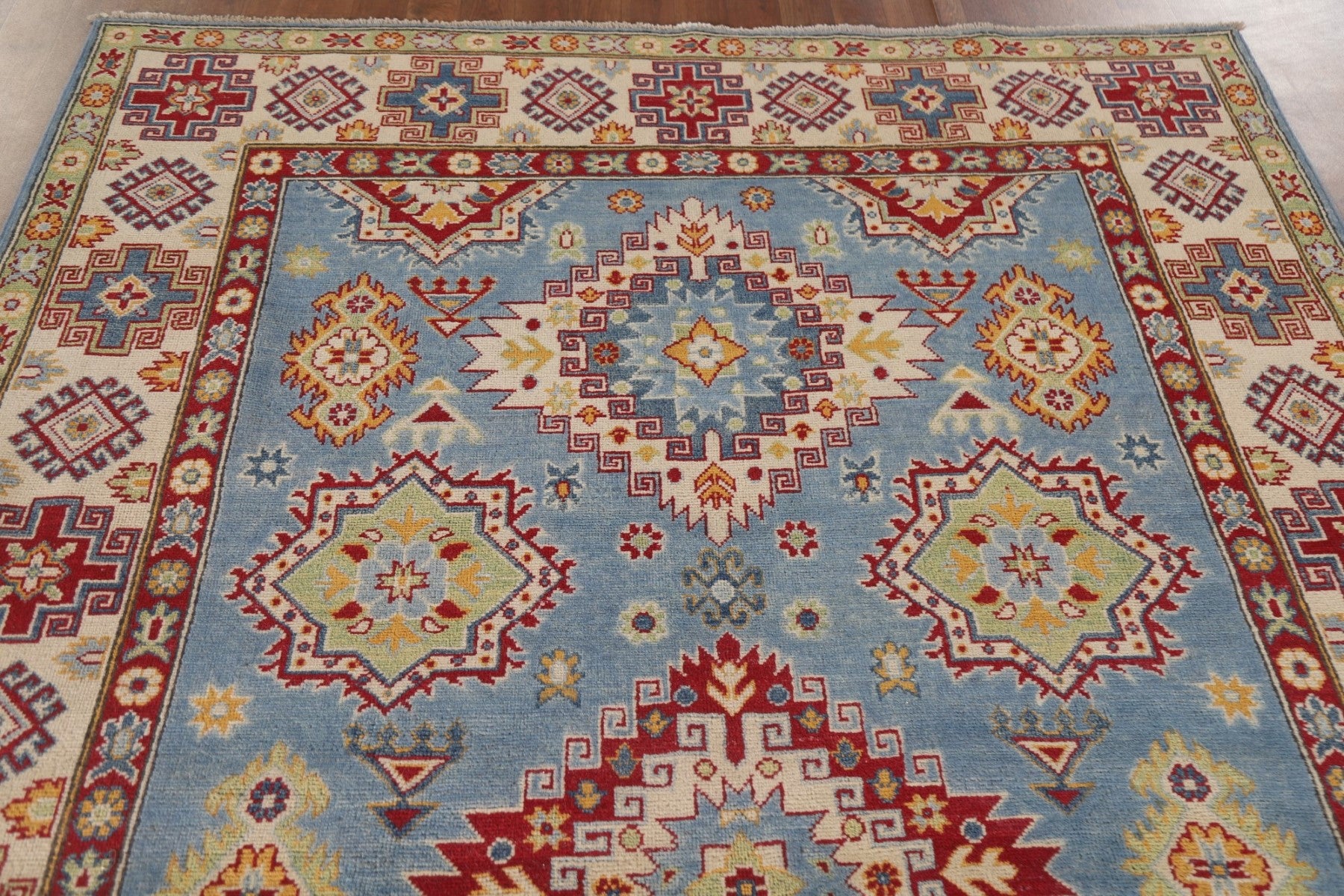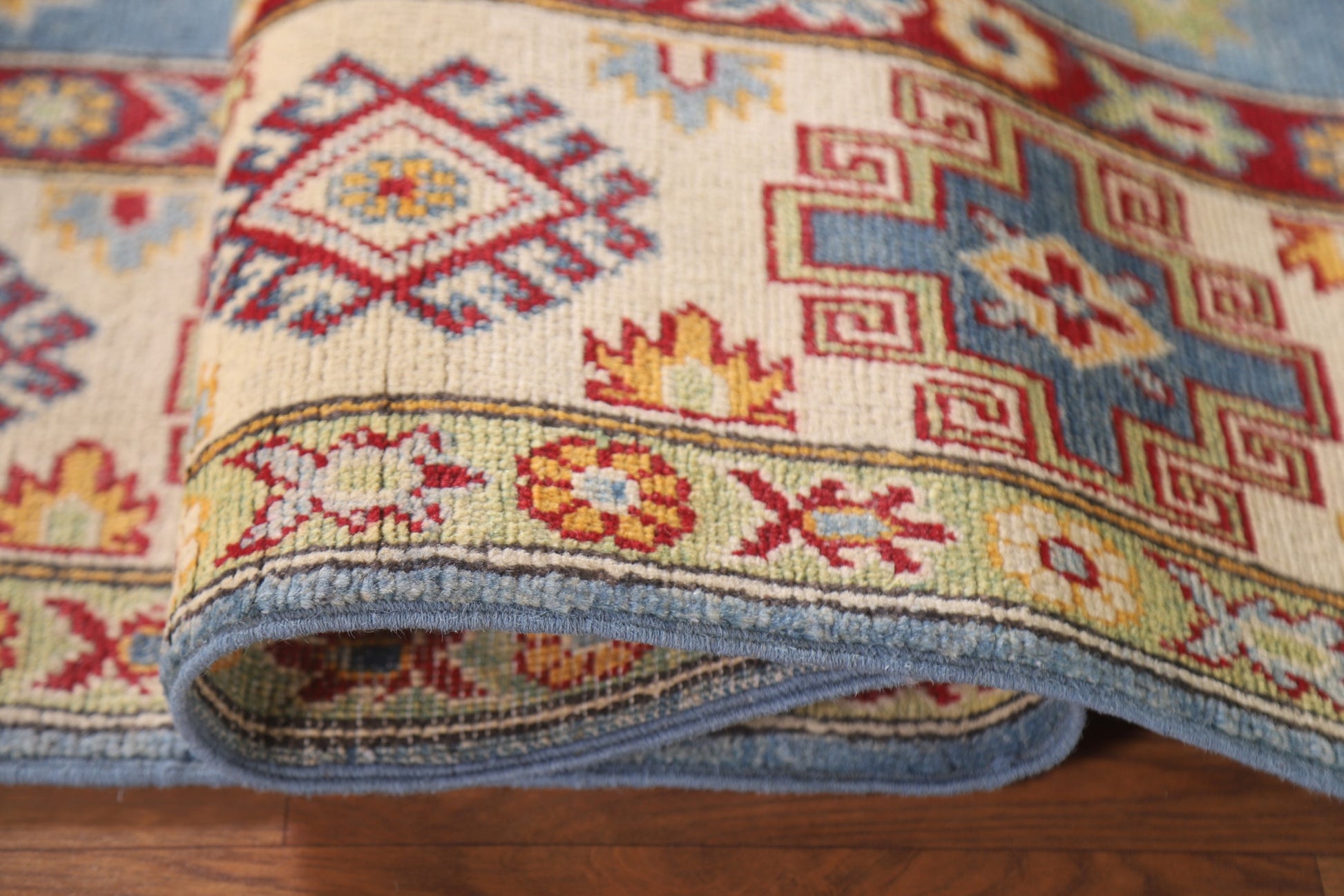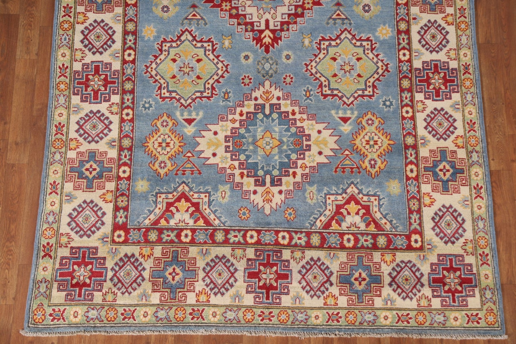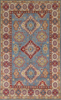 A Beautiful Genuine Pakistan Kazak rug is Hand Knotted by skillful weavers in Pakistan with 100% Wool Material. This rug is in New, First Quality condition. dimensions are 9' 4'' X 5' 8'' in foot and 284 X 173 in centimeter. the primary color is Navy Blue & Blues.