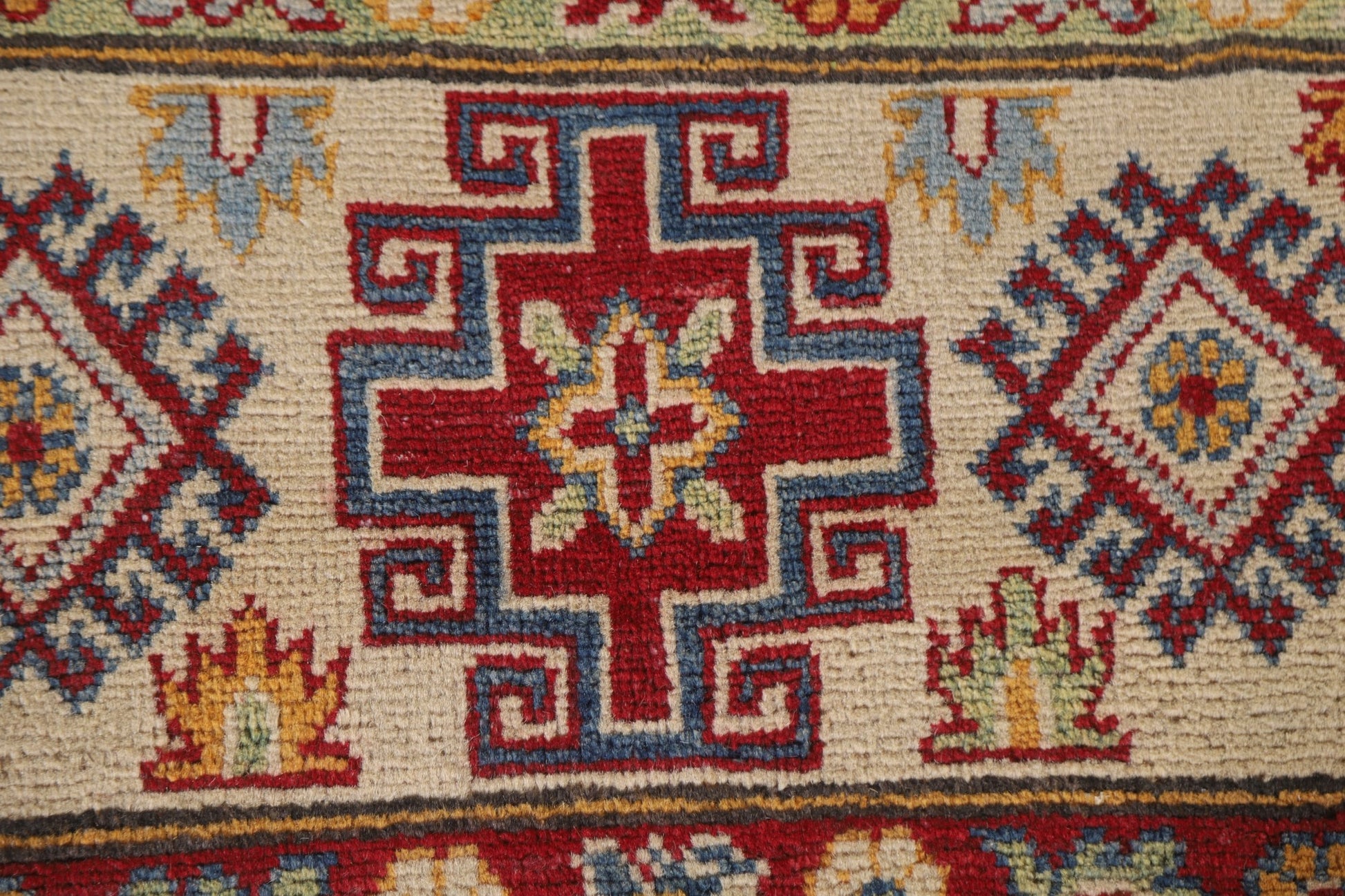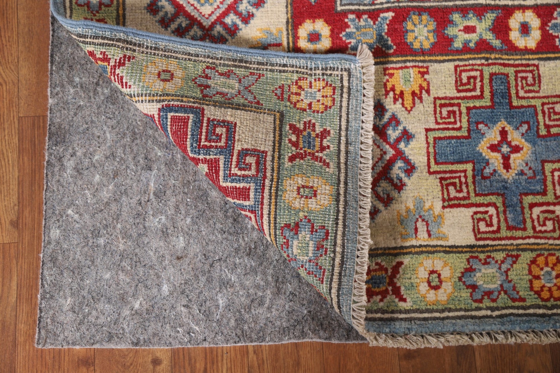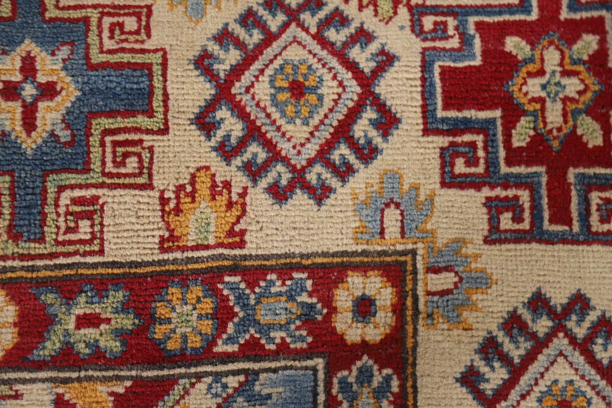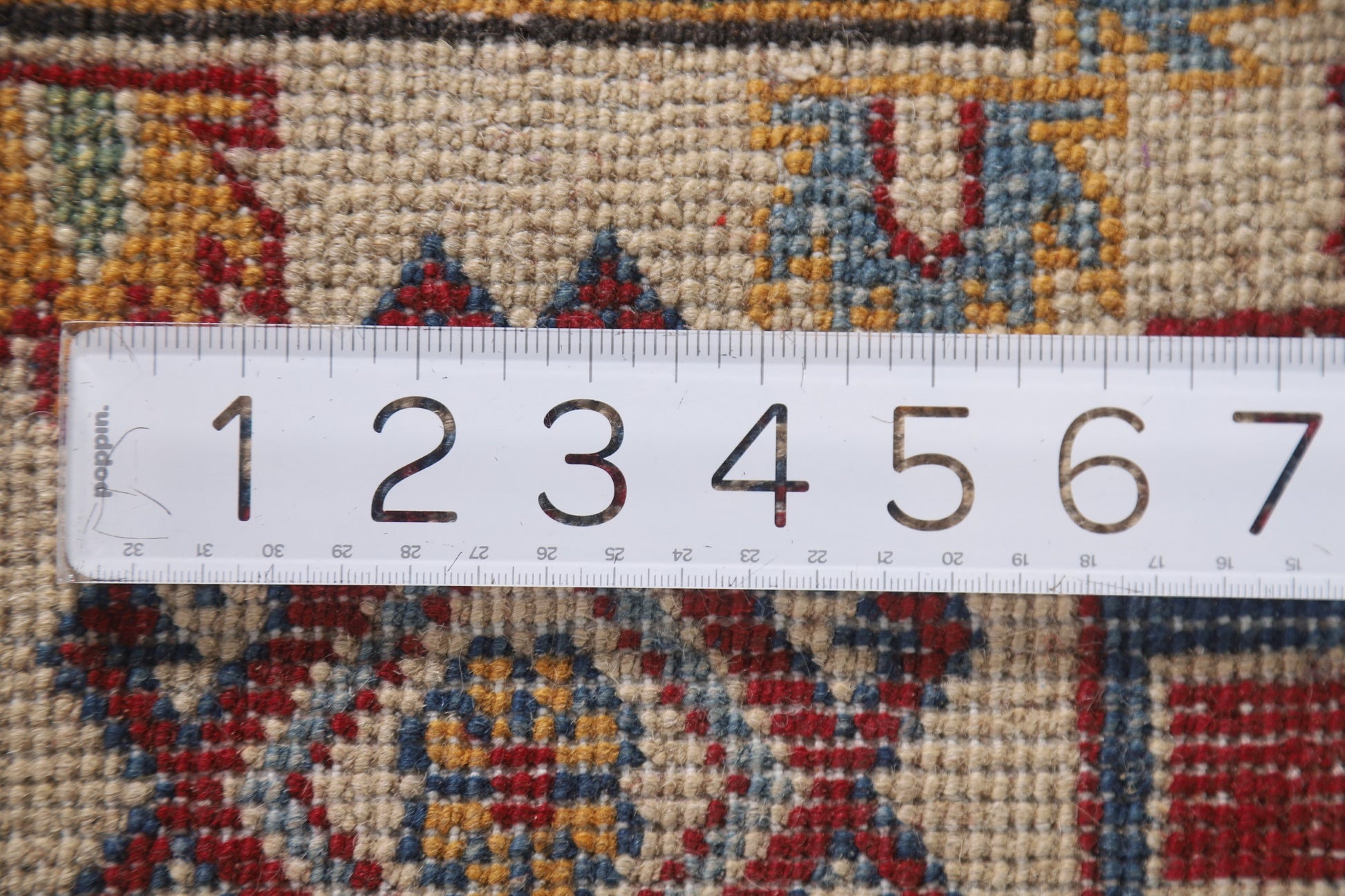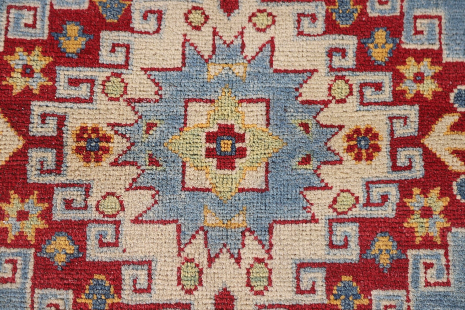 A Beautiful Genuine Pakistan Kazak rug is Hand Knotted by skillful weavers in Pakistan with 100% Wool Material. This rug is in New, First Quality condition. dimensions are 9' 4'' X 5' 8'' in foot and 284 X 173 in centimeter. the primary color is Navy Blue & Blues.
