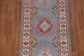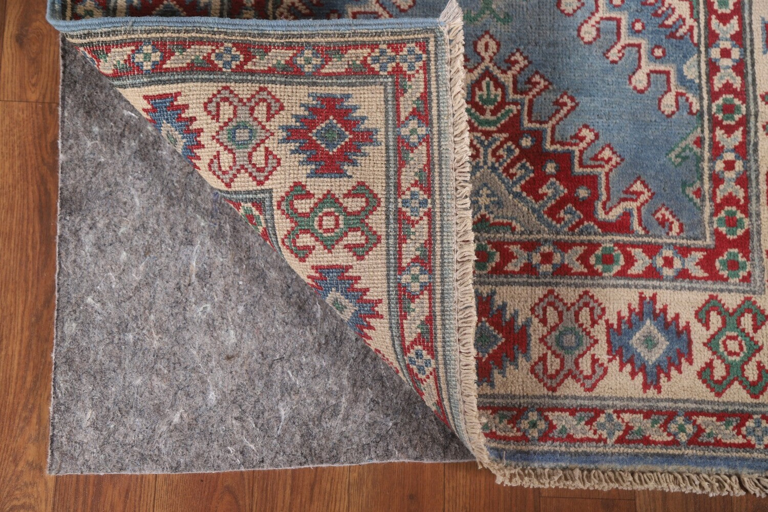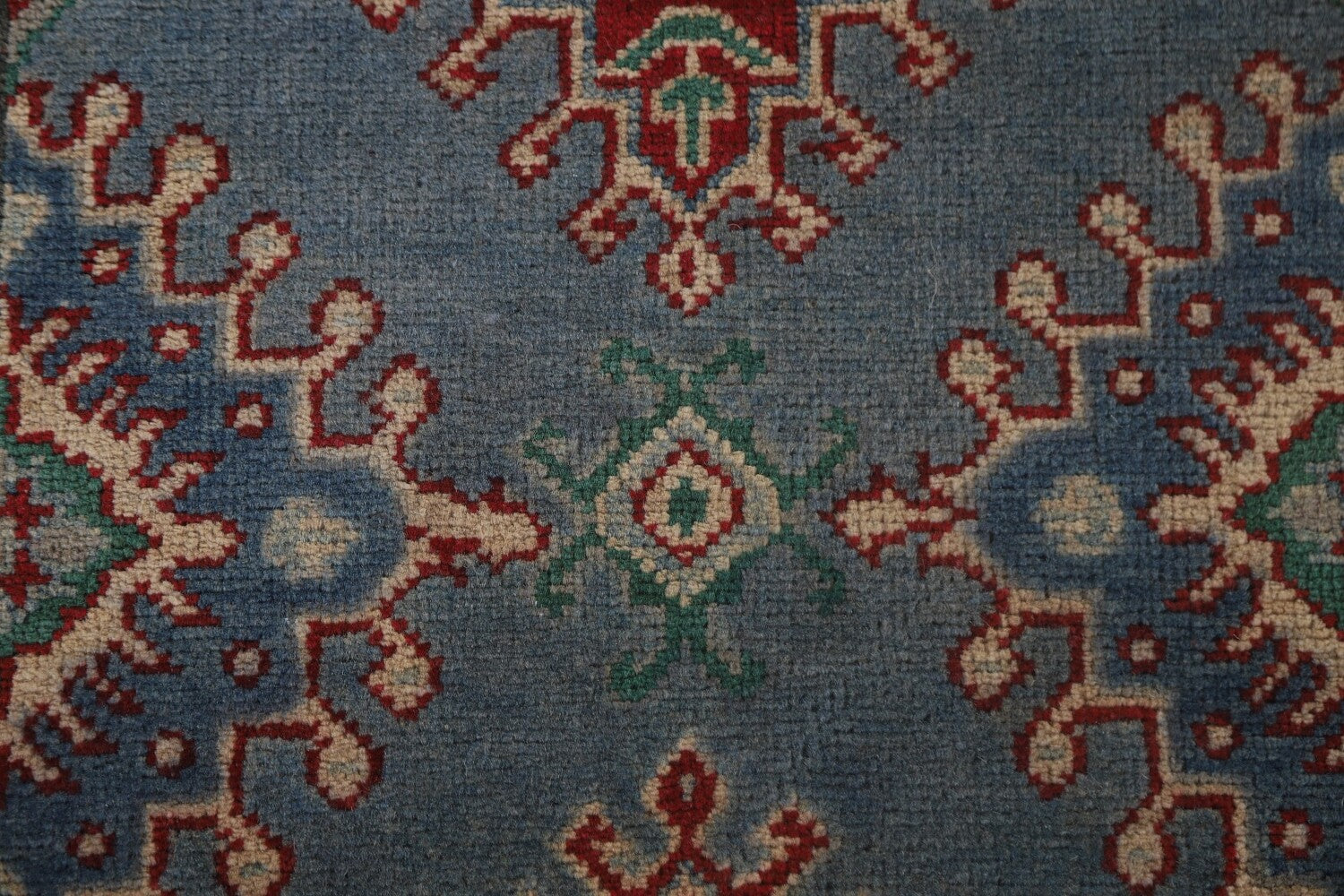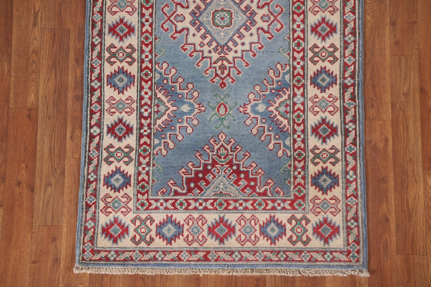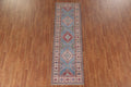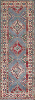 A Beautiful Genuine Pakistan Kazak rug is Hand Knotted by skillful weavers in Pakistan with 100% Wool Material. This rug is in New, First Quality condition. dimensions are 8' 11'' X 2' 9'' in foot and 272 X 84 in centimeter. the primary color is Navy Blue & Blues.