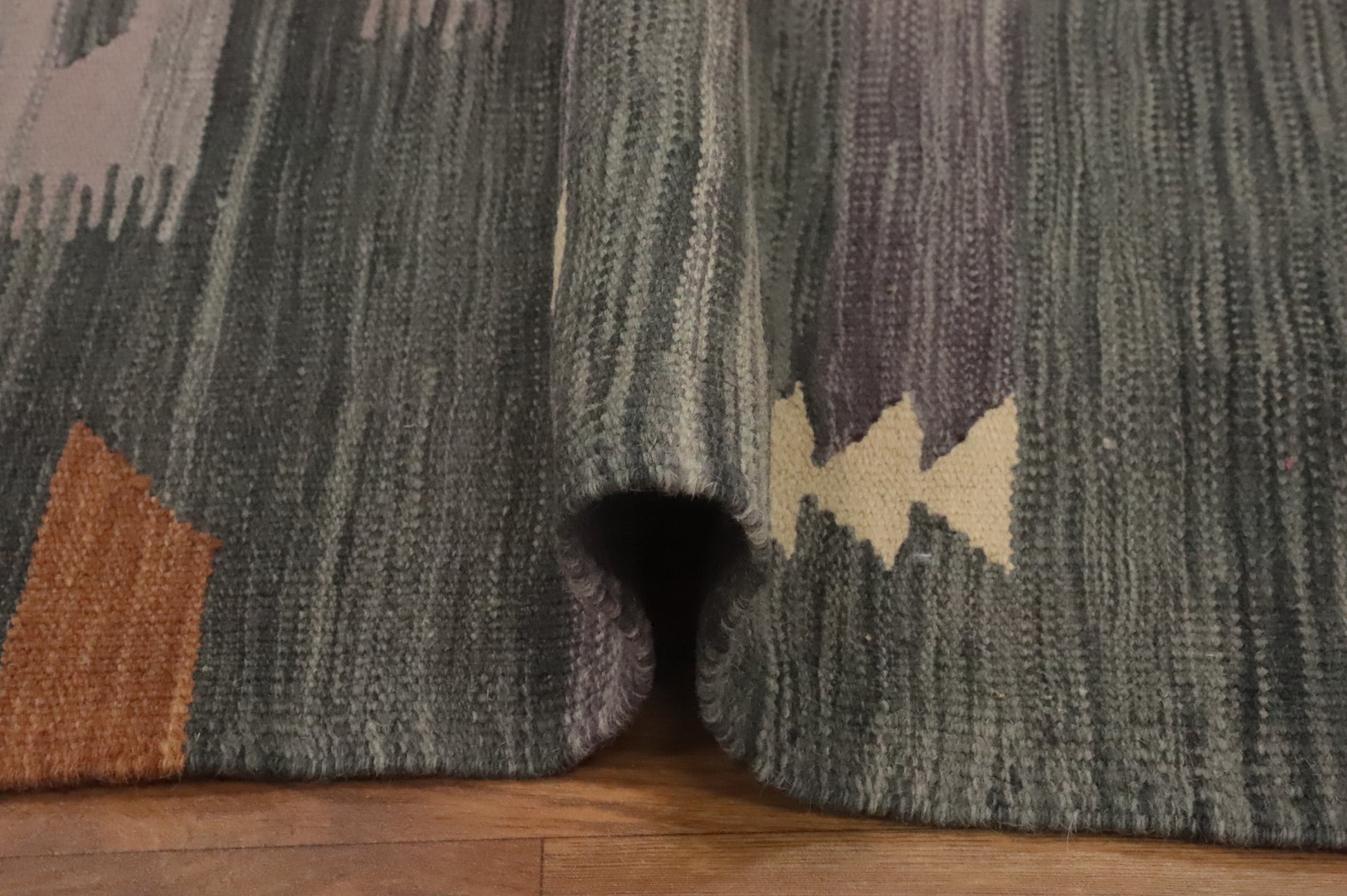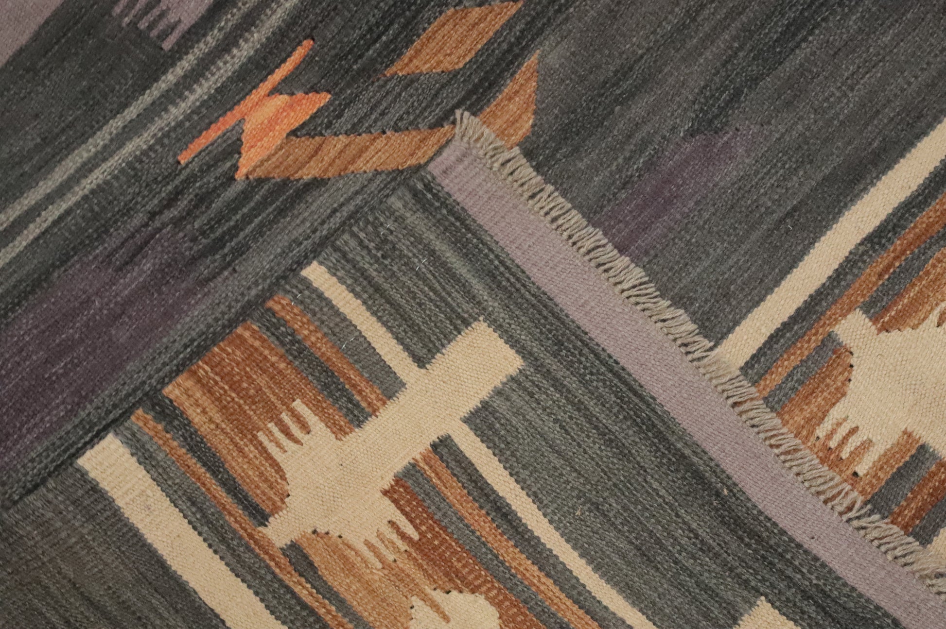 A Beautiful Genuine Pakistan Kilim rug is Hand Woven by skillful weavers in Pakistan with 100% Wool Material. This rug is in New, First Quality condition. dimensions are 9' 10'' X 6' 10'' in foot and 300 X 208 in centimeter. the primary color is Greys & Charcoal.