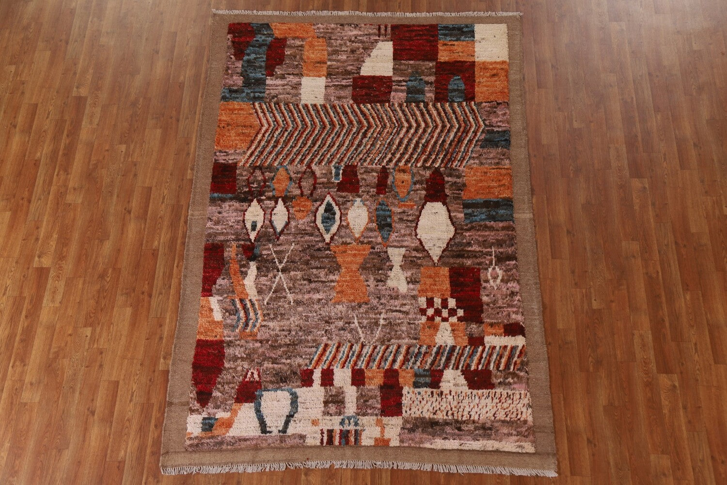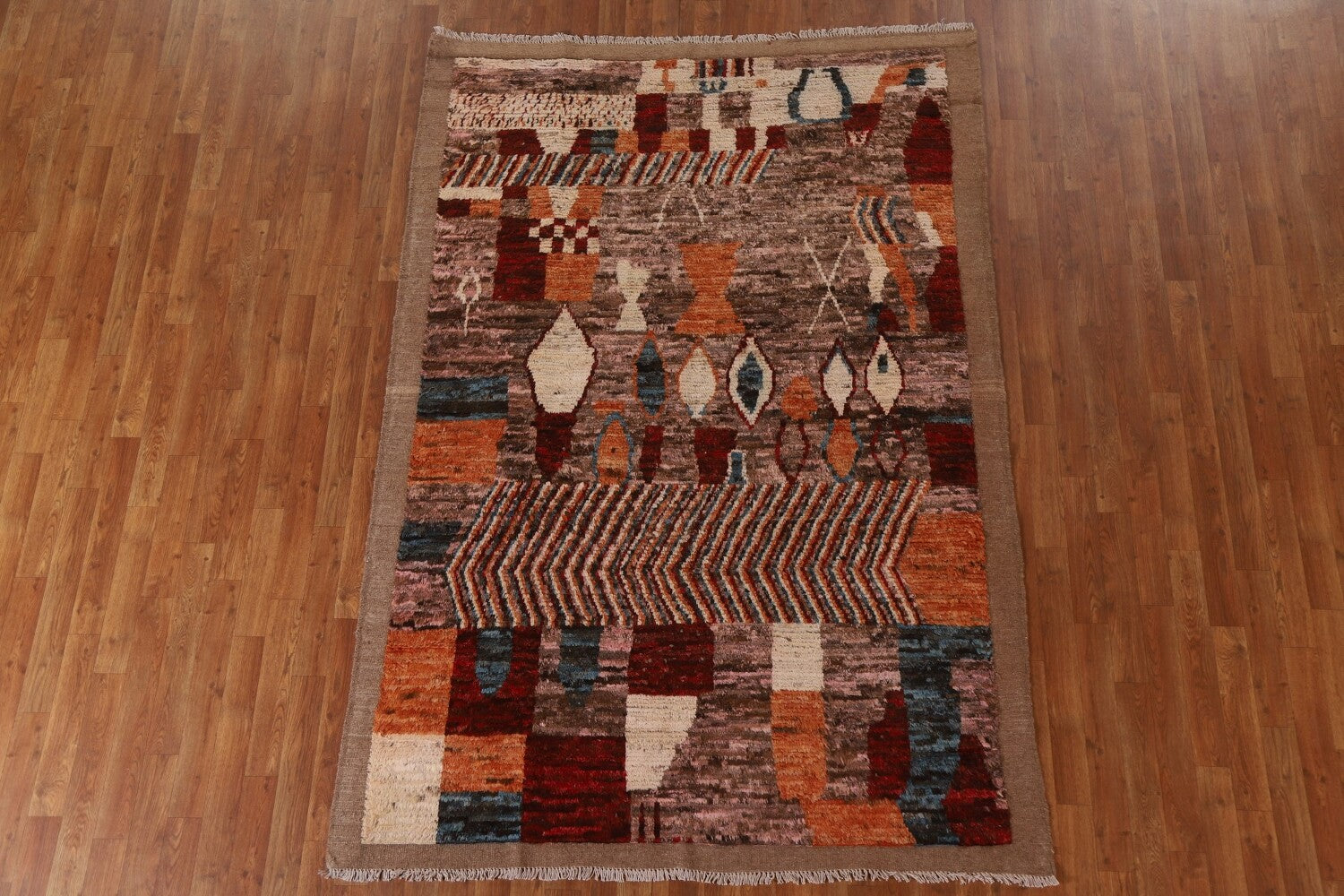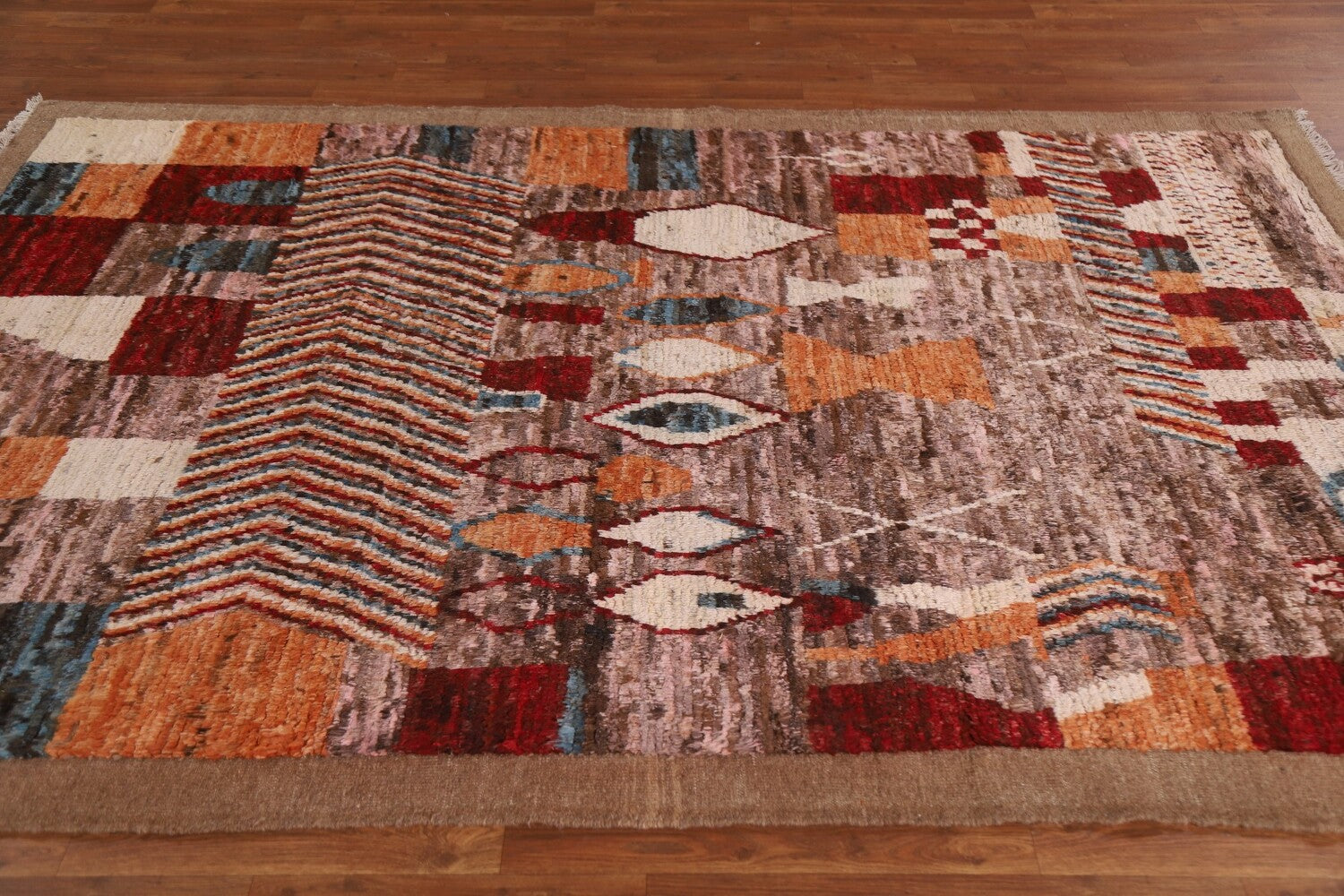 A Beautiful Genuine Pakistan Moroccan rug is Hand Knotted by skillful weavers in Pakistan with 100% Wool Material. This rug is in condition. dimensions are 8' 0'' X 5' 6'' in foot and 244 X 168 in centimeter. the primary color is Brown.
