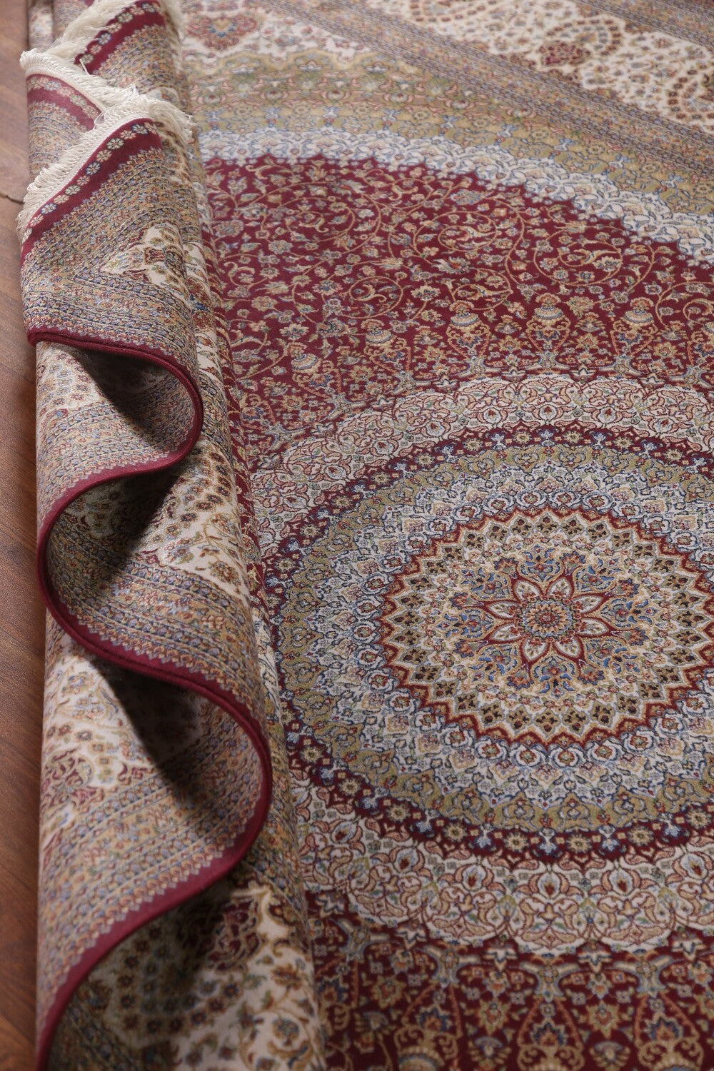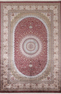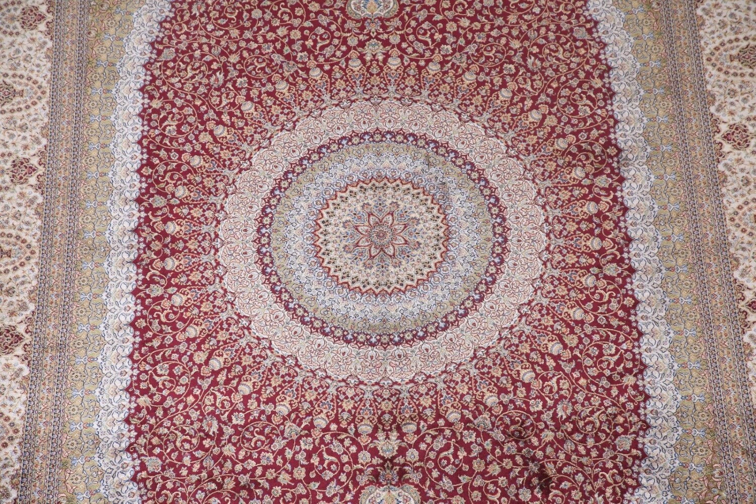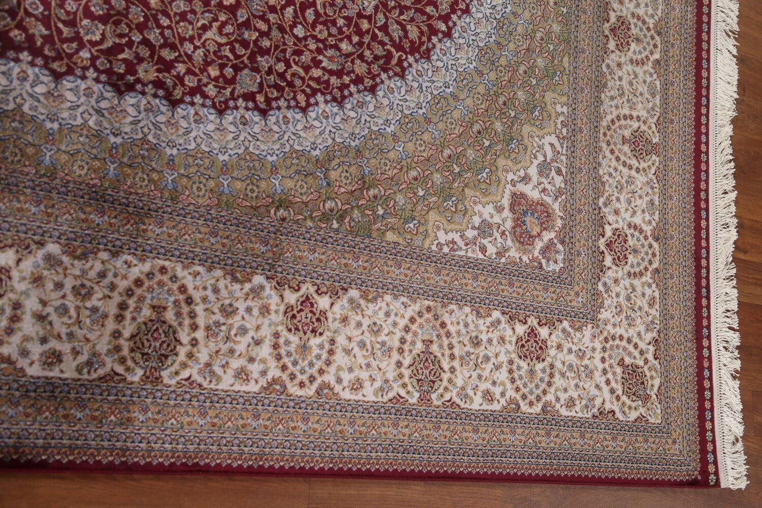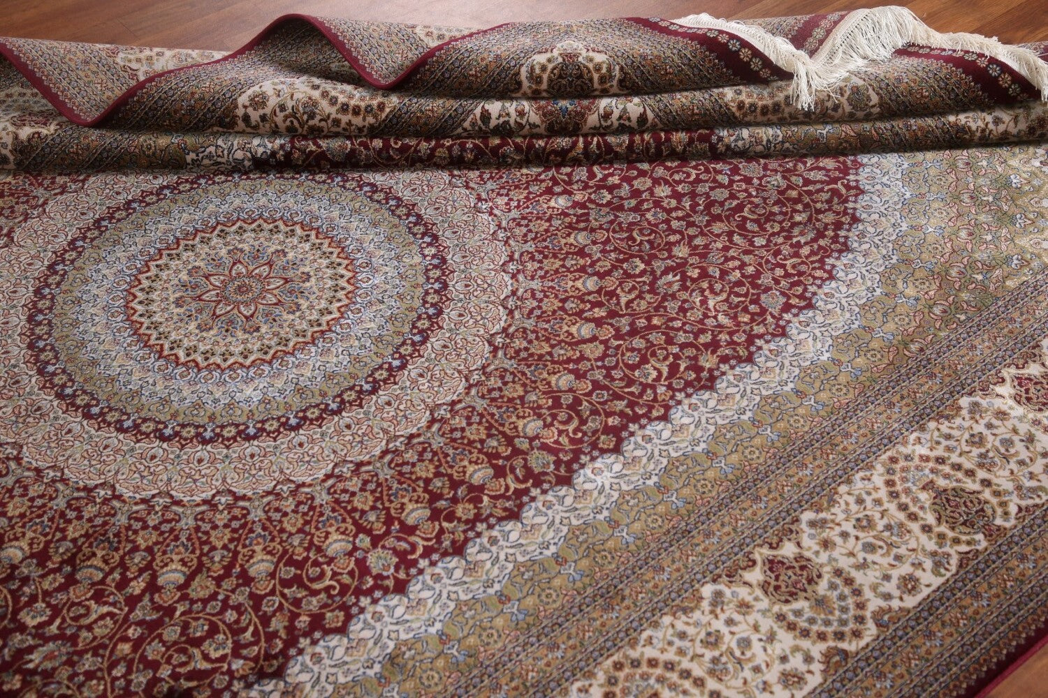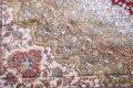 A Beautiful Genuine Turkey Tabriz rug is Machine Made by skillful weavers in Turkey with 90% Silk - 10% Polyester Material. This rug is in condition. dimensions are 9' 11'' X 6' 5'' in foot and 302 X 196 in centimeter. the primary color is Red.