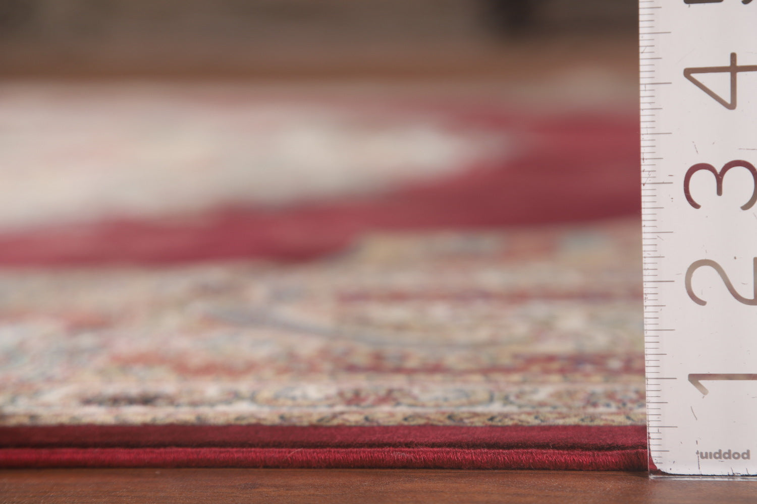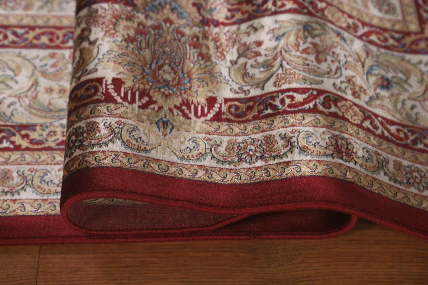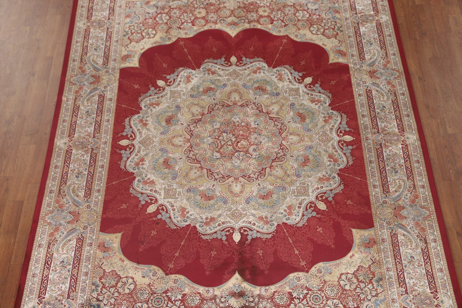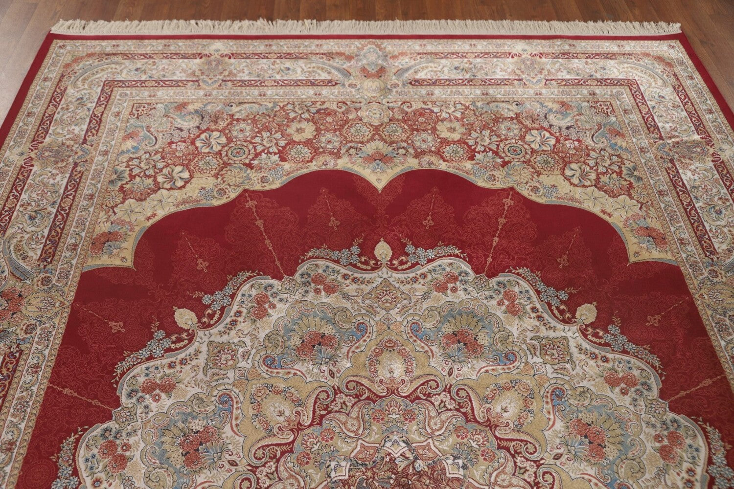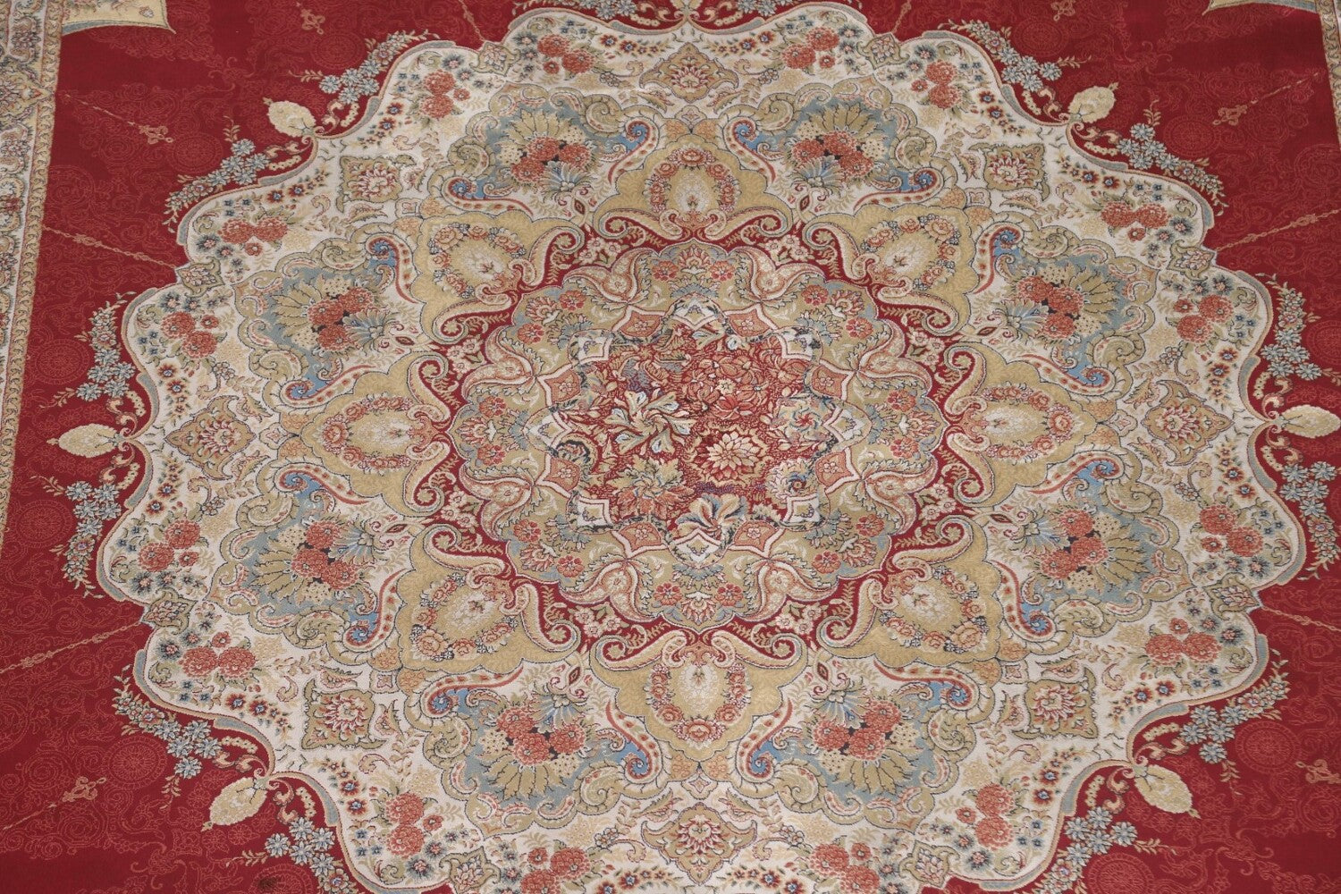 A Beautiful Genuine Turkey Tabriz rug is Machine Made by skillful weavers in Turkey with 90% Silk - 10% Polyester Material. This rug is in condition. dimensions are 9' 6'' X 6' 6'' in foot and 290 X 198 in centimeter. the primary color is Red.