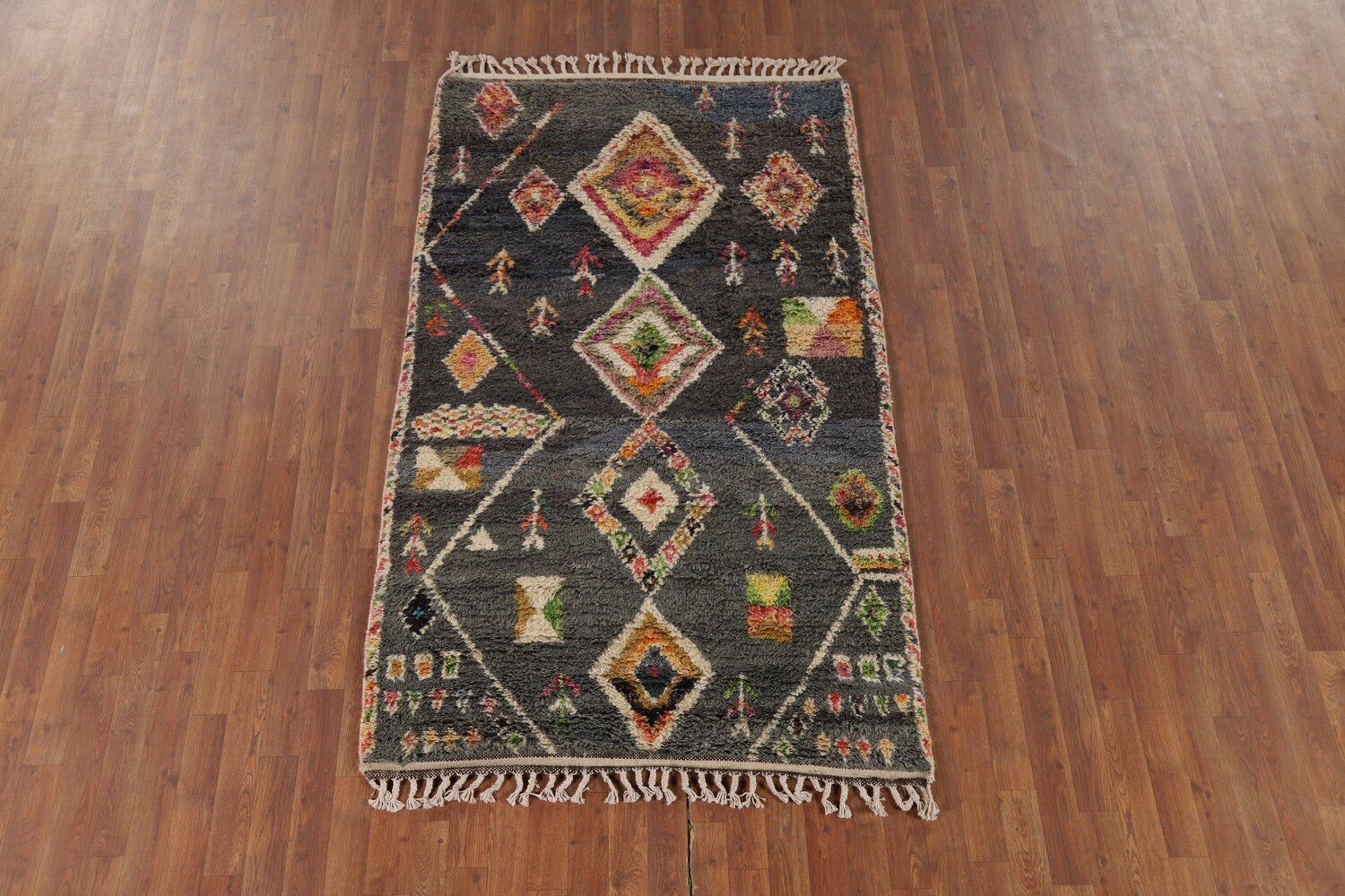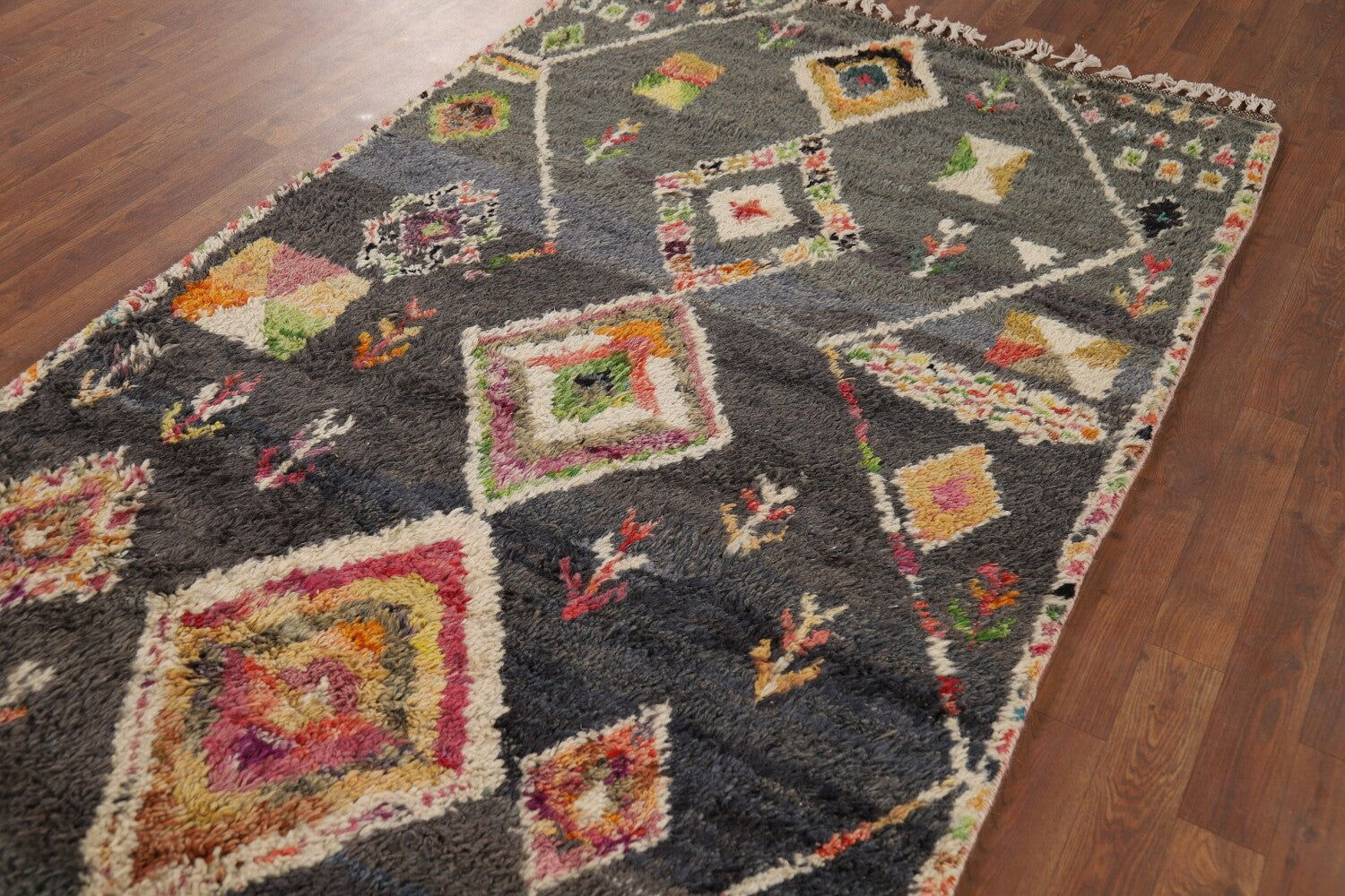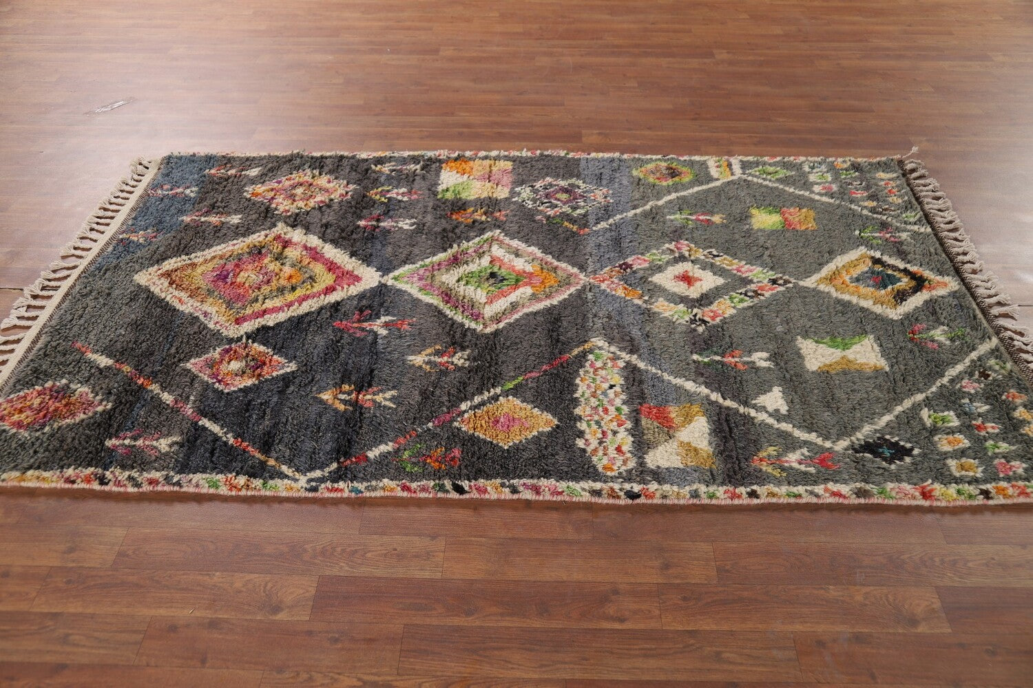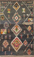 A Beautiful Genuine Pakistan Moroccan rug is Hand Knotted by skillful weavers in Pakistan with 100% Wool Material. This rug is in New, First Quality condition. dimensions are 6' 11'' X 4' 1'' in foot and 211 X 124 in centimeter. the primary color is Greys & Charcoal.
