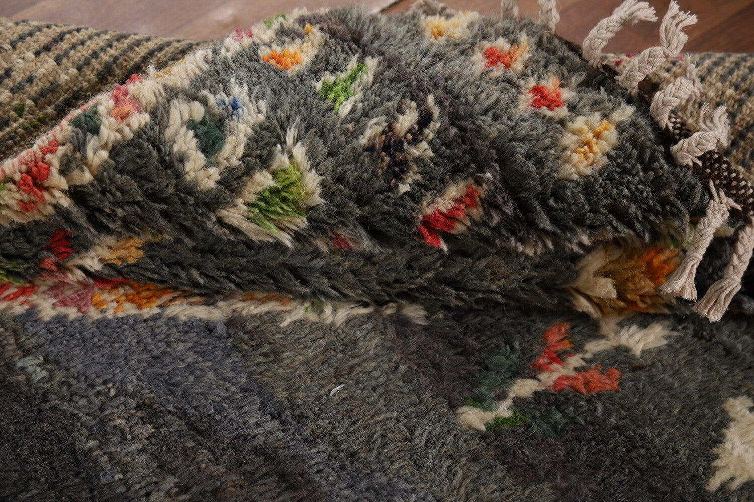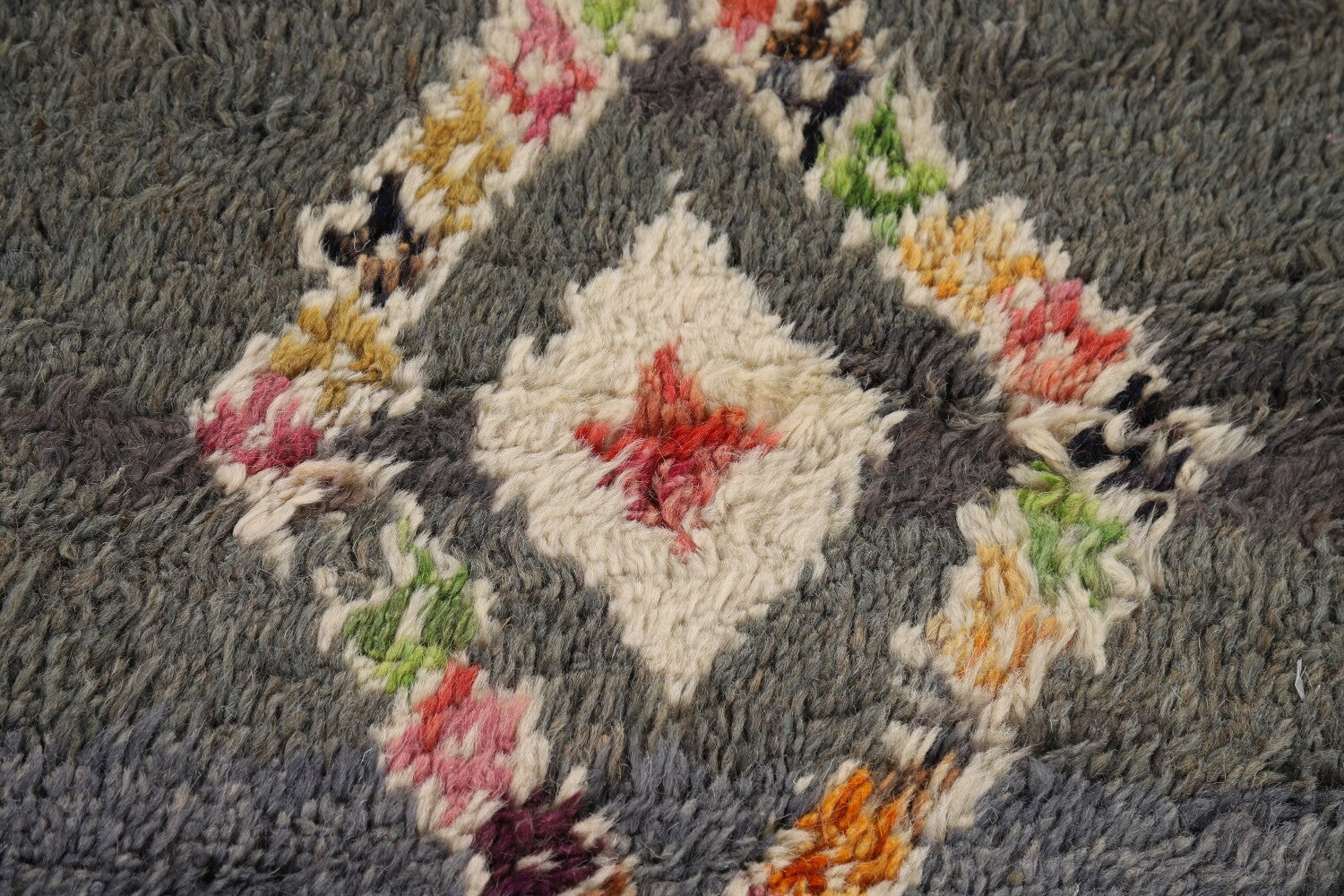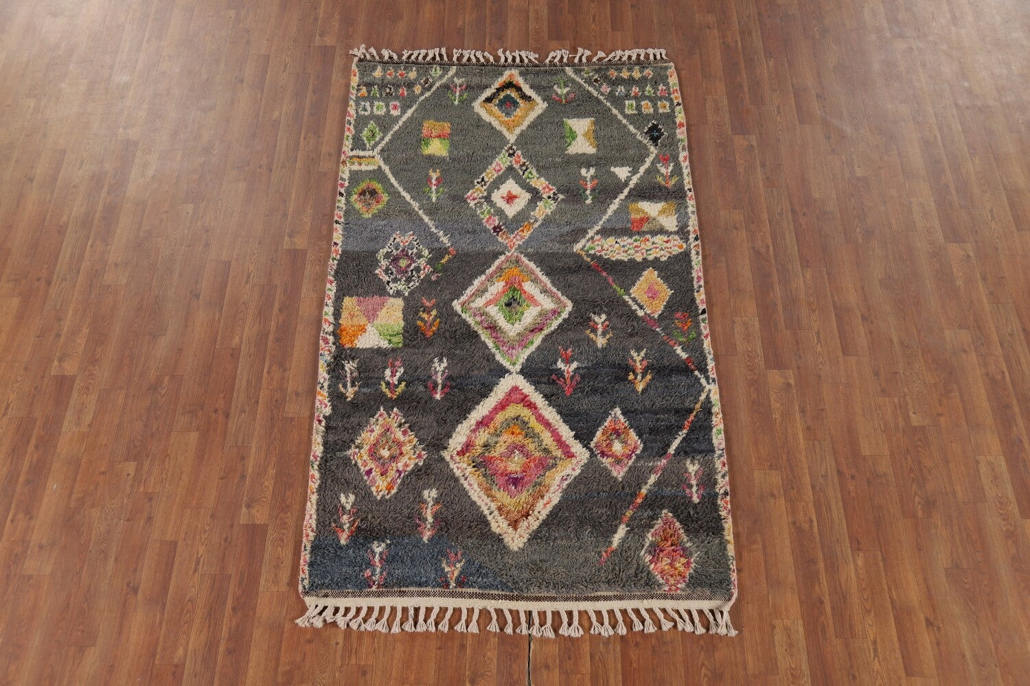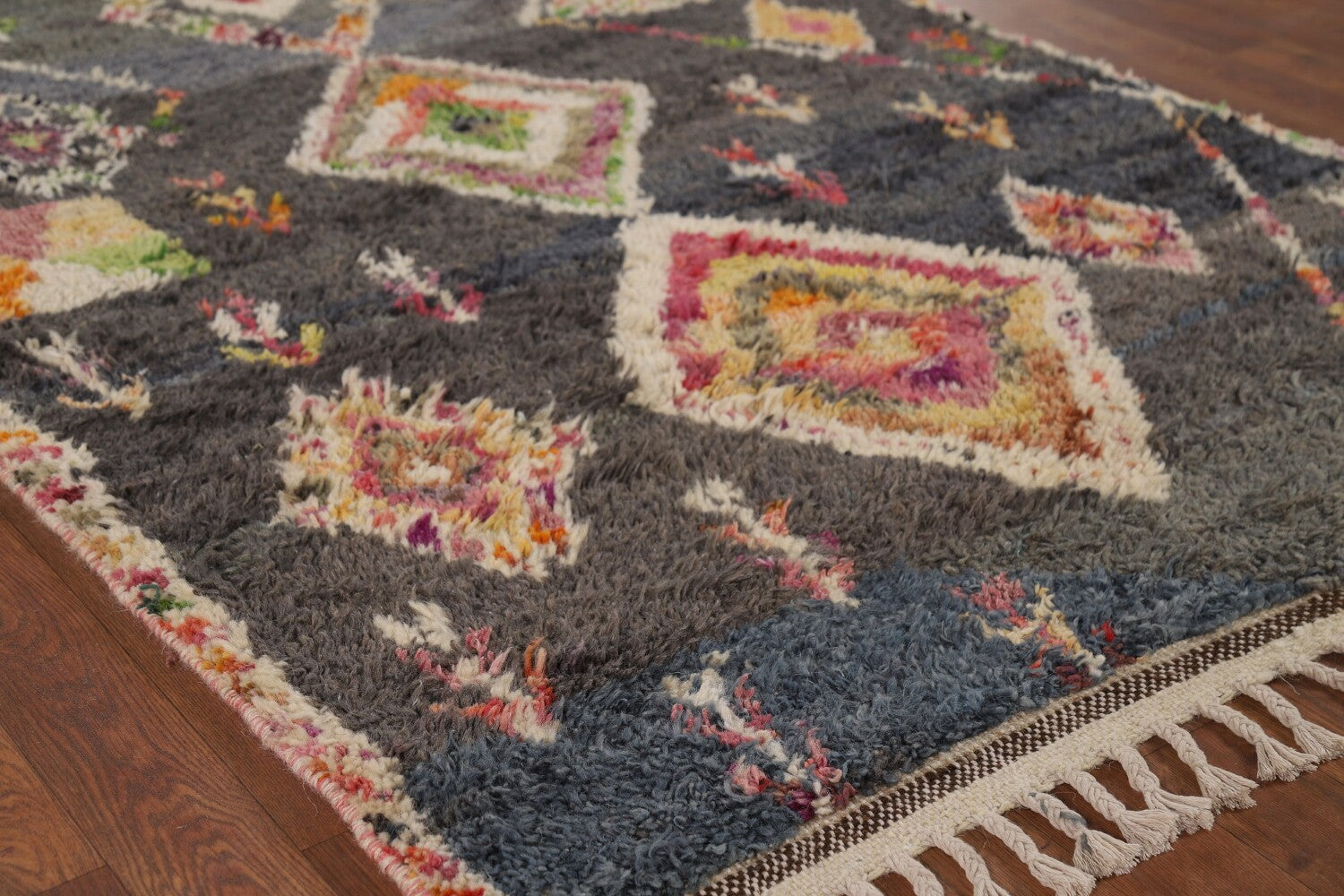 A Beautiful Genuine Pakistan Moroccan rug is Hand Knotted by skillful weavers in Pakistan with 100% Wool Material. This rug is in New, First Quality condition. dimensions are 6' 11'' X 4' 1'' in foot and 211 X 124 in centimeter. the primary color is Greys & Charcoal.
