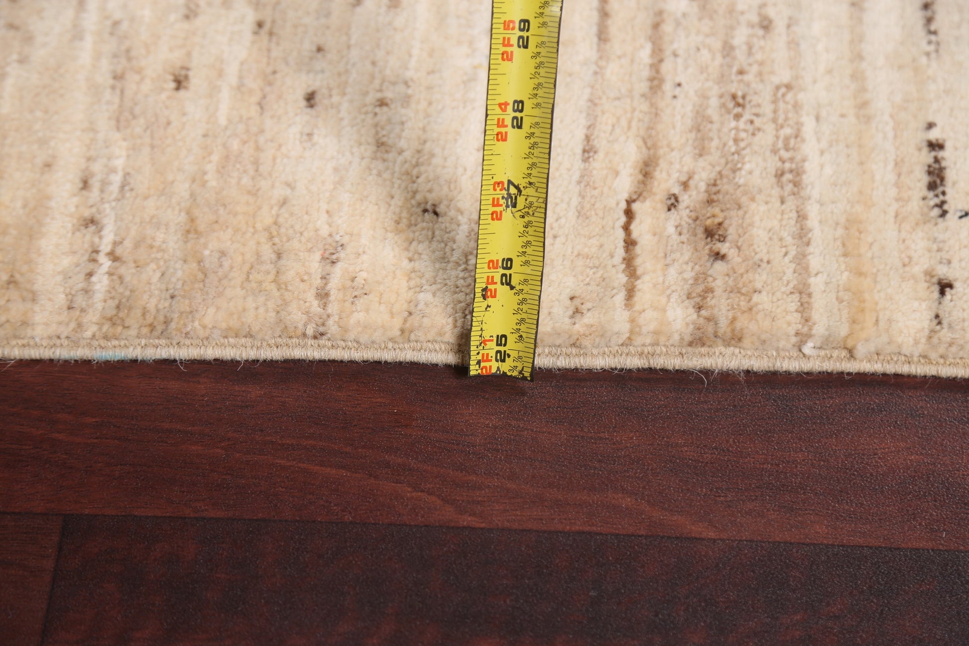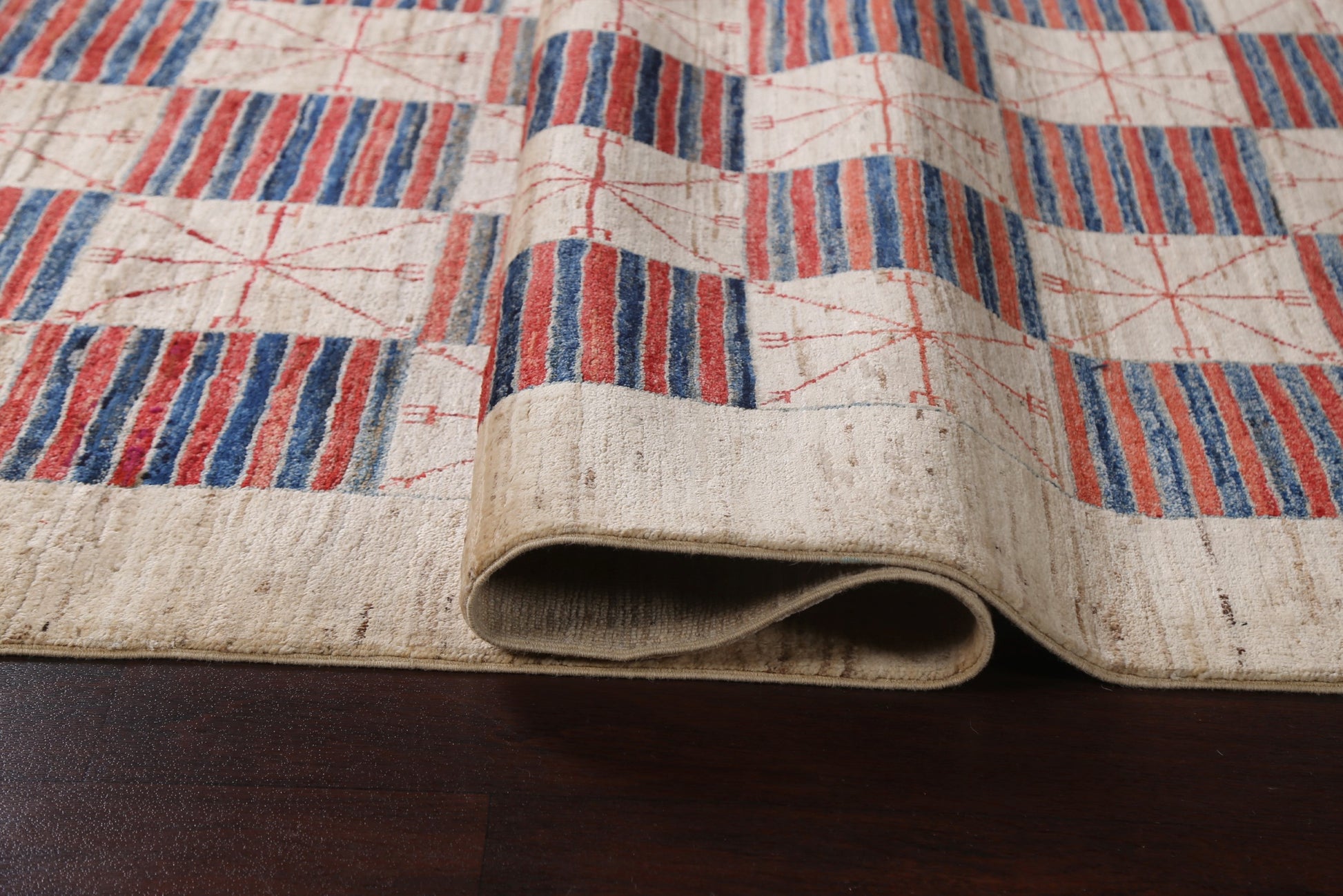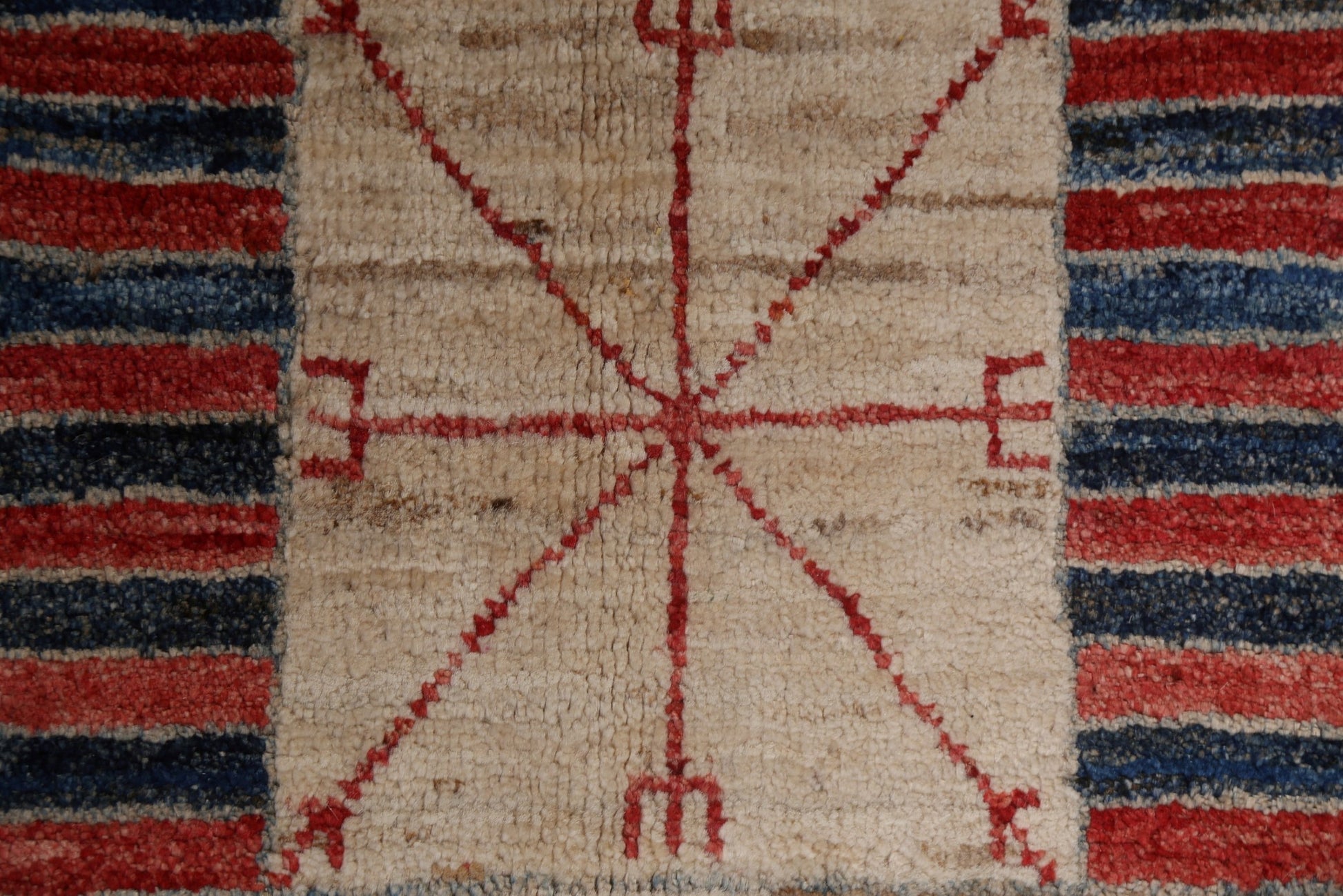 A Beautiful Genuine Afghanistan Gabbeh (kashkoli) rug is Hand Knotted by skillful weavers in Afghanistan with 100% Wool Material. This rug is in New, First Quality condition. dimensions are 9' 5'' X 6' 4'' in foot and 287 X 193 in centimeter. the primary color is Beige & Ivories.