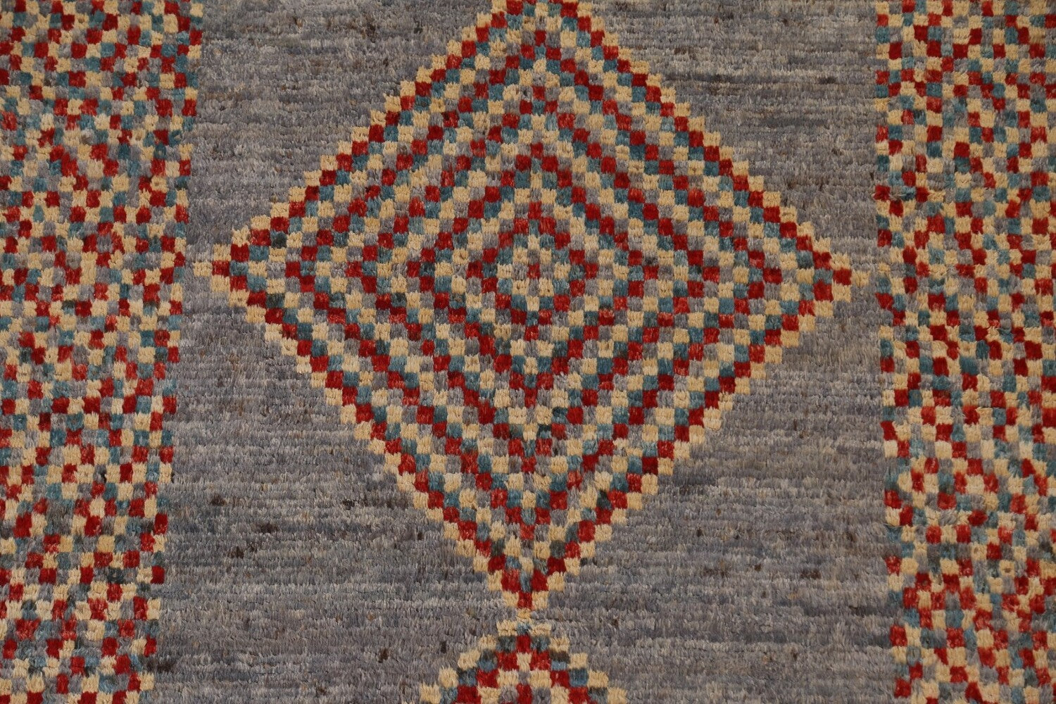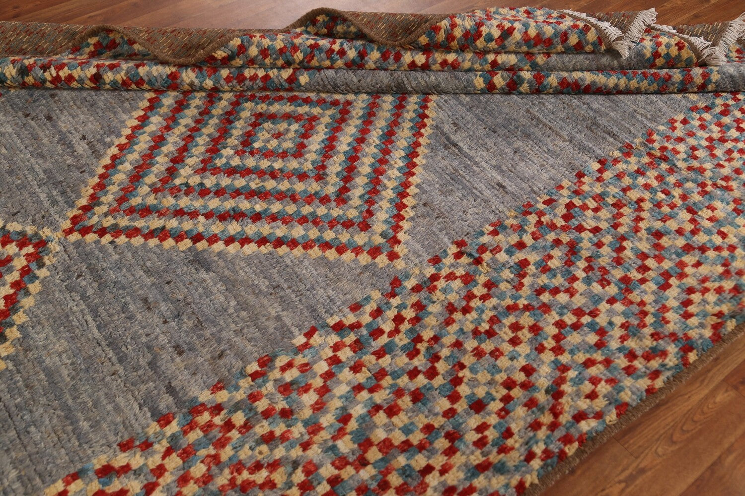A Beautiful Genuine Pakistan Moroccan rug is Hand Knotted by skillful weavers in Pakistan with 100% Wool Material. This rug is in condition. dimensions are 9' 8'' X 6' 4'' in foot and 295 X 193 in centimeter. the primary color is Greys & Charcoal.
