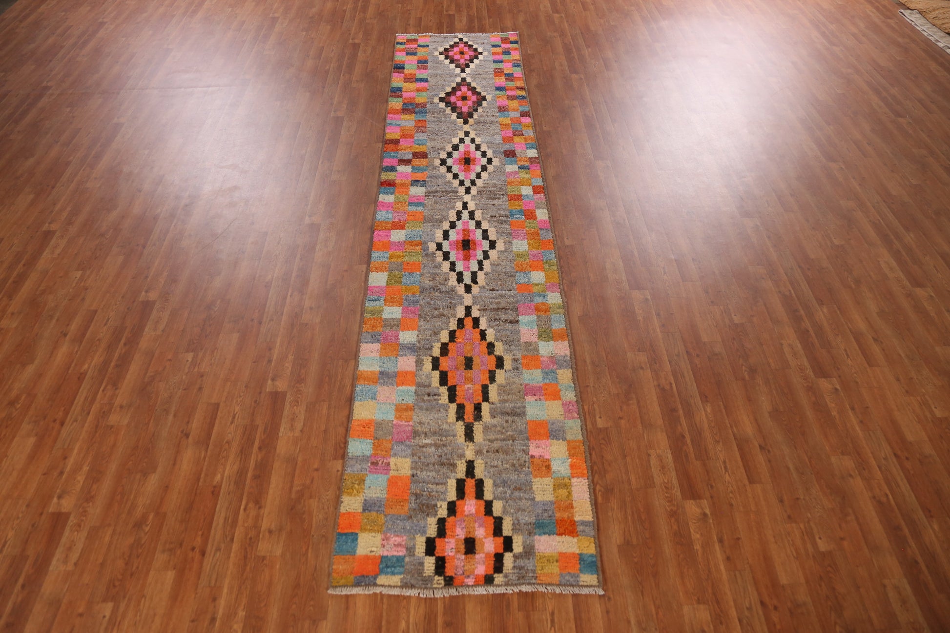 A Beautiful Genuine Pakistan Moroccan rug is Hand Knotted by skillful weavers in Pakistan with 100% Wool Material. This rug is in New, First Quality condition. dimensions are 12' 8'' X 2' 10'' in foot and 386 X 86 in centimeter. the primary color is Multi-Colored.