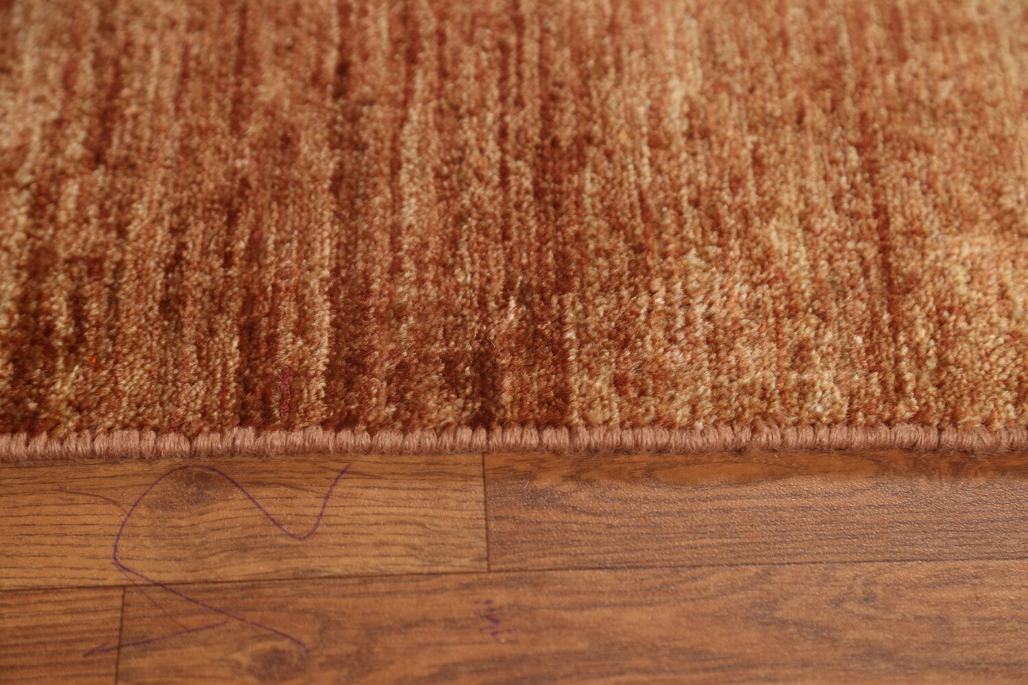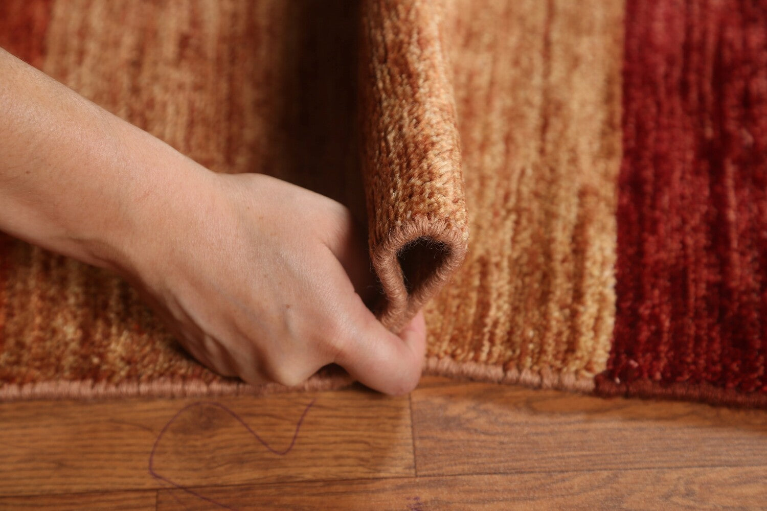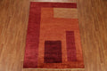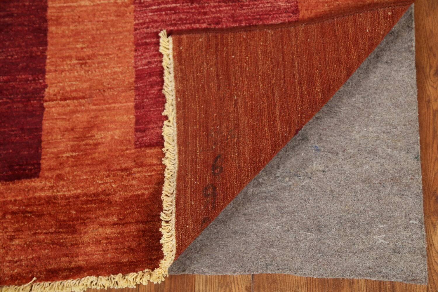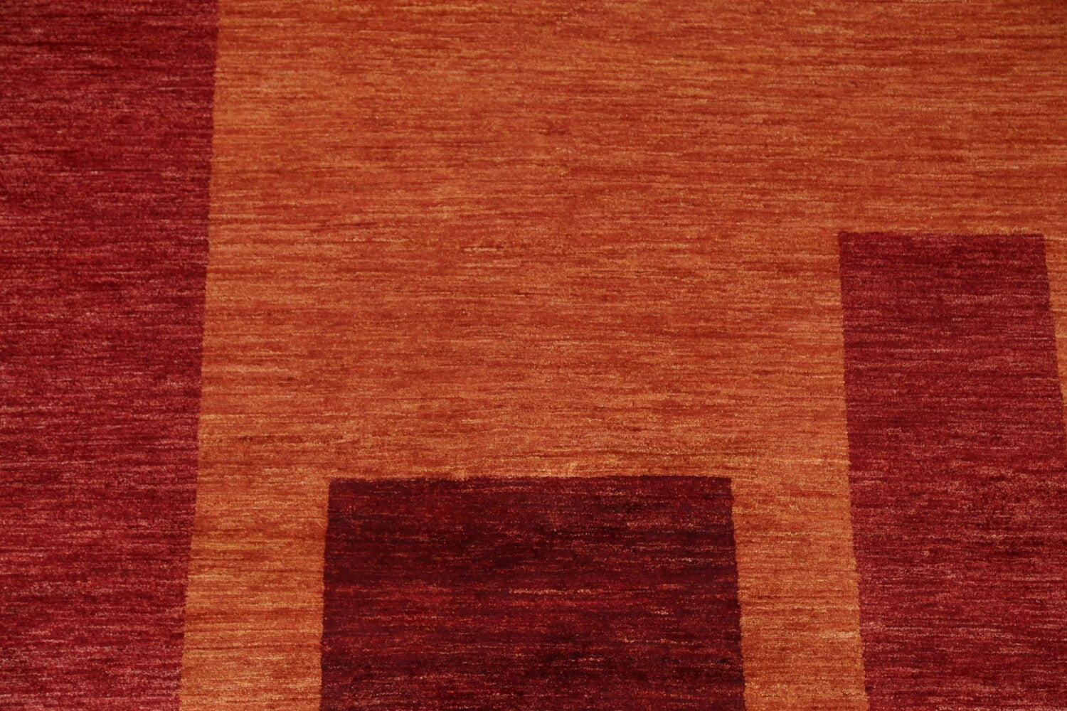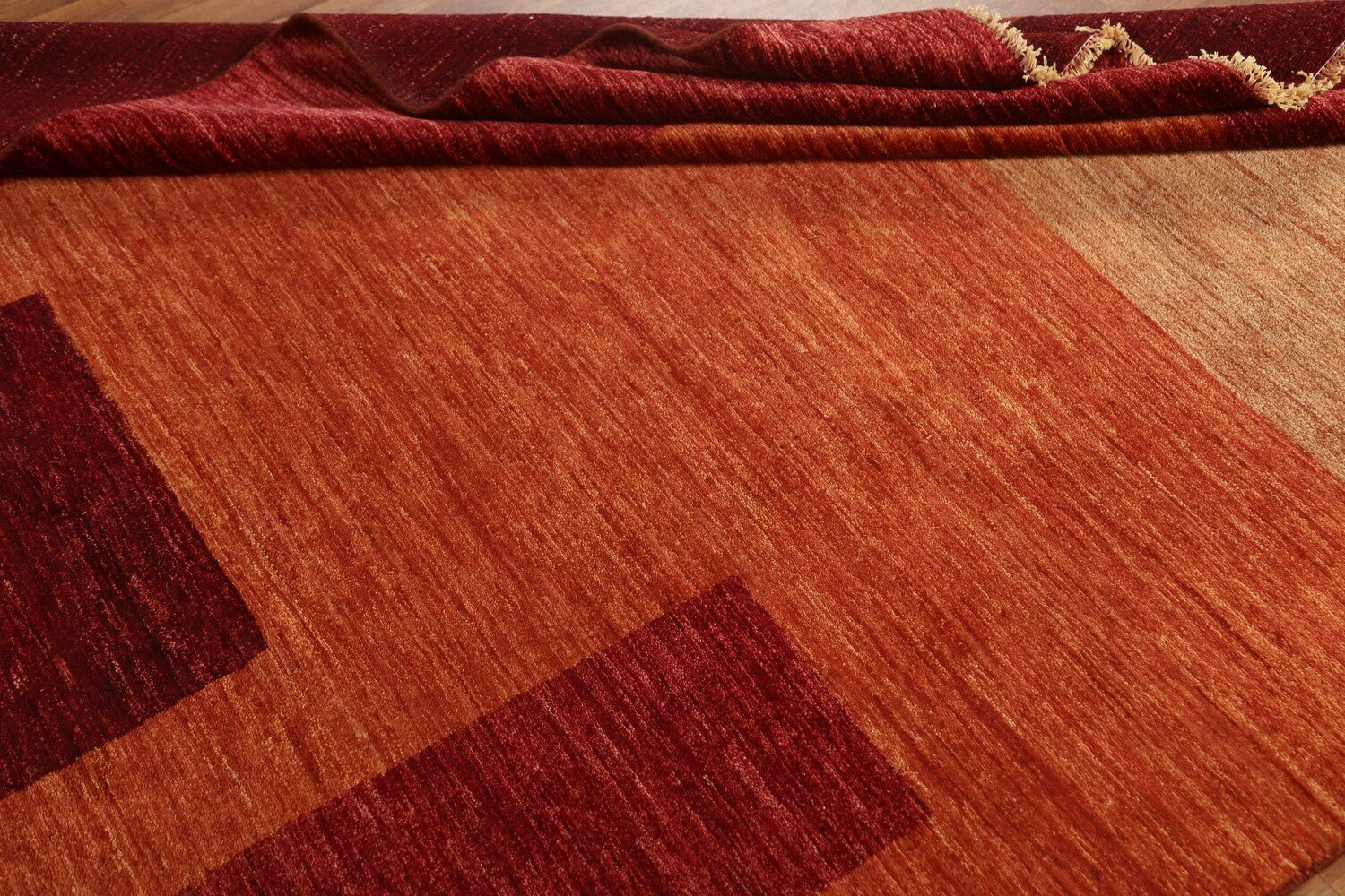 A Beautiful Genuine Pakistan Modern Gabbeh rug is Hand Knotted by skillful weavers in Pakistan with 100% Wool Material. This rug is in New, First Quality condition. dimensions are 7' 9'' X 5' 6'' in foot and 236 X 168 in centimeter. the primary color is Oranges & Rust.