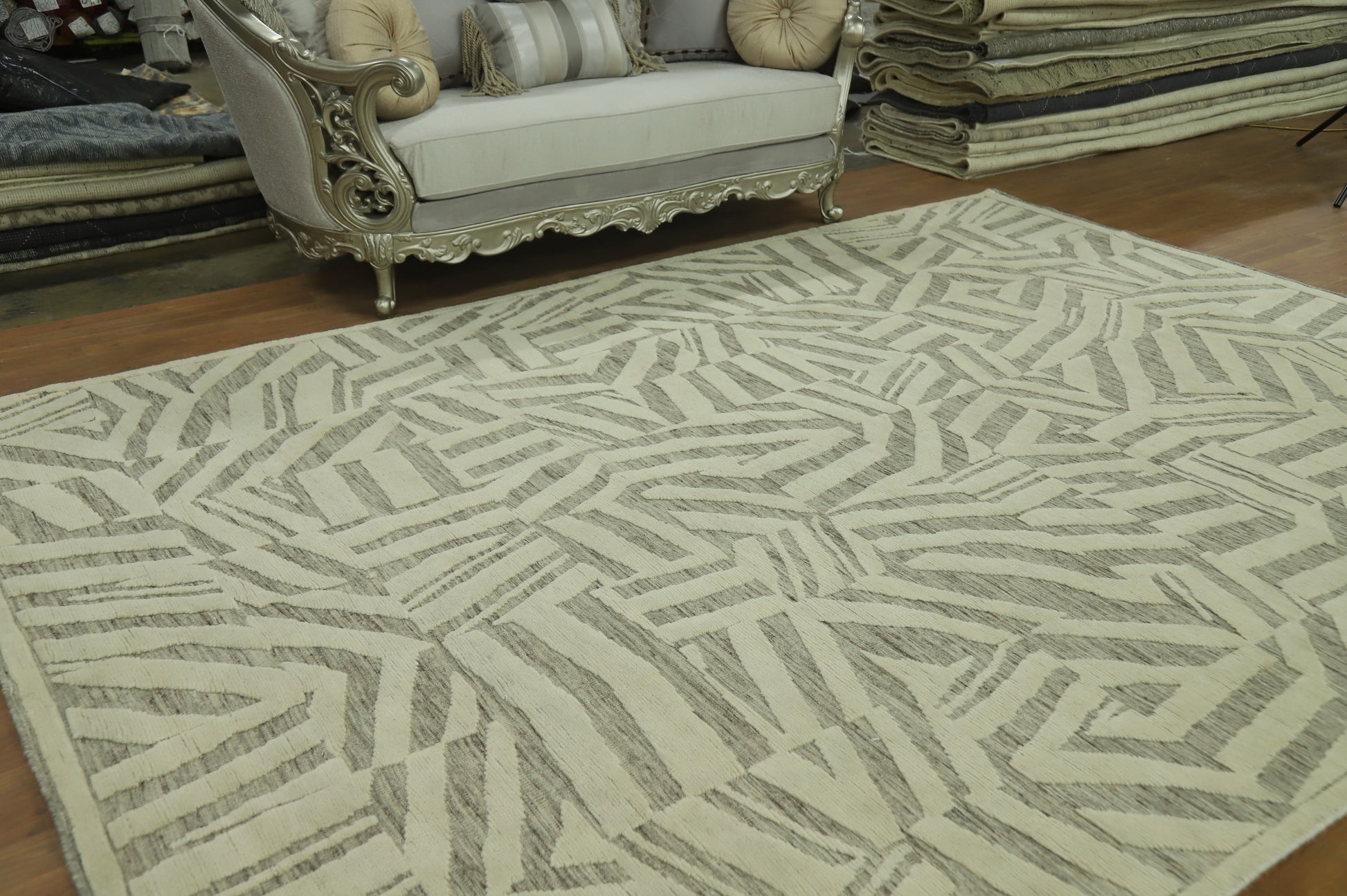 A Beautiful Genuine India Abstract rug is Hand Knotted by skillful weavers in India with 100% Wool Material. This rug is in New, First Quality condition. dimensions are 11' 11'' X 8' 6'' in foot and 363 X 259 in centimeter. the primary color is Beige & Ivories.