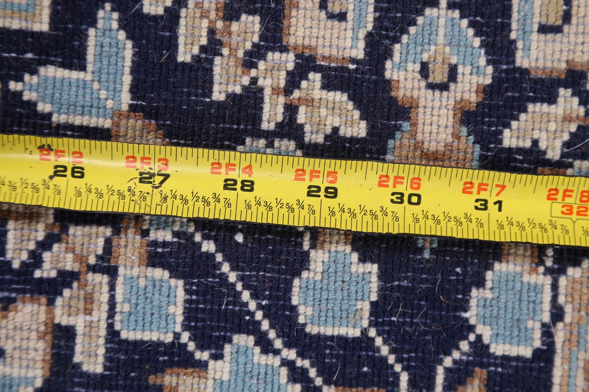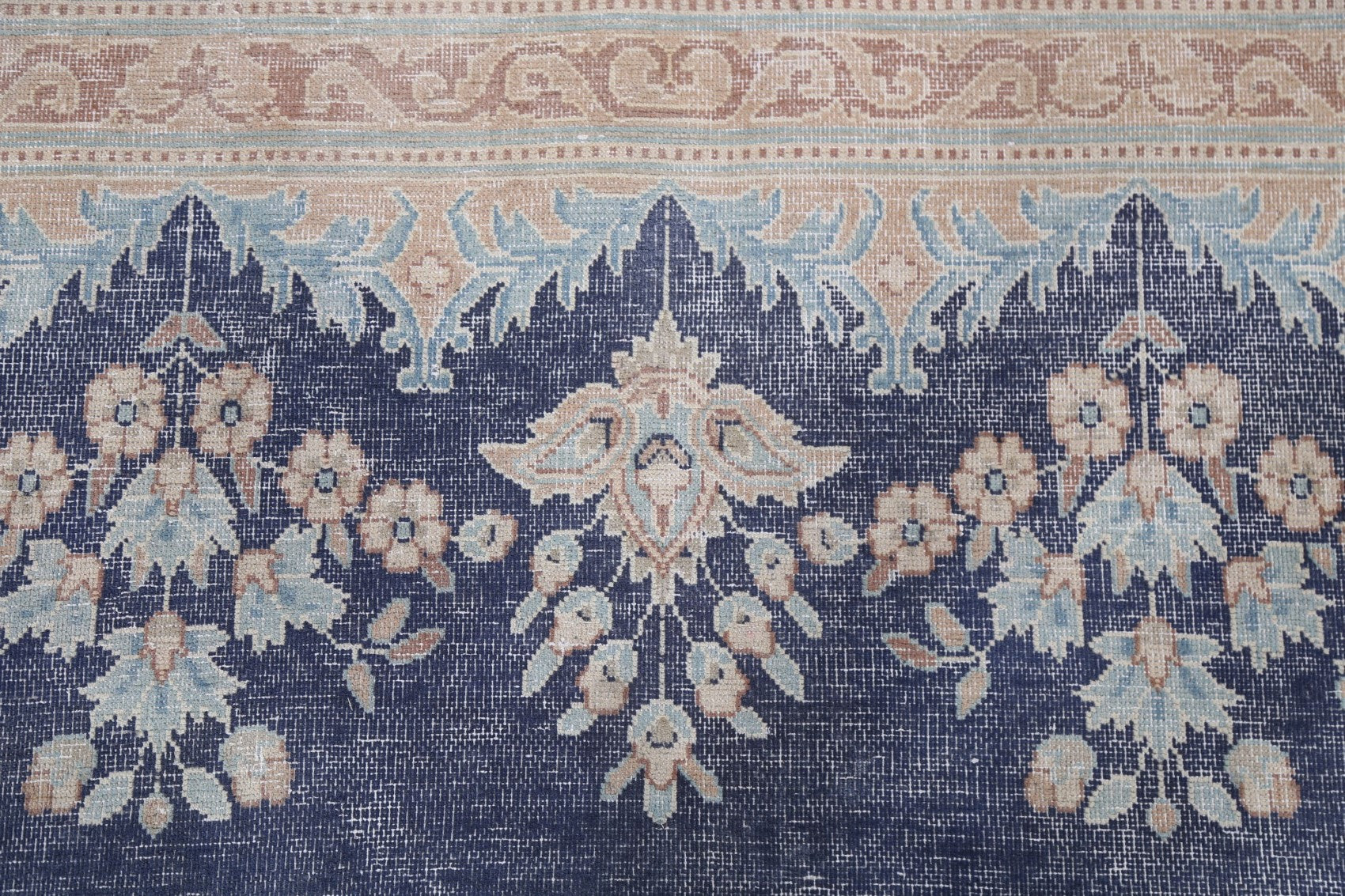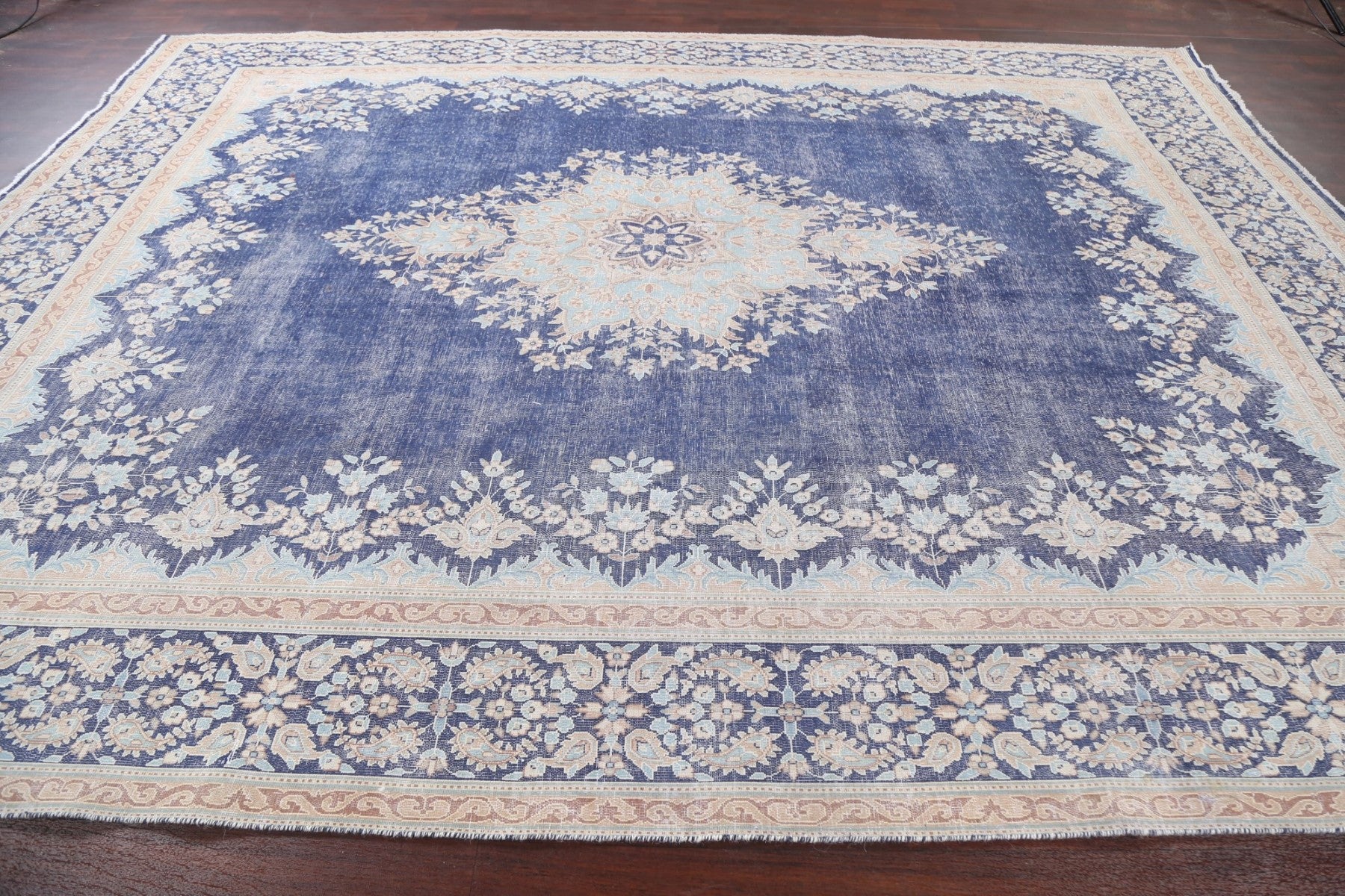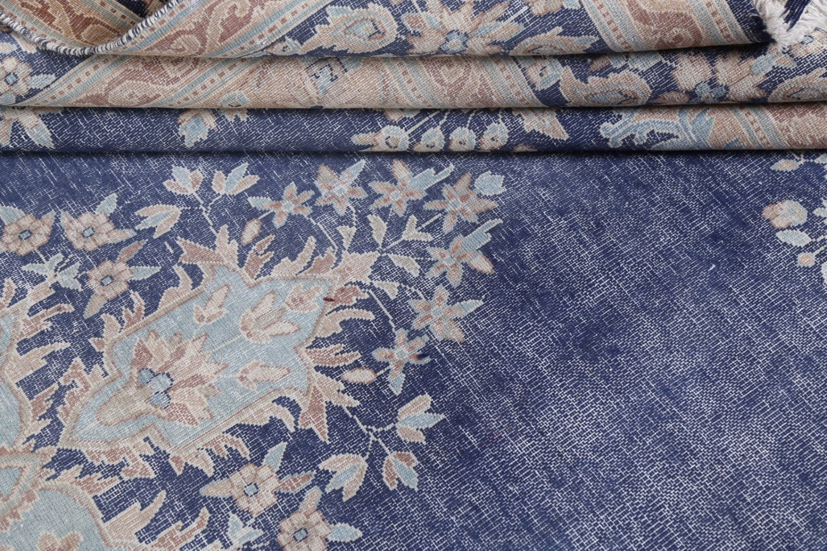 A Beautiful Genuine Persia ( Persia ) Kerman rug is Hand Knotted by skillful weavers in Persia ( Persia ) with 100% Wool Material. This rug is in Very Good (Evenly Low Pile) condition. dimensions are 12' 8'' X 9' 9'' in foot and 386 X 297 in centimeter. the primary color is Navy Blue & Blues.