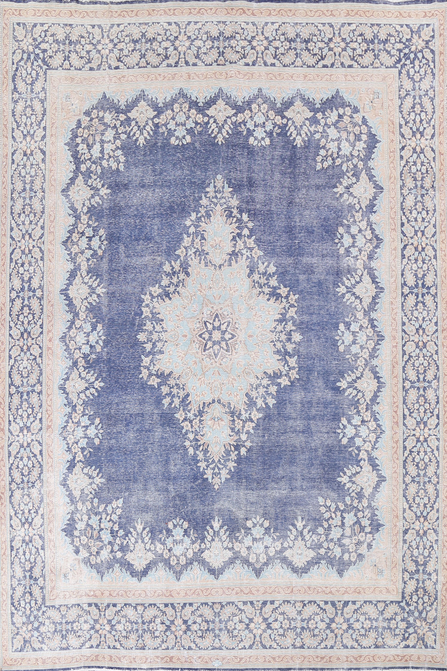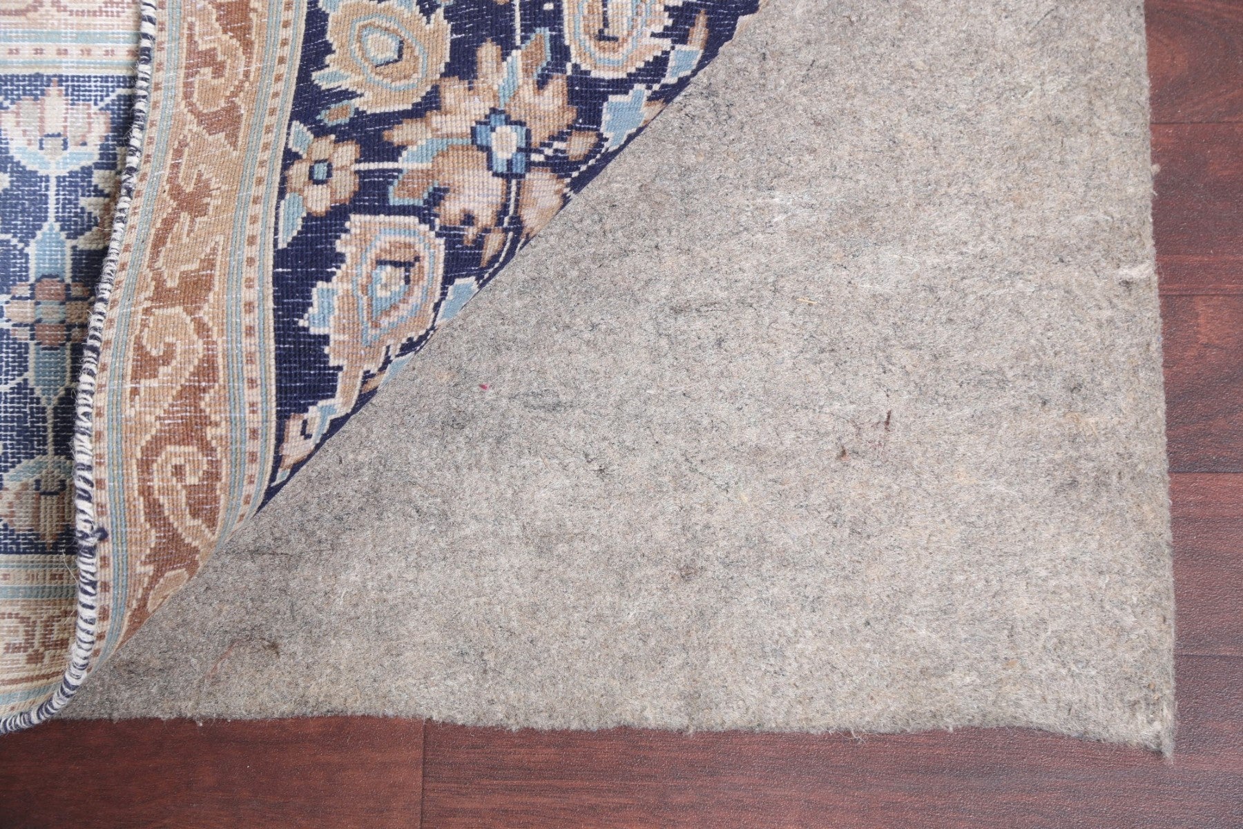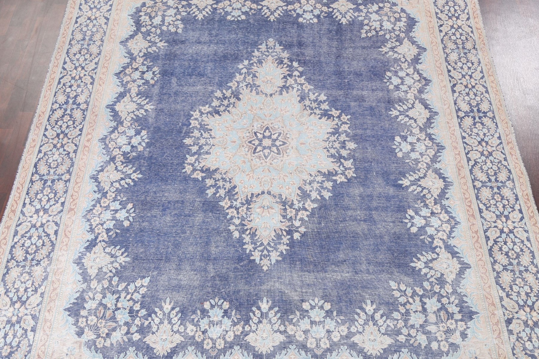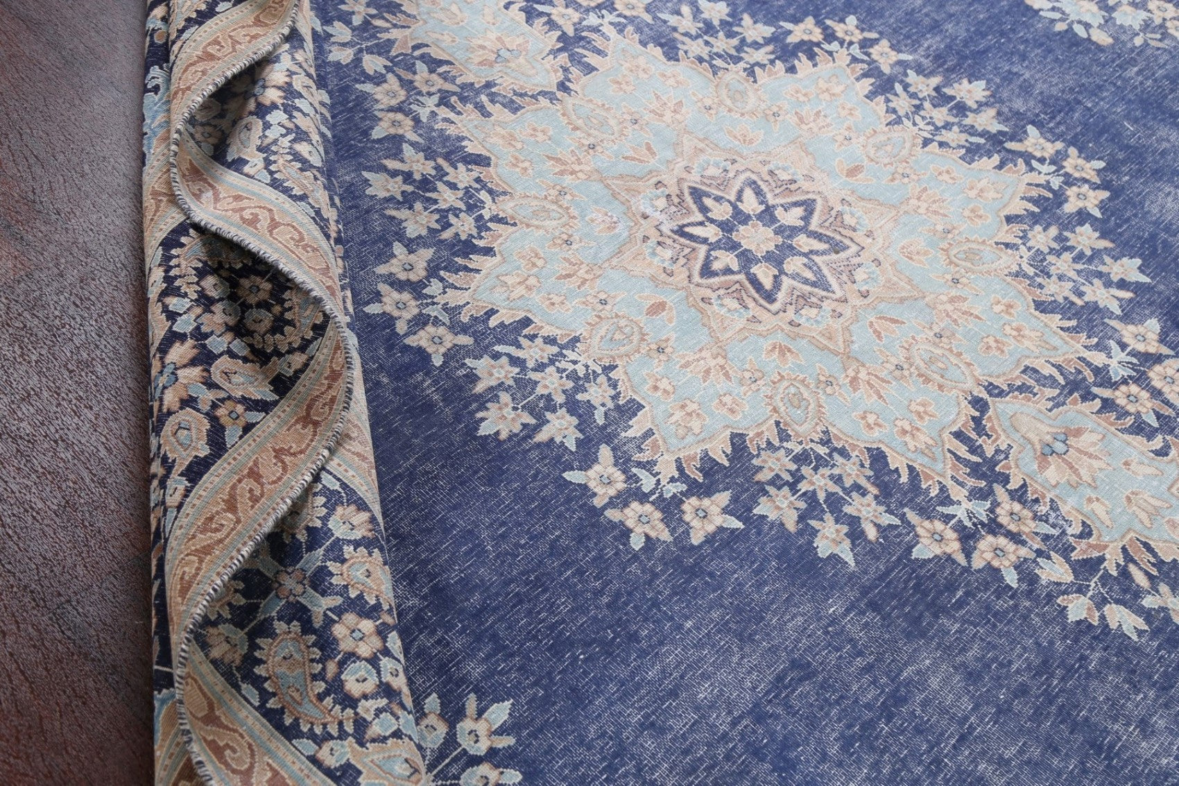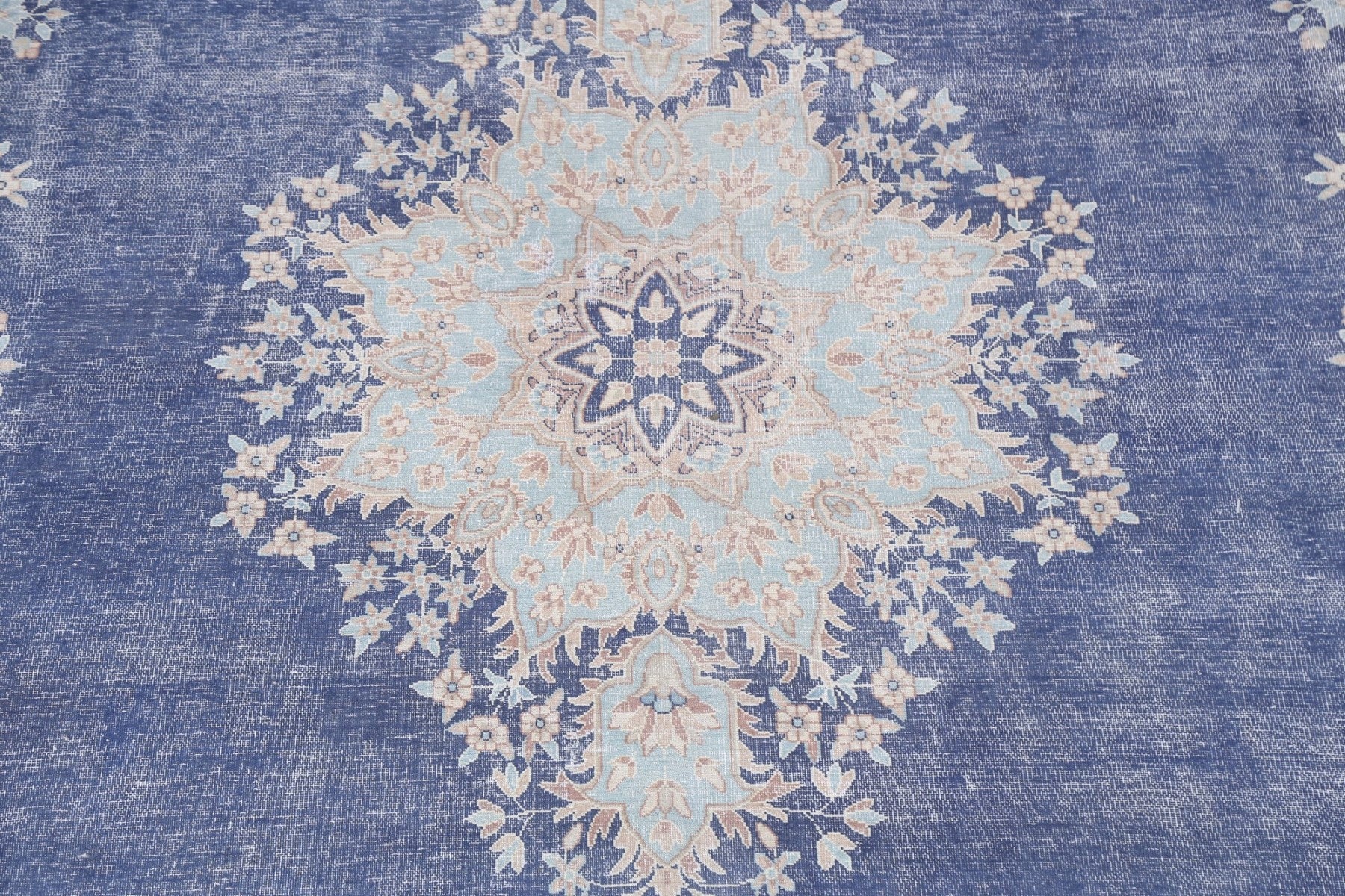 A Beautiful Genuine Persia ( Persia ) Kerman rug is Hand Knotted by skillful weavers in Persia ( Persia ) with 100% Wool Material. This rug is in Very Good (Evenly Low Pile) condition. dimensions are 12' 8'' X 9' 9'' in foot and 386 X 297 in centimeter. the primary color is Navy Blue & Blues.