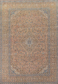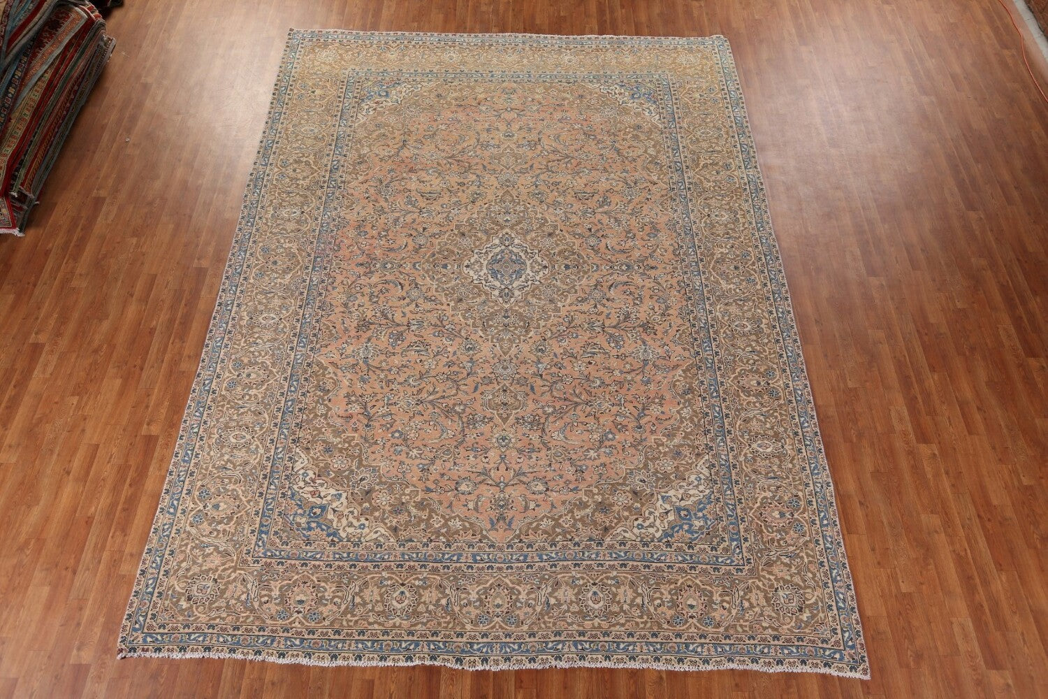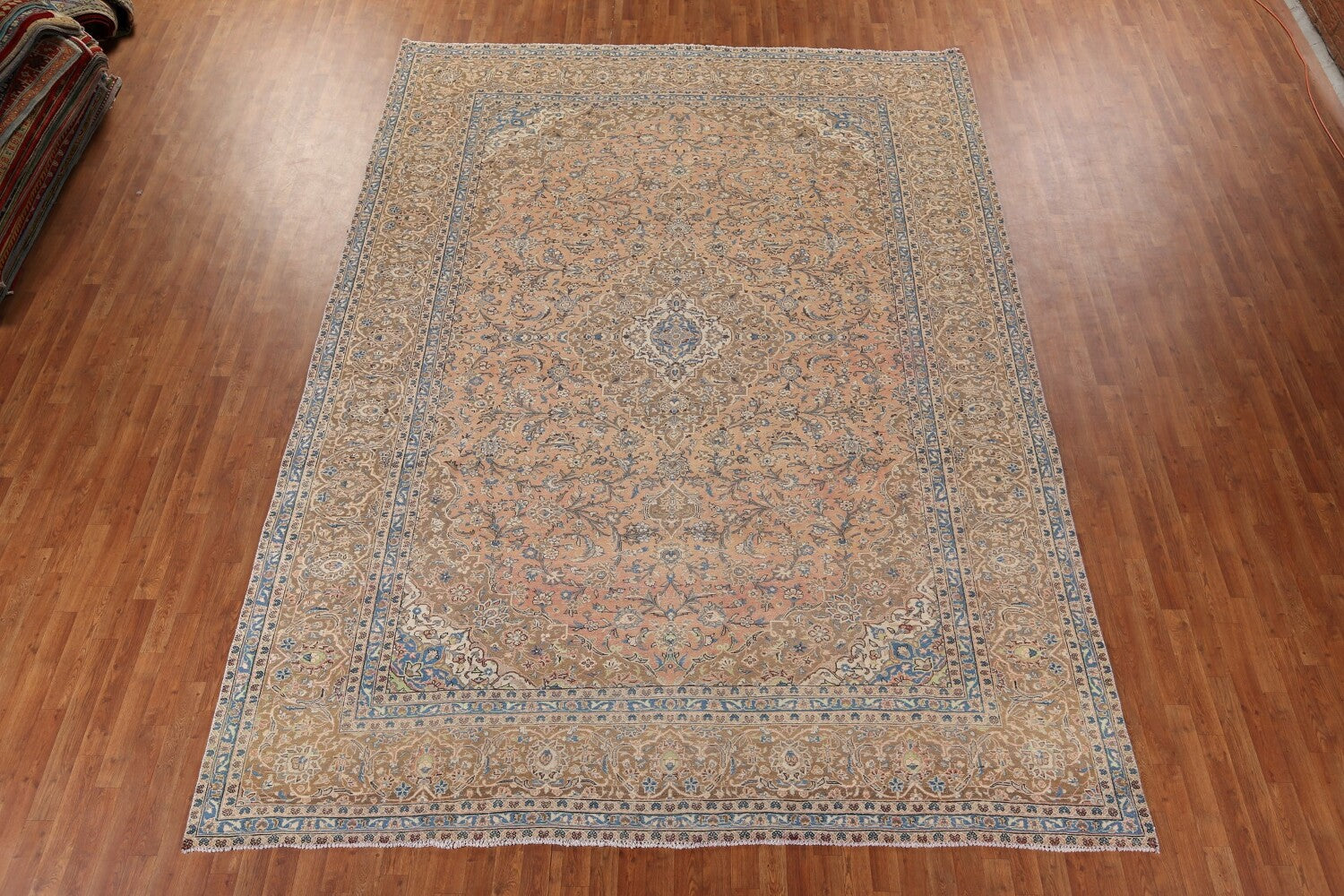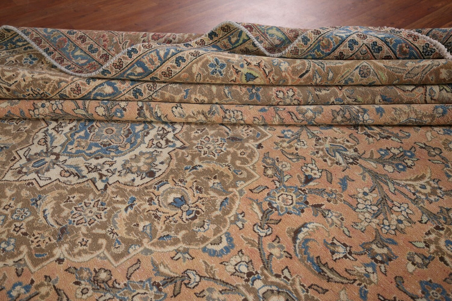 A Beautiful Genuine Persia ( Persia ) Kashan rug is Hand Knotted by skillful weavers in Persia ( Persia ) with 100% Wool Material. This rug is in Very Good (Evenly Low Pile) condition. dimensions are 13' 4'' X 9' 7'' in foot and 406 X 292 in centimeter. the primary color is Peach.