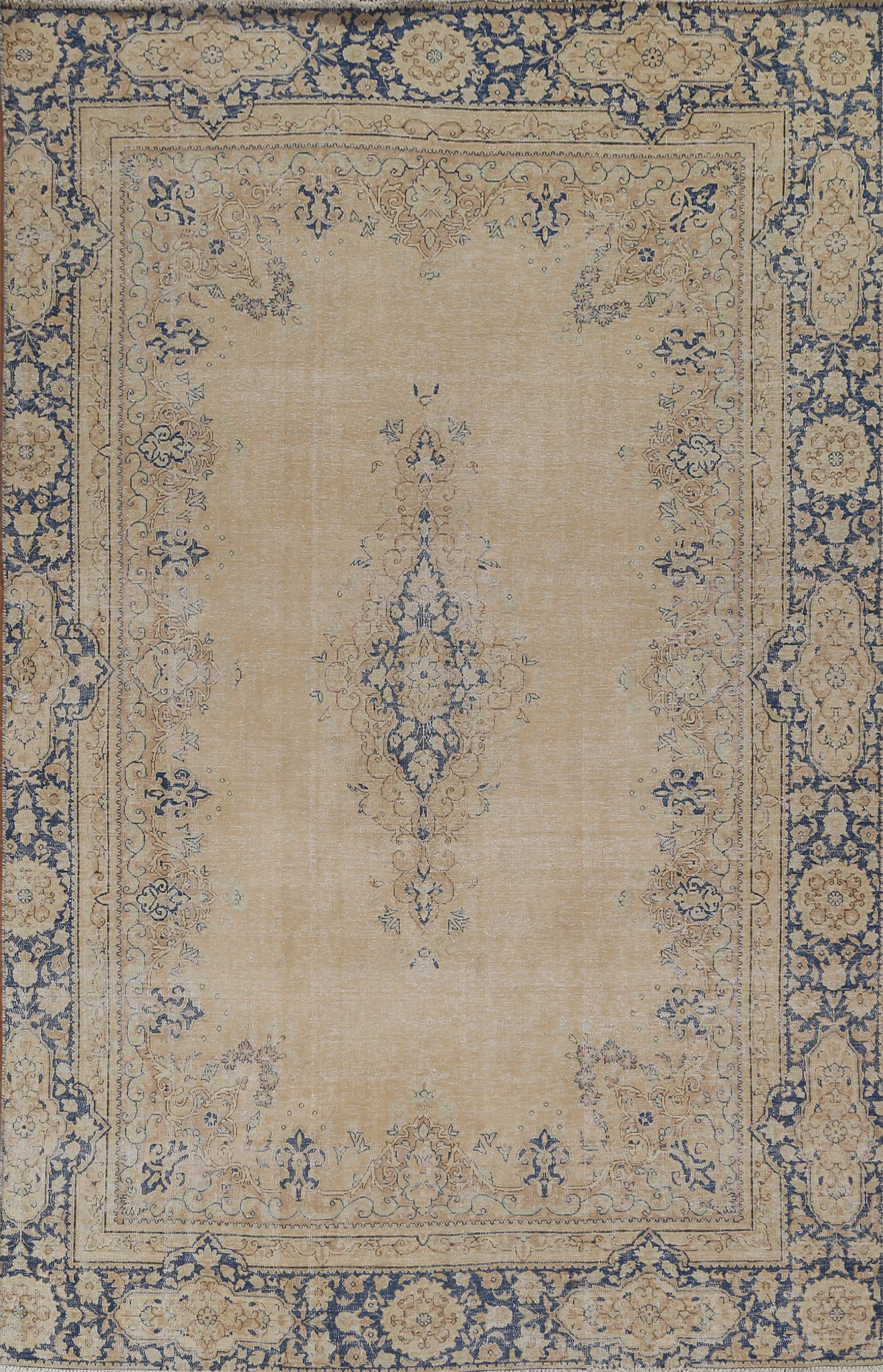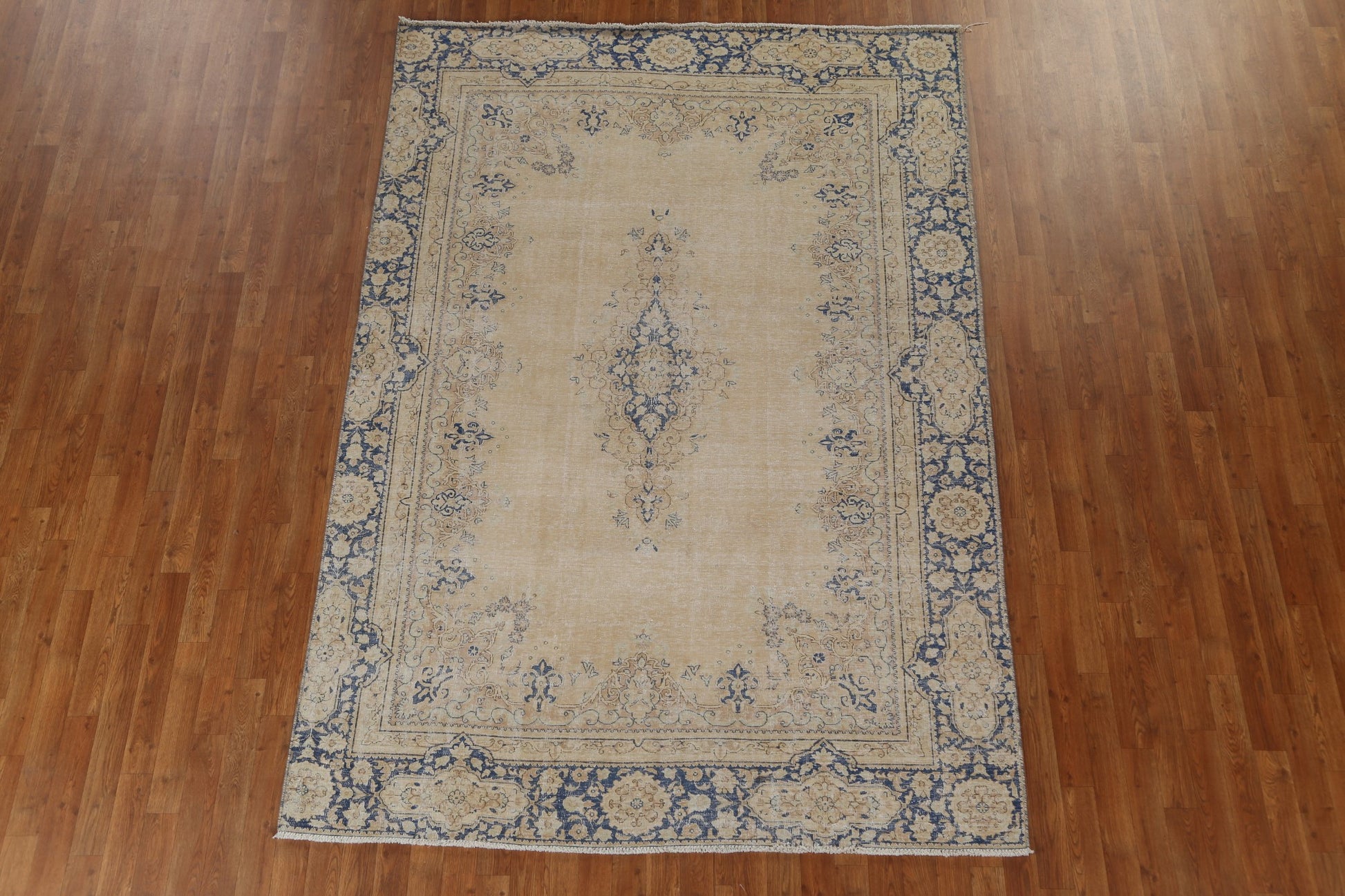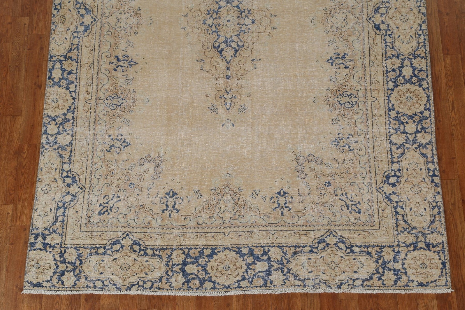 A Beautiful Genuine Persia ( Persia ) Kerman rug is Hand Knotted by skillful weavers in Persia ( Persia ) with 100% Wool Material. This rug is in Very Good (Evenly Low Pile) condition. dimensions are 9' 1'' X 6' 2'' in foot and 277 X 188 in centimeter. the primary color is Beige & Ivories.
