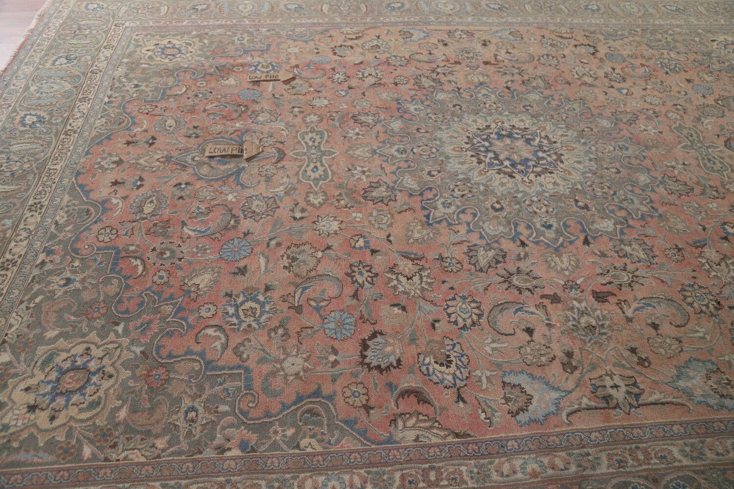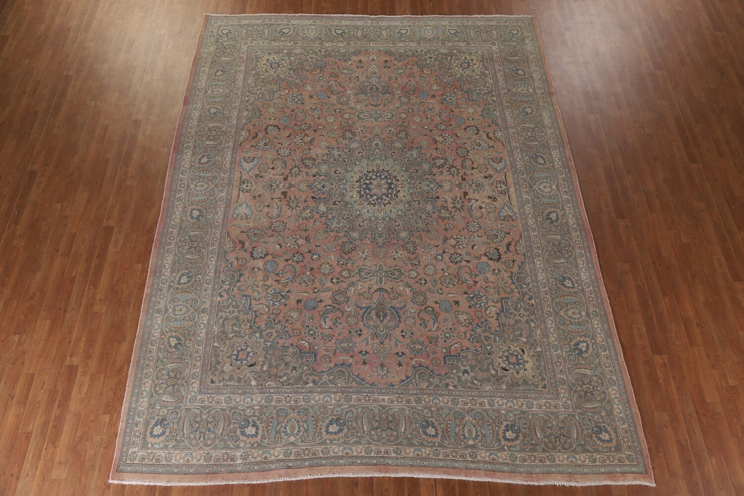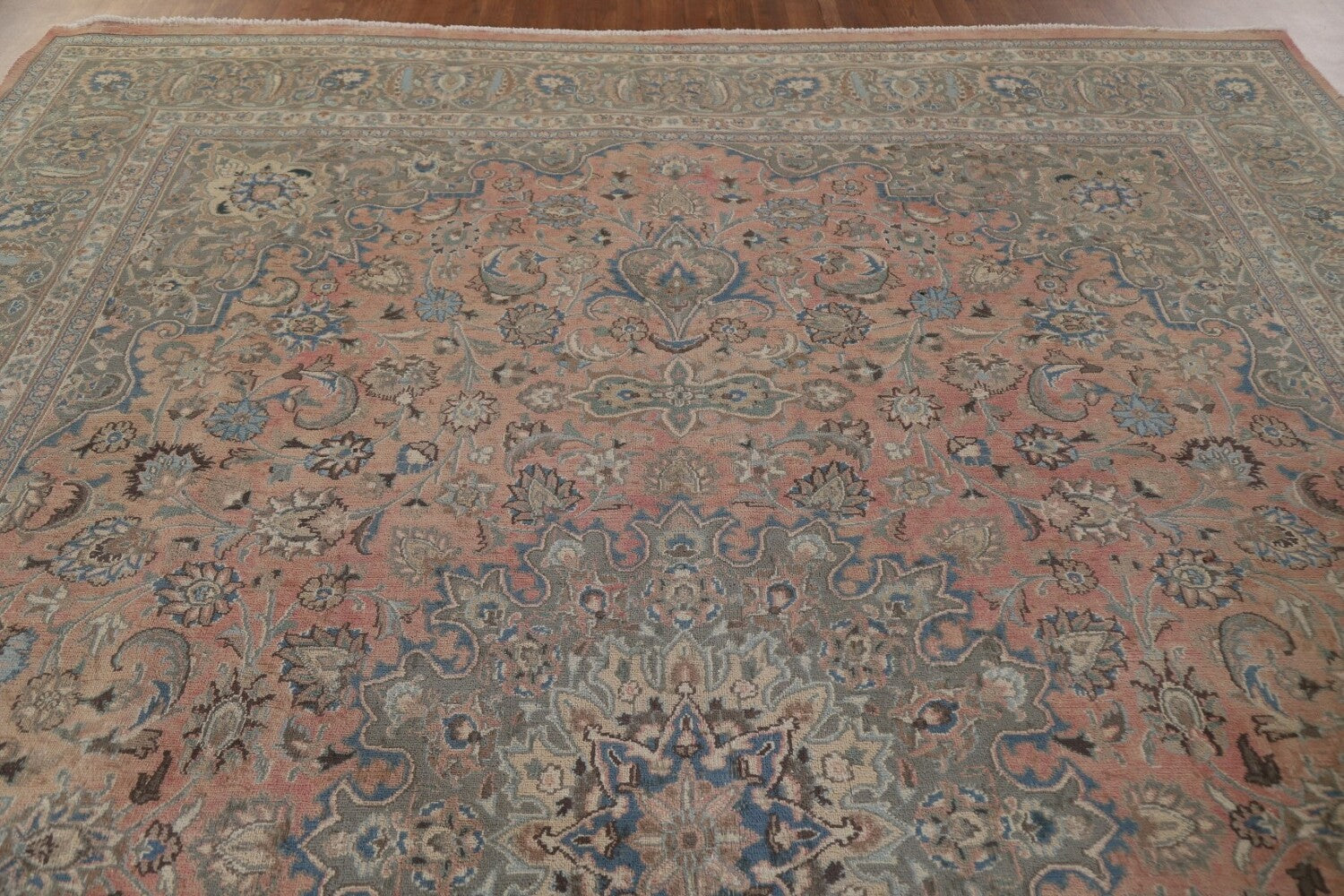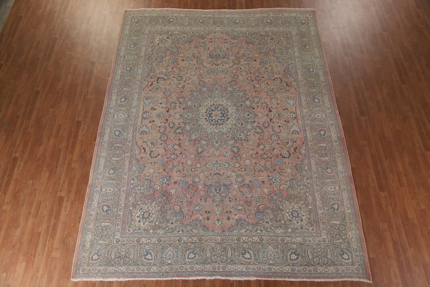 A Beautiful Genuine Persia ( Persia ) Mashad rug is Hand Knotted by skillful weavers in Persia ( Persia ) with 100% Wool Material. This rug is in Very Good ( Low Pile ) condition. dimensions are 12' 8'' X 9' 9'' in foot and 386 X 297 in centimeter. the primary color is Pink.