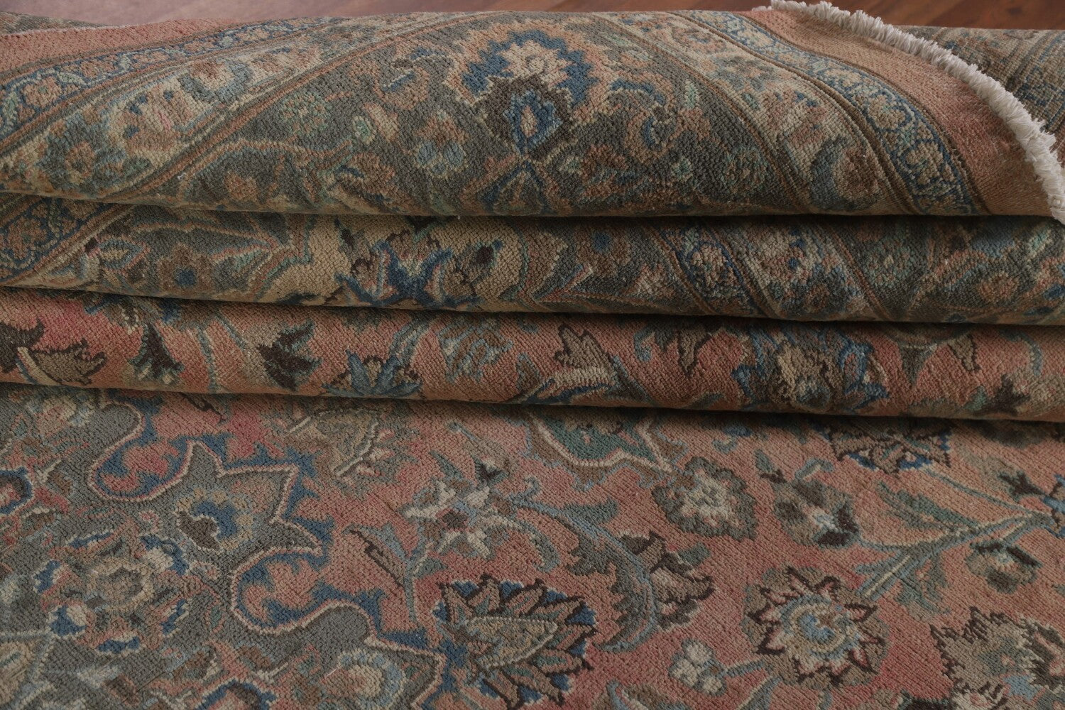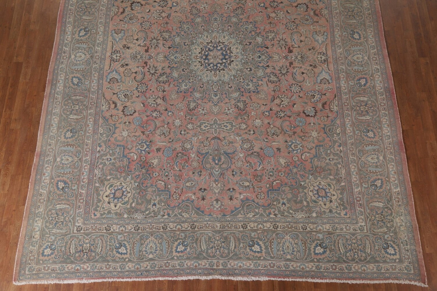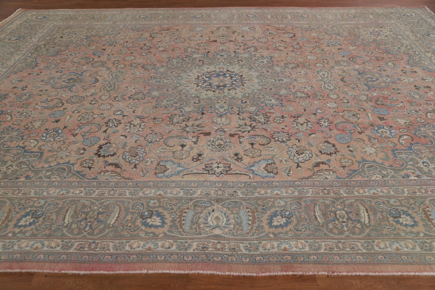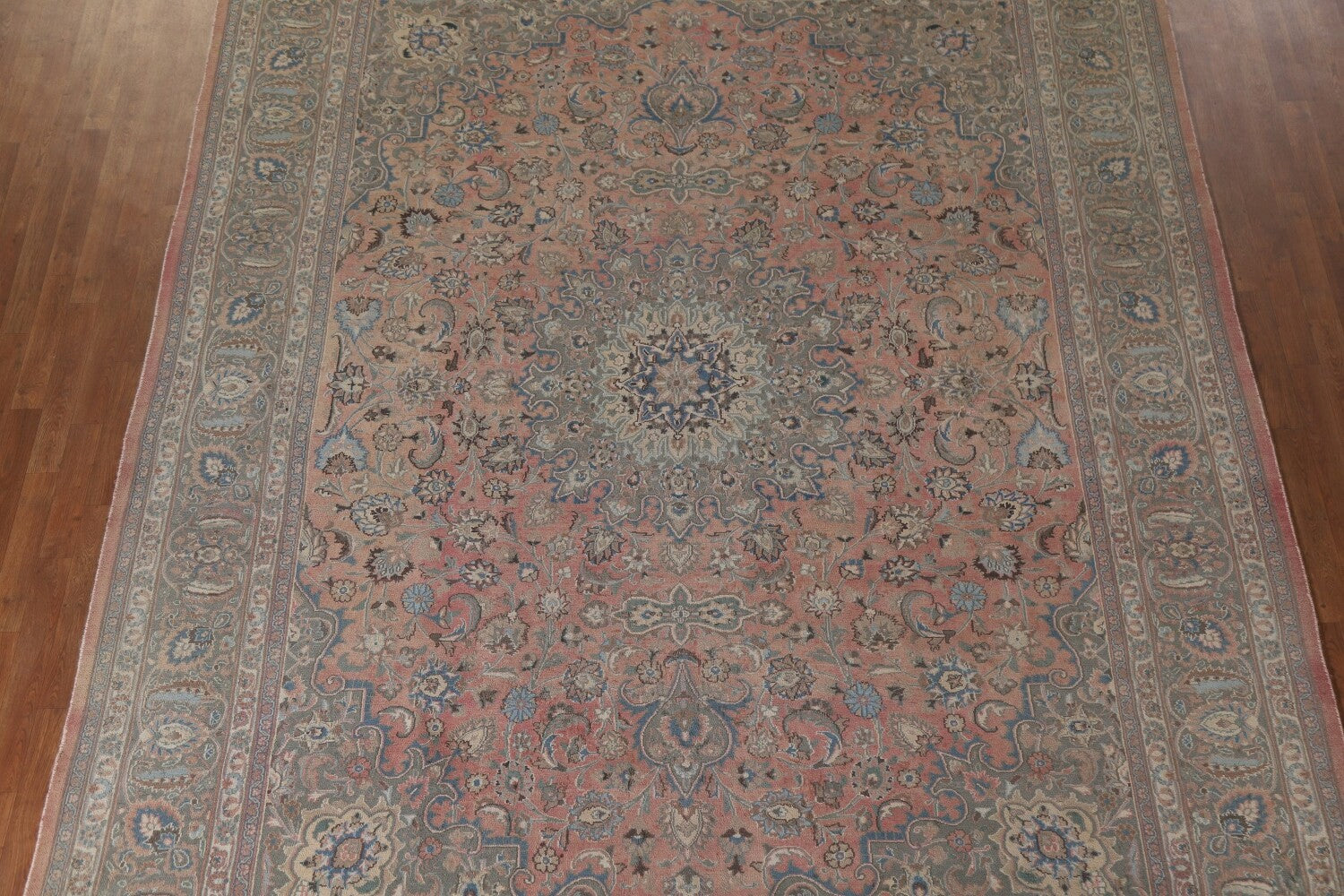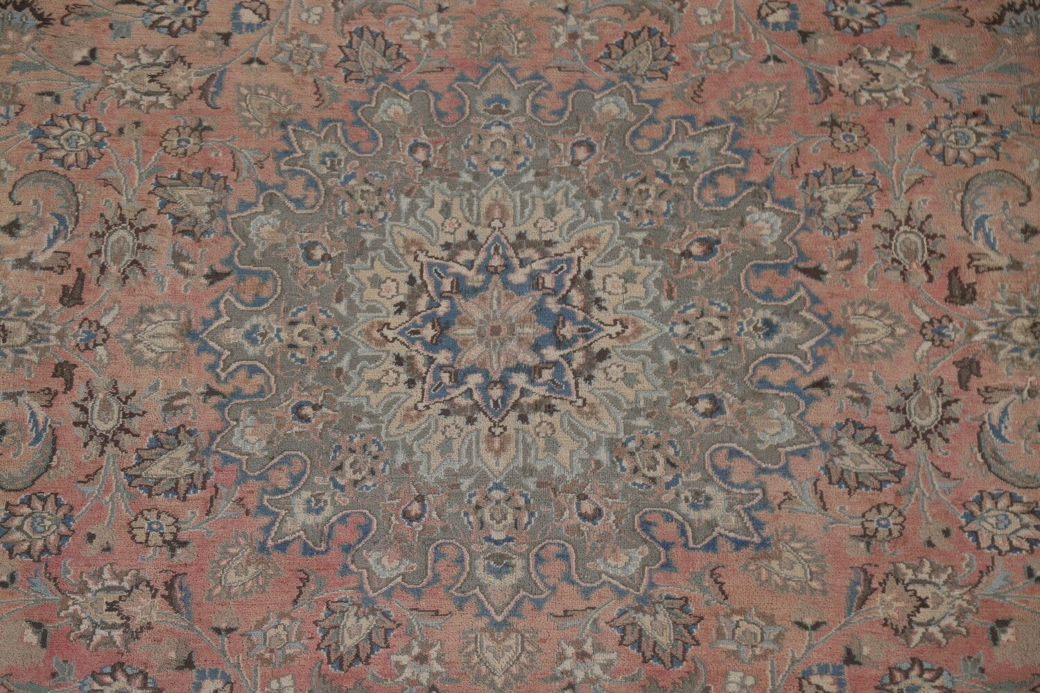 A Beautiful Genuine Persia ( Persia ) Mashad rug is Hand Knotted by skillful weavers in Persia ( Persia ) with 100% Wool Material. This rug is in Very Good ( Low Pile ) condition. dimensions are 12' 8'' X 9' 9'' in foot and 386 X 297 in centimeter. the primary color is Pink.