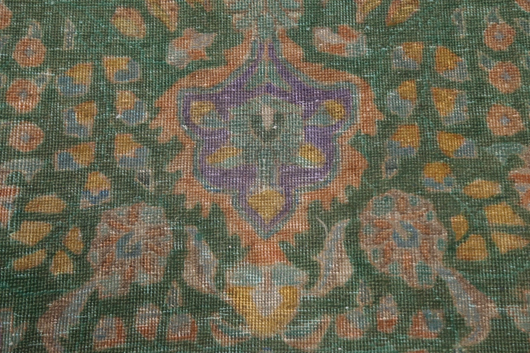 A Beautiful Genuine Persia ( Persia ) Tabriz rug is Hand Knotted by skillful weavers in Persia ( Persia ) with 100% Wool Material. This rug is in Very Good (Evenly Low Pile) condition. dimensions are 11' 4'' X 7' 9'' in foot and 345 X 236 in centimeter. the primary color is Green.