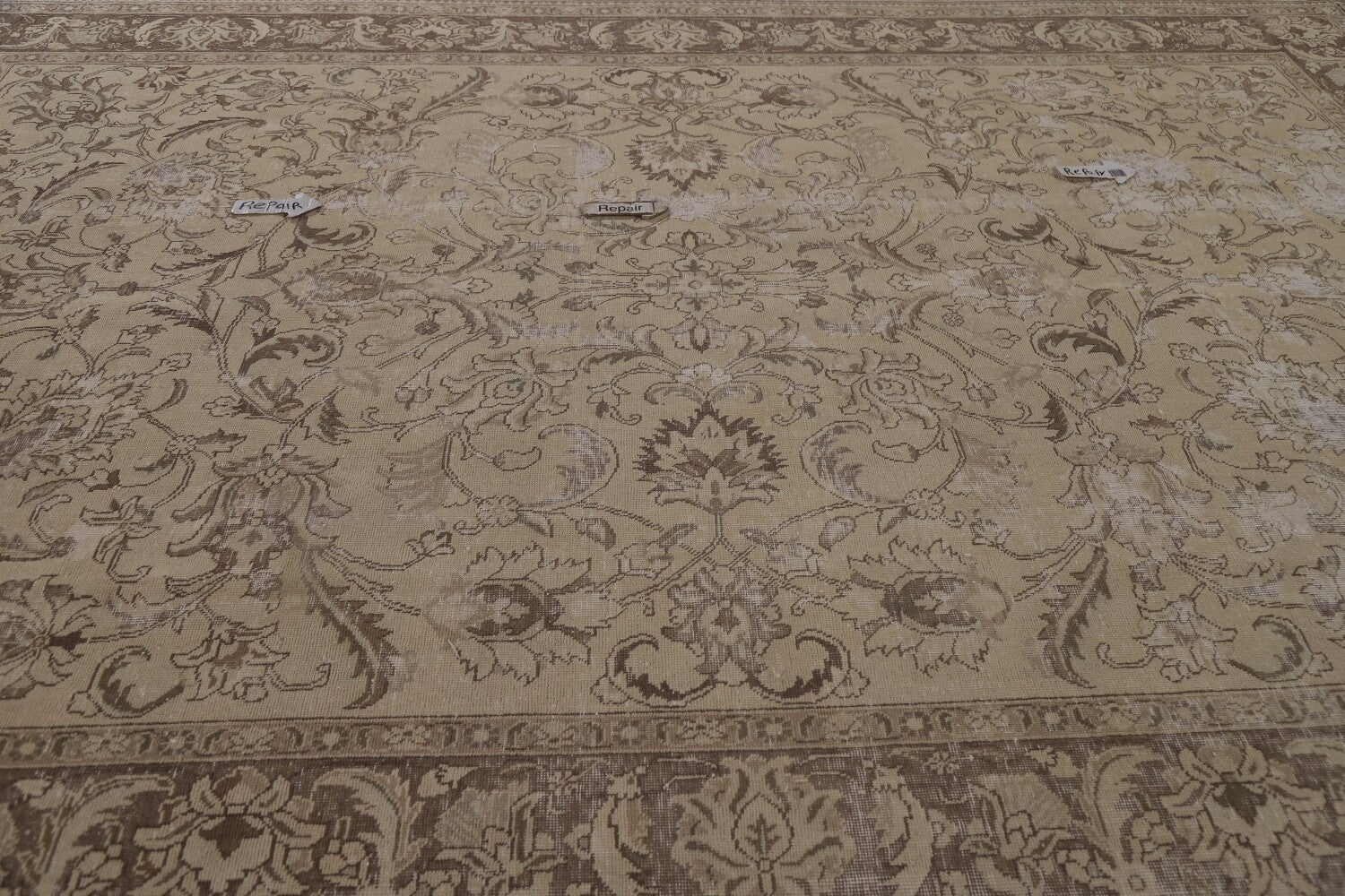 A Beautiful Genuine Persia ( Persia ) Tabriz rug is Hand Knotted by skillful weavers in Persia ( Persia ) with 100% Wool Material. This rug is in Very Good (Evenly Low Pile-Repair) condition. dimensions are 11' 7'' X 8' 1'' in foot and 353 X 246 in centimeter. the primary color is Beige & Ivories.