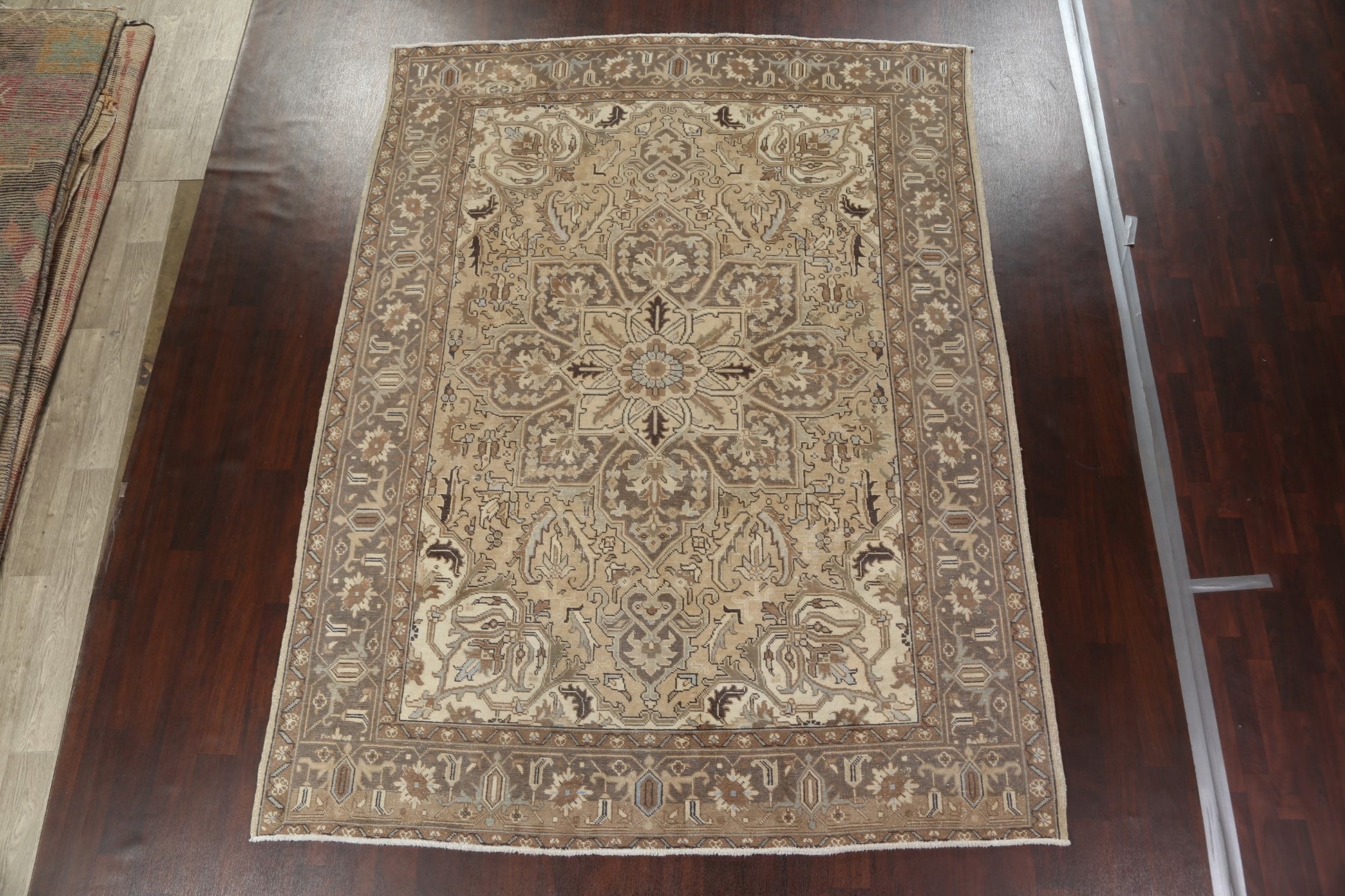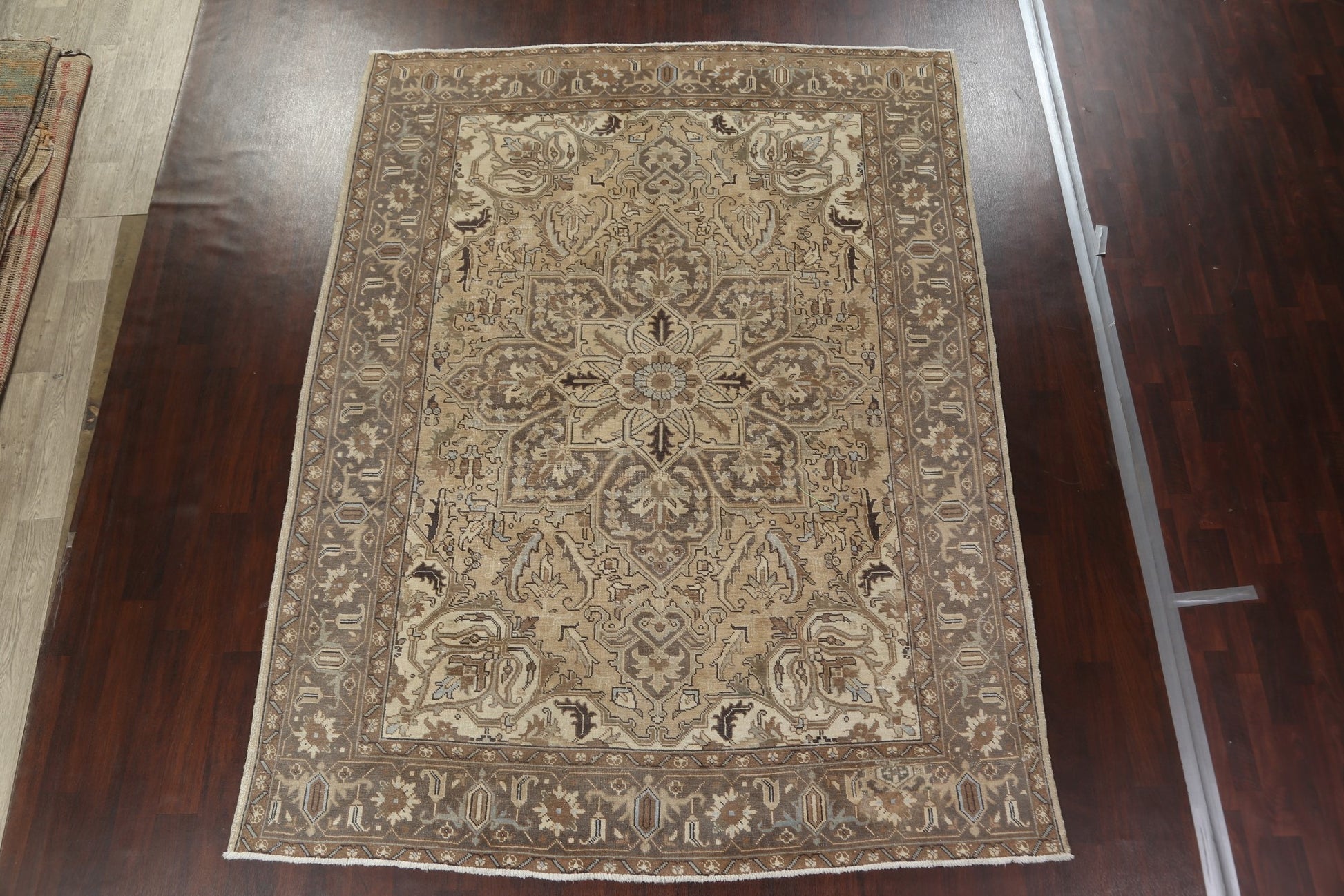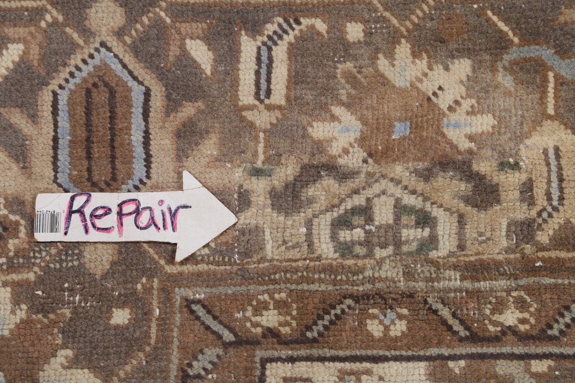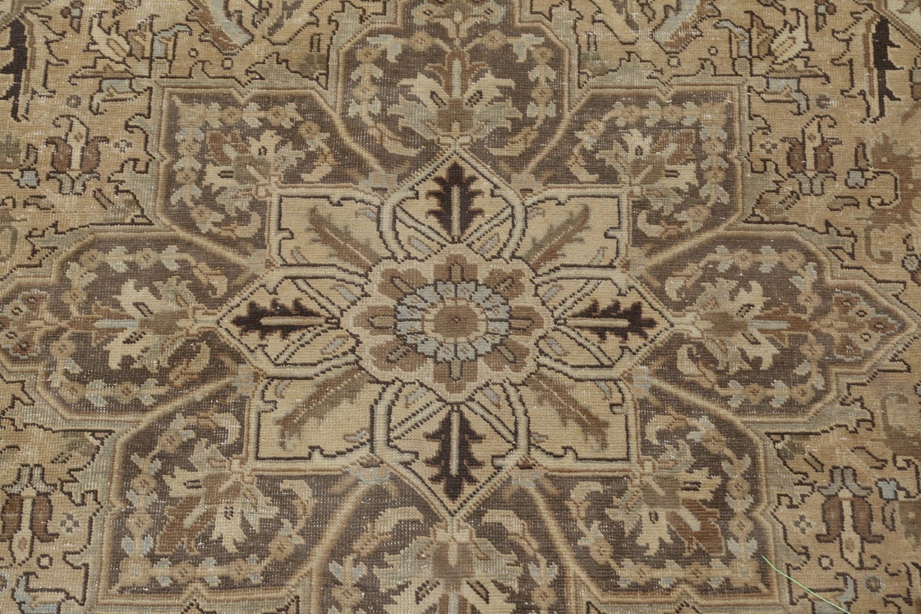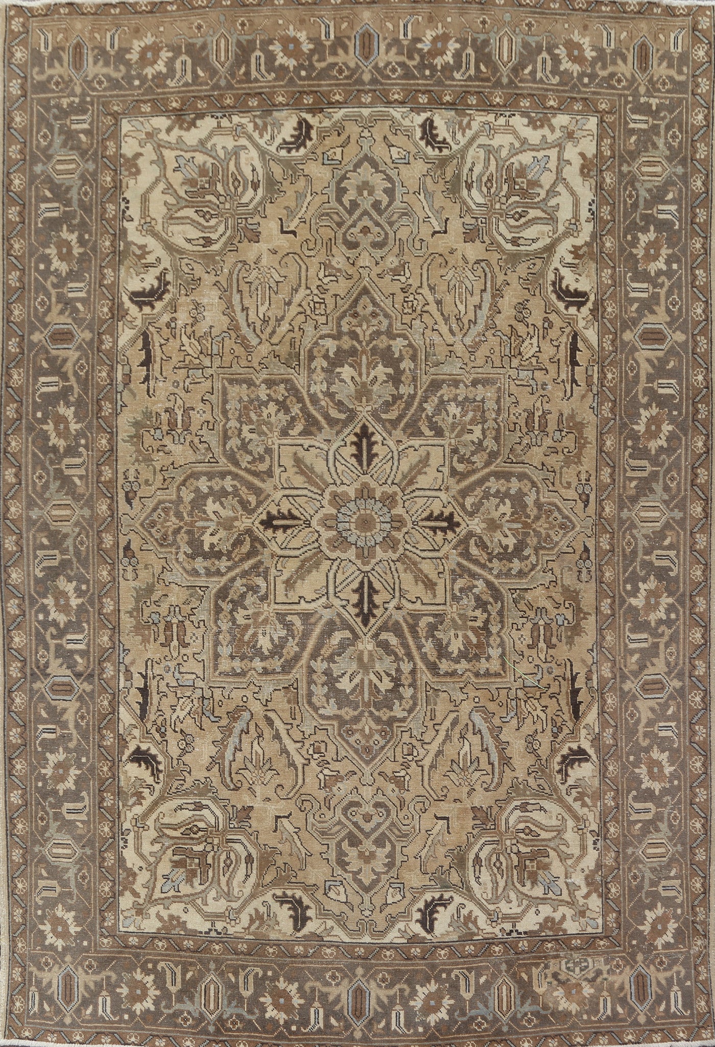 A Beautiful Genuine Persia ( Persia ) Heriz rug is Hand Knotted by skillful weavers in Persia ( Persia ) with 100% Wool Material. This rug is in Very Good (Evenly Low Pile-Repair) condition. dimensions are 11' 0'' X 8' 3'' in foot and 335 X 251 in centimeter. the primary color is Beige & Ivories.