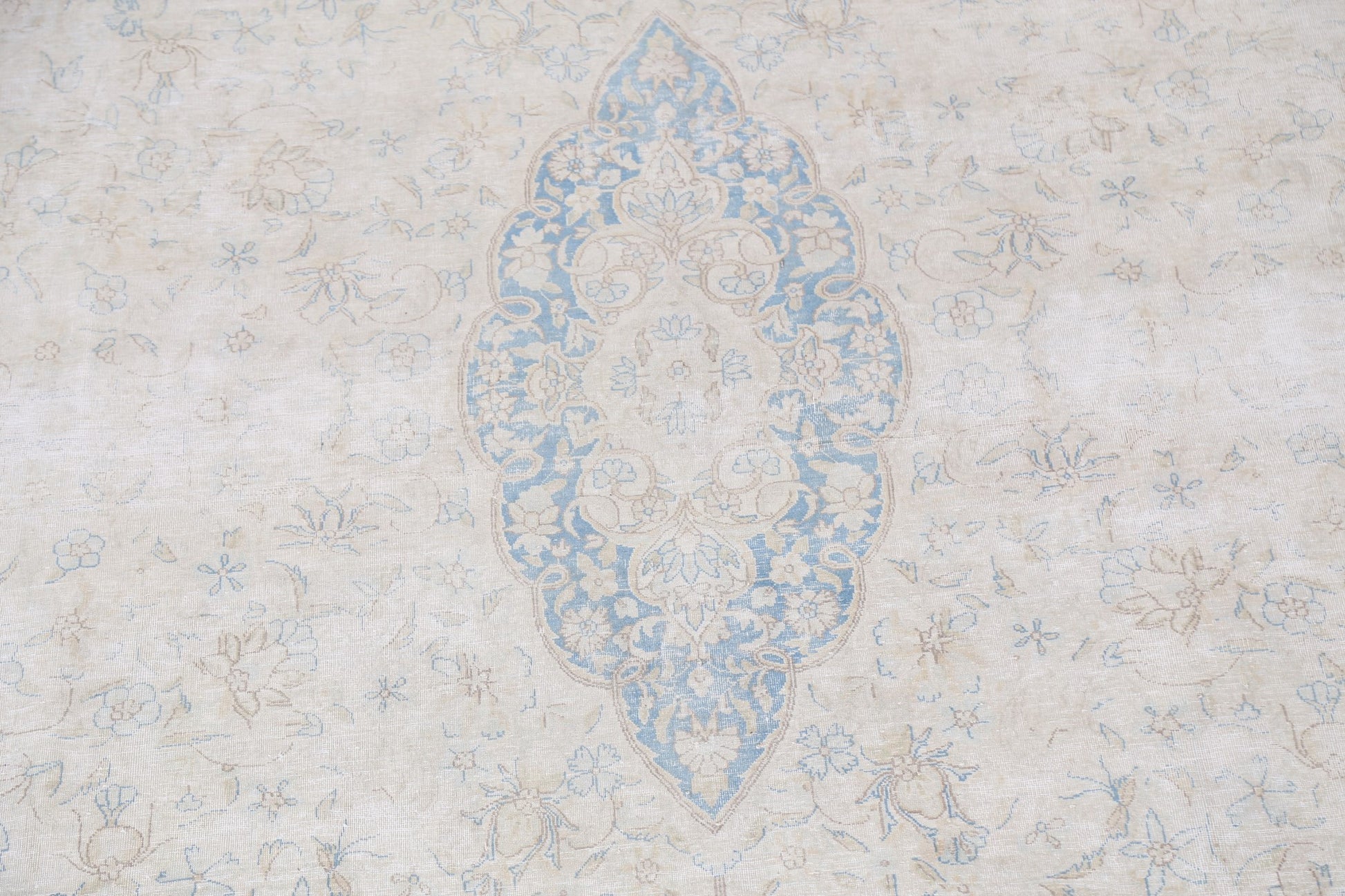 A Beautiful Genuine Persia ( Persia ) Kerman rug is Hand Knotted by skillful weavers in Persia ( Persia ) with 100% Wool Material. This rug is in Very Good (Evenly Low Pile) condition. dimensions are 12' 10'' X 8' 11'' in foot and 391 X 272 in centimeter. the primary color is Beige & Ivories.