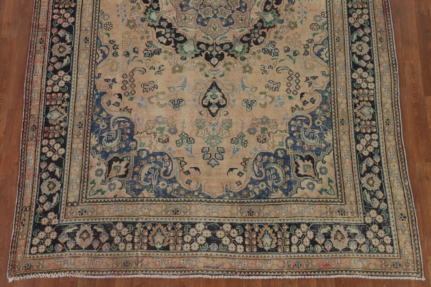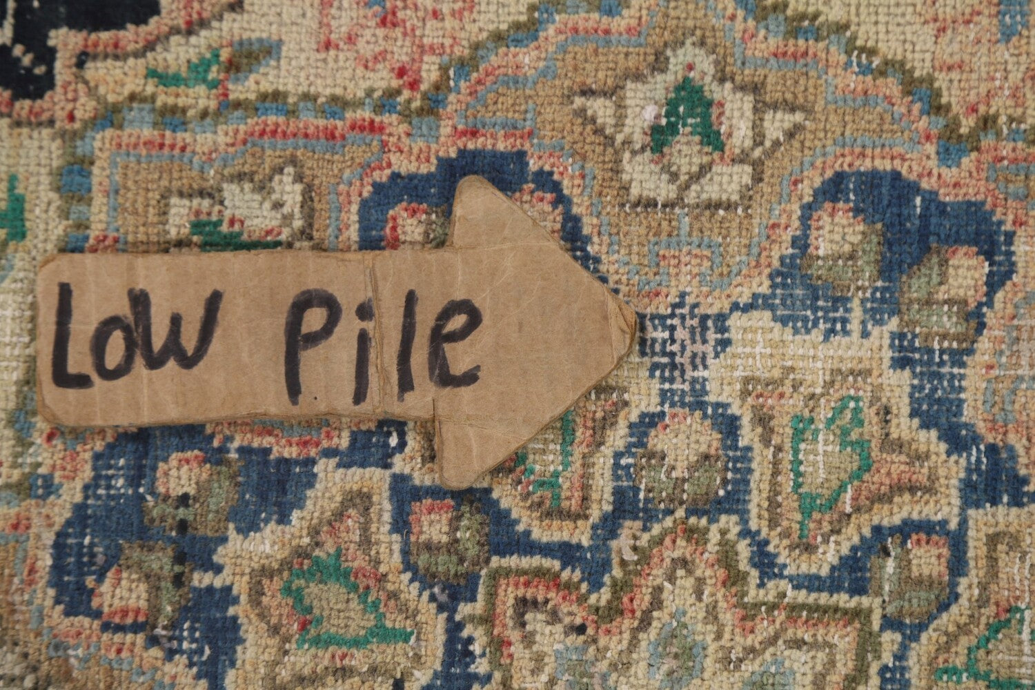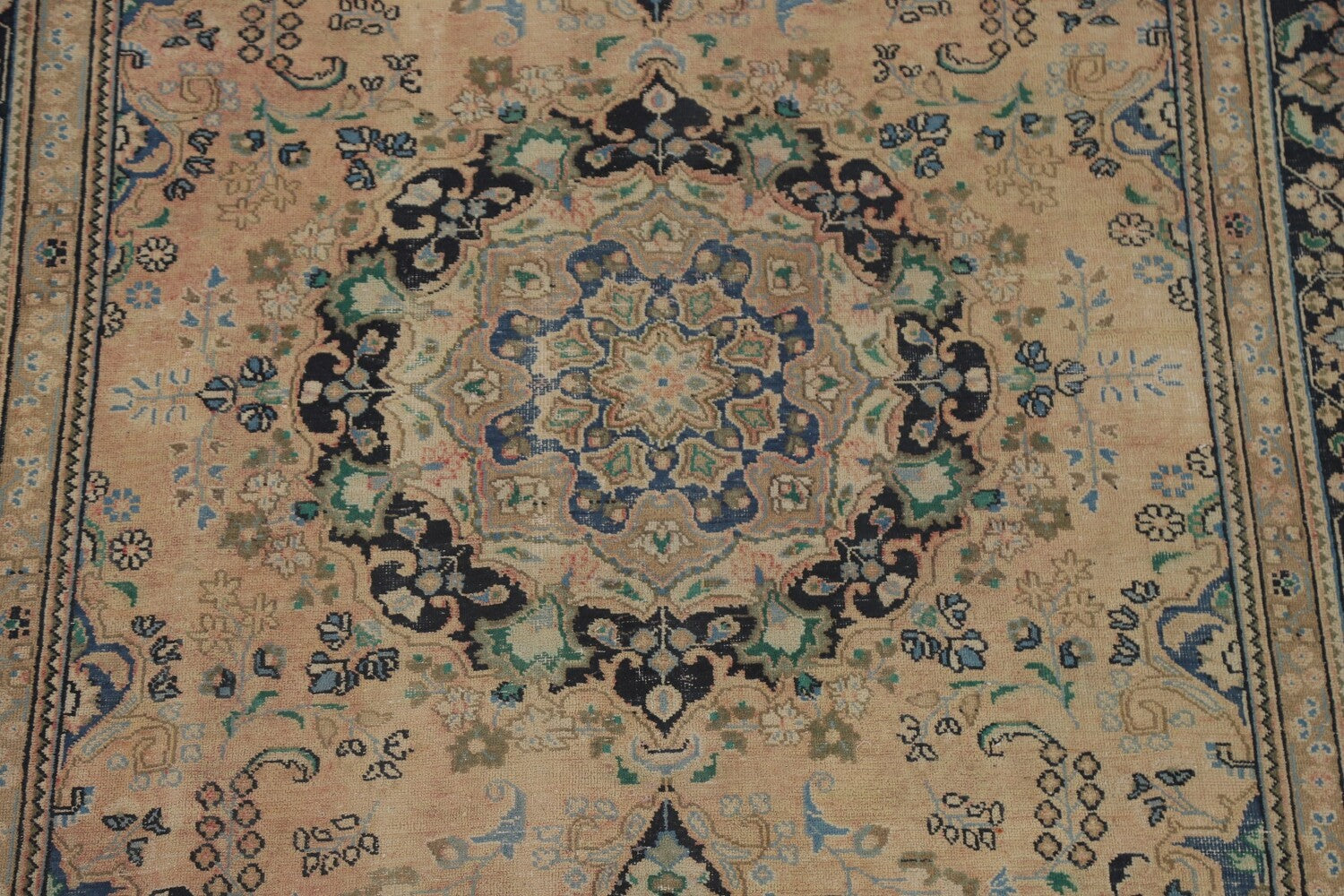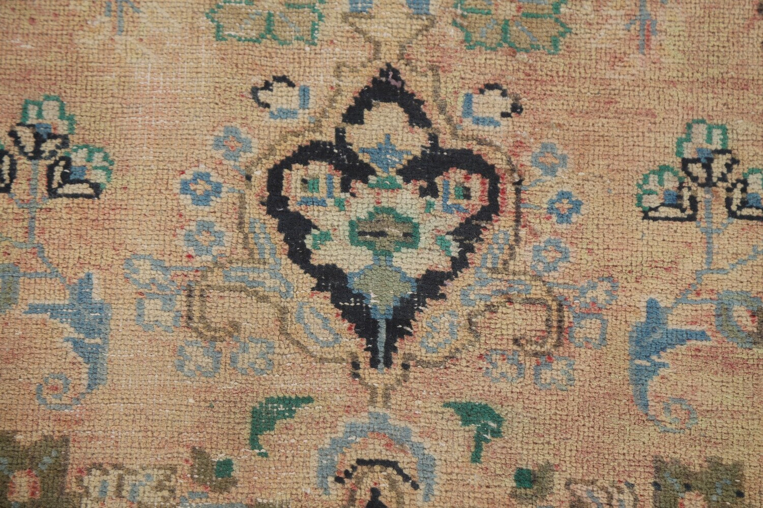 A Beautiful Genuine Persia ( Persia ) Mashad rug is Hand Knotted by skillful weavers in Persia ( Persia ) with 100% Wool Material. This rug is in Very Good (Low Pile-Small Repair) condition. dimensions are 9' 5'' X 6' 2'' in foot and 287 X 188 in centimeter. the primary color is Peach.